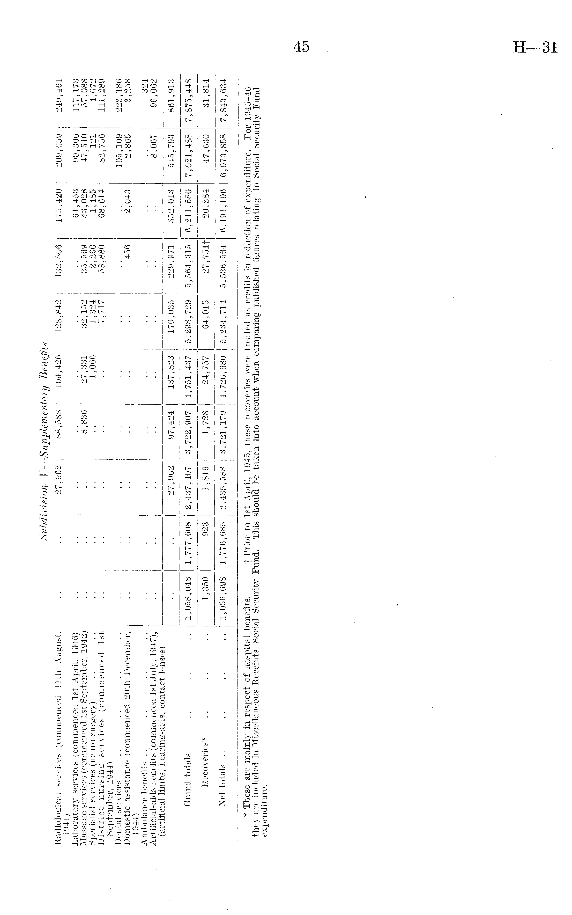 Radiological services (commenced 11th August, 1941) Laboratory services (commenced 1st April, 1946) Massage services (commenced 1st September, 1942) Specialist services (neuro surgery) District nursing services (commenced 1st September, 1944) Dental services Domestic assistance (commenced 20th December, 1944) Ambulance benefits Artificial -aids benefits (commenced 1st July, 1947), (artificial limbs, hearing-aids, contact lenses) Grand totals Recoveries* Net totals Subd ivision V— 27,962 -Supplemen 88,588 8 j 836 lary Benefi 109,426 27 j 331 1,066 ts 128,842 32 |152 1,324 7,717 132,806 35 j 569 2,260 .58,880 ' 456 175,420 61,453 43,028 1,485 68,614 2," 043 209,059 90,306 47,510 121 82,756 105,109 2,865 8^067 249,461 117,173 57,088 4,072 111,289 223,186 3,258 324 96,062 27,962 97,424 137,823 170,035 229,971 352,043 545,793 861,913 1,058,048 1,777,608 2,437,407 3,722,907 4,751,437 5,298,729 5,564,315 6,211,580 7,021,488 7,875,448 1,350 923 1,819 1,728 24,757 64,015 27,751t 20,384 47,630 31,814 1,056,698 1,776,685 2,435,588 3,721,179 4,726,680 5,234,714 5,536,564 6,191,196 6,973,858 7,843,634 * These are mainly in respect of hospital benefits. f Prior to 1st April, 1945, these recoveries were treated as credits in reduction of expenditure. For 1945-46 they are included in Miscellaneous Receipts, Social- Security Fund. This should be taken into account when comparing published figures relating to Social Security Fund expenditure.