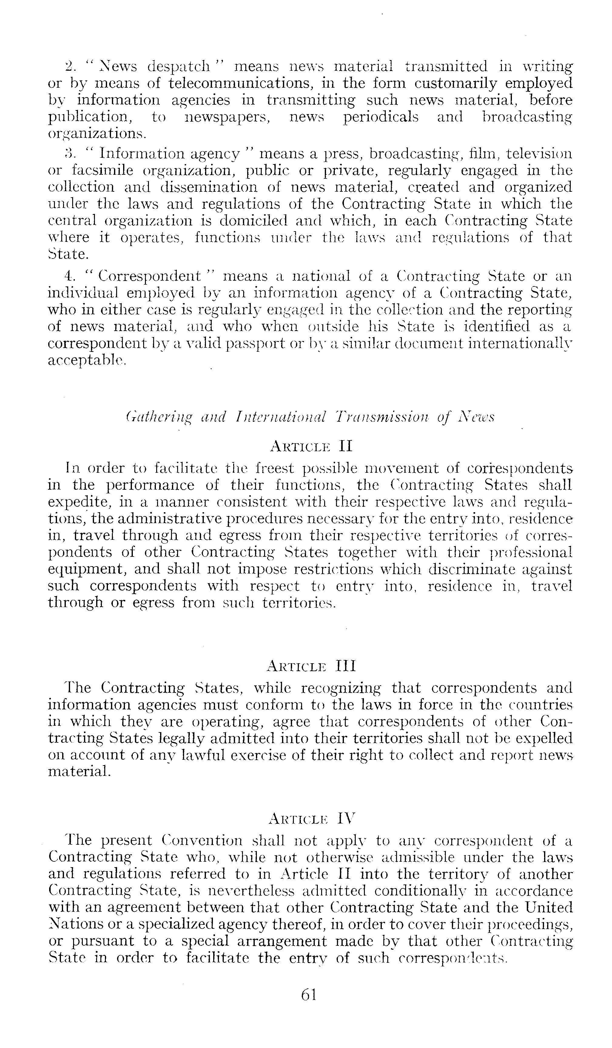 2. " News despatch " means news material transmitted in writing or by means of telecommunications, in the form customarily employed by information agencies in transmitting such news material, before publication, to newspapers, news periodicals and broadcasting organizations. 3. " Information agency " means a press, broadcasting, film, television or facsimile organization, public or private, regularly engaged in the collection and dissemination of news material, created and organized under the laws and regulations of the Contracting State in which the central organization is domiciled and which, in each Contracting State where it operates, functions under the laws and regulations of that State. 4. " Correspondent " means a national of a Contracting State or an individual employed by an information agency of a Contracting State, who in either case is regularly engaged in the collection and the reporting of news material, and who when outside his State is identified as a correspondent by a valid passport or by a similar document internationally acceptable. Gathering and International Transmission of News Article II In order to facilitate the freest possible movement of correspondents in the performance of their functions, the Contracting States shall expedite, in a manner consistent' with their respective laws and regulations, the administrative procedures necessary for the entry into, residence in, travel through and egress from their respective territories of correspondents of other Contracting States together with their professional equipment, and shall not impose restrictions which discriminate against such correspondents with respect to entry into, residence in, travel through or egress from such territories. Article 111 The Contracting States, while recognizing that correspondents and information agencies must conform to the laws in force in the countries in which they are operating, agree that correspondents of other Contracting States legally admitted into their territories shall not be expelled on account of any lawful exercise of their right to collect and report news material. Article IV x The present Convention shall not apply to any correspondent of a Contracting State who, while not otherwise admissible under the laws and regulations referred to in Article II into the territory of another Contracting State, is nevertheless admitted conditionally in accordance with an agreement between that other Contracting State and the United Nations or a specialized agency thereof, in order to cover their proceedings, or pursuant to a special arrangement made by that other Contracting State in order to facilitate the entry of such correspondents.