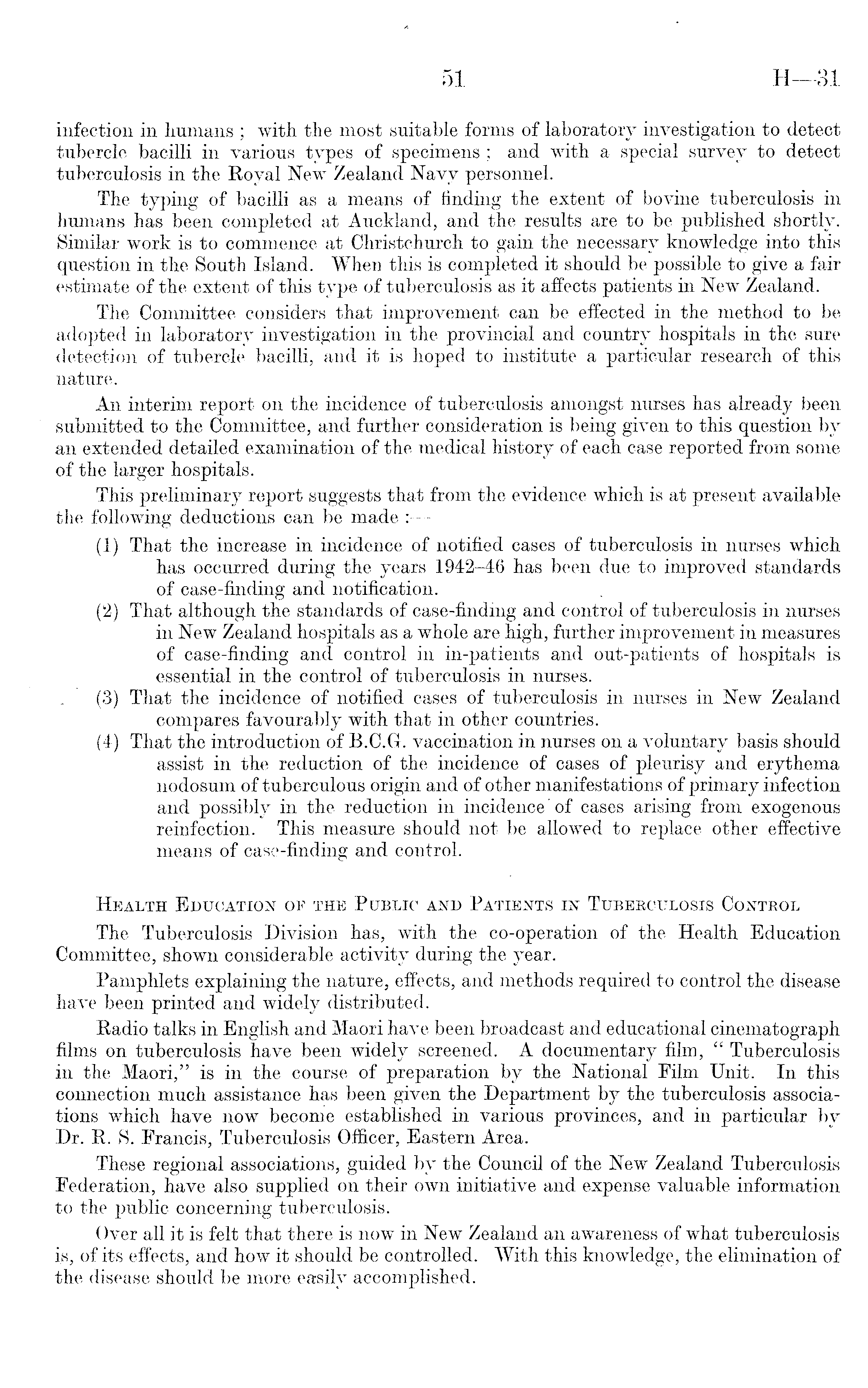 infection in humans ; with the most suitable forms of laboratory investigation to detect tubercle bacilli in various types of specimens ; and with a special survey to detect tuberculosis in the Royal New Zealand Navy personnel. The typing of bacilli as a means of finding the extent of bovine tuberculosis in humans has been completed at Auckland, and the results are to be published shortly. Similar work is to commence at Christchurch to gain the necessary .knowledge into this question in the South Island. When this is completed it should be possible to give a fair estimate of the extent of this type of tuberculosis as it affects patients in New Zealand. The Committee considers that improvement can be effected in the method to be adopted in laboratory investigation in the provincial and country hospitals in the sure detection of tubercle bacilli, and it is hoped to institute a particular research of this nature. An interim report on the incidence of tuberculosis amongst nurses has already been submitted to the Committee, and further consideration is being given to this question by an extended detailed examination of the medical history of each case reported from some of the larger hospitals. This preliminary report suggests that from the evidence which is at present available the following deductions can be made : (1) That the increase in incidence of notified cases of tuberculosis in nurses which has occurred during the years 1942-46 has been due to improved standards of case-finding and notification. (2) That although the standards of case-finding and control of tuberculosis in nurses in New Zealand hospitals as a whole are high, further improvement in measures of case-finding and control in in-patients and out-patients of hospitals is essential in the control of tuberculosis in nurses. (3) That the incidence of notified cases of tuberculosis in nurses in New Zealand compares favourably with that in other countries. (4) That the introduction of B.C.Gr. vaccination in nurses on a voluntary basis should assist in the reduction of the incidence of cases of pleurisy and erythema nodosum of tuberculous origin and of other manifestations of primary infection and possibly in the reduction in incidence'of cases arising from exogenous reinfection. This measure should not be allowed to replace other effective means of case-finding and control. Health Education of the Public and Patients in Tuberculosis Control The Tuberculosis Division has, with the co-operation of the Health Education Committee, shown considerable activity during the year. Pamphlets explaining the nature, effects, and methods required to control the disease have been printed and widely distributed. Radio talks in English and Maori have been broadcast and educational cinematograph films on tuberculosis have been widely screened. A documentary film, " Tuberculosis in the Maori," is in the course of preparation by the National Film Unit. In this connection much assistance has been given the Department by the tuberculosis associations which have now become established in various provinces, and in particular by Dr. R. S. Francis, Tuberculosis Officer, Eastern Area. These regional associations, guided by the Council of the New Zealand Tuberculosis Federation, have also supplied on their own initiative and expense valuable information to the public concerning tuberculosis. Over all it is felt that there is now in New Zealand an awareness of what tuberculosis is, of its effects, and how it should be controlled. With this knowledge, the elimination of the disease should be more easily accomplished.