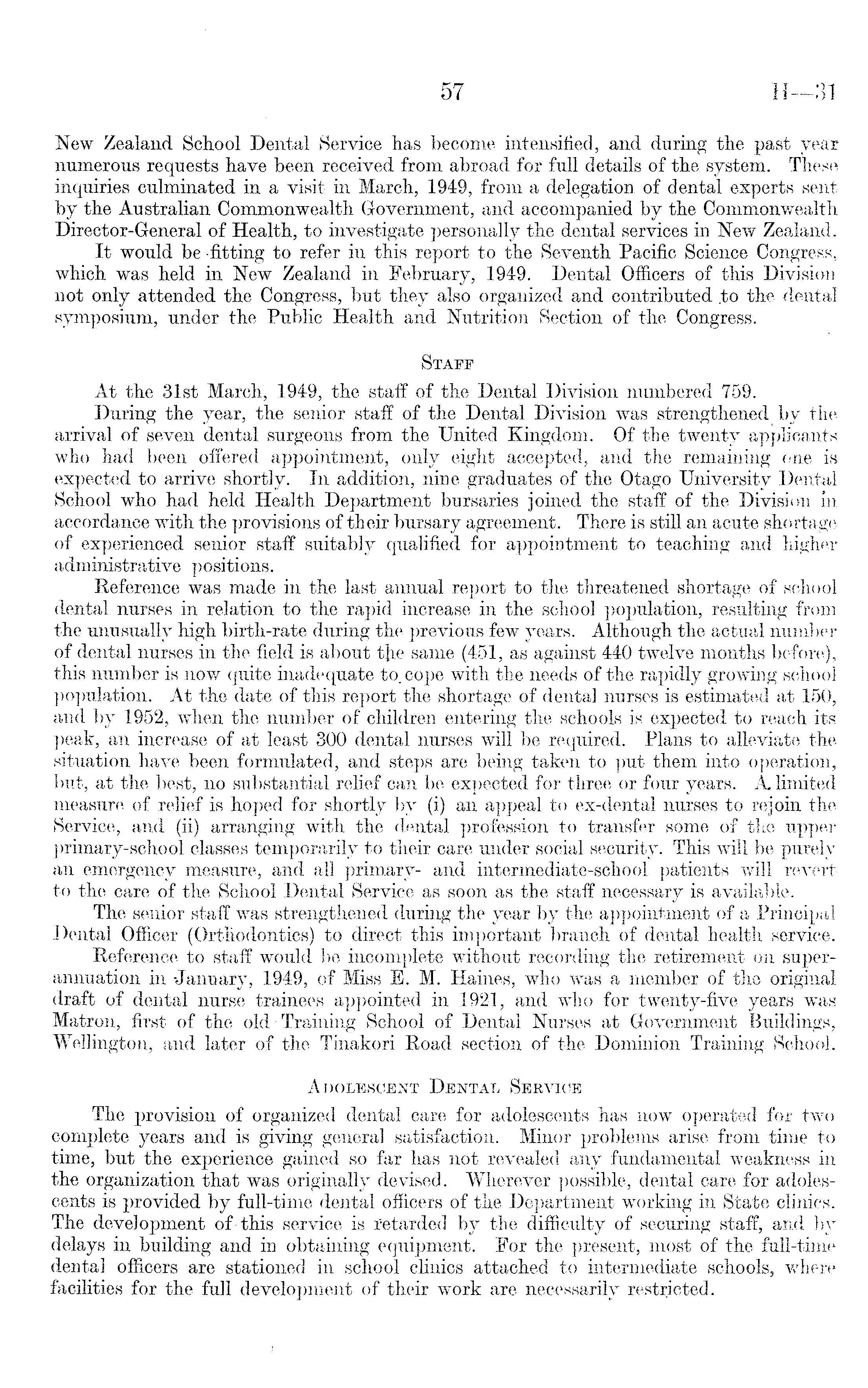 New Zealand School Dental Service has become intensified, and during the past year numerous requests have been received from abroad for full details of the system. These inquiries culminated in a visit in March, 1949, from a delegation of dental experts sent by the Australian Commonwealth Government, and accompanied by the Commonwealth Director-General of Health, to investigate personally the dental services in New Zealand. It would be -fitting to refer in this report to the Seventh Pacific Science Congress, which was held in New Zealand in February, 1949. Dental Officers of this Division not only attended the Congress, but they also organized and contributed .to the dental symposium, under the Public Health and Nutrition Section of the Congress. Staff At the 31st March, 1949, the staff of the Dental Division numbered 759. During the year, the senior staff of the Dental Division was strengthened by the arrival of seven dental surgeons from the United Kingdom. Of the twenty applicants who had been offered appointment, only eight accepted, and the remaining one is expected to arrive shortly. In addition, nine graduates of the Otago University Dental School who had held Health Department bursaries joined the staff of the Division in accordance with the provisions of their bursary agreement. There is still an acute shortage of experienced senior staff suitably qualified for appointment to teaching and higher administrative positions. Reference was made in the last annual report to the threatened shortage of school dental nurses in delation to the rapid increase in the school population, resulting from the unusually high birth-rate during the previous few years. Although the actual number of dental nurses in the field is about tjxe same (451, as against 440 twelve months before), this number is now quite inadequate to. cope with the needs of the rapidly growing school population. At the date of this report the shortage of dental nurses is estimated at 150, and by 1952, when the number of children entering the schools is expected to reach its peak, an increase of at least 300 dental nurses will be required. Plans to alleviate situation have been formulated, and steps are being taken to put them into operation, but, at the best, no substantial relief can be expected for three or four years. A limited measure of relief is hoped for shortly by (i) an appeal to ex-dental nurses to rejoin the Service, and (ii) arranging with the dental profession to transfer some of the upper primary-school classes temporarily to their care under social security. This will be purely an emergency measure, and all primary- and intermediate-school patients will revert to the care of the School Dental Service as soon as the staff necessary is available. The senior staff was strengthened during the year by the appointment of a Principal Dental Officer (Orthodontics) to direct this important branch of dental health service. Reference to staff would be incomplete without recording the retirement on superannuation in -January, 1949, of Miss E. M. Haines, who was a member of the original draft of dental nurse trainees appointed in 1921, and who for twenty-five years was Matron, first of the old-Training School of Dental Nurses at Government Buildings, Wellington, and later of the Tinakori Road section of the Dominion Training . School. Adolescent Dental Service The provision of organized dental care for adolescents has now operated for two complete years and is giving general satisfaction. Minor problems arise from time to time, but the experience gained so far has not revealed any fundamental weakness in the organization that was originally devised. Wherever possible, dental care for adolescents is provided by full-time dental officers of the Department working in State clinics. The development of-this service is retarded by the difficulty of securing staff, and by delays in building and in obtaining equipment. For the present, most of the full-time dental officers are stationed in school clinics attached to intermediate schools, where facilities for the full development of their work are necessarily restricted.