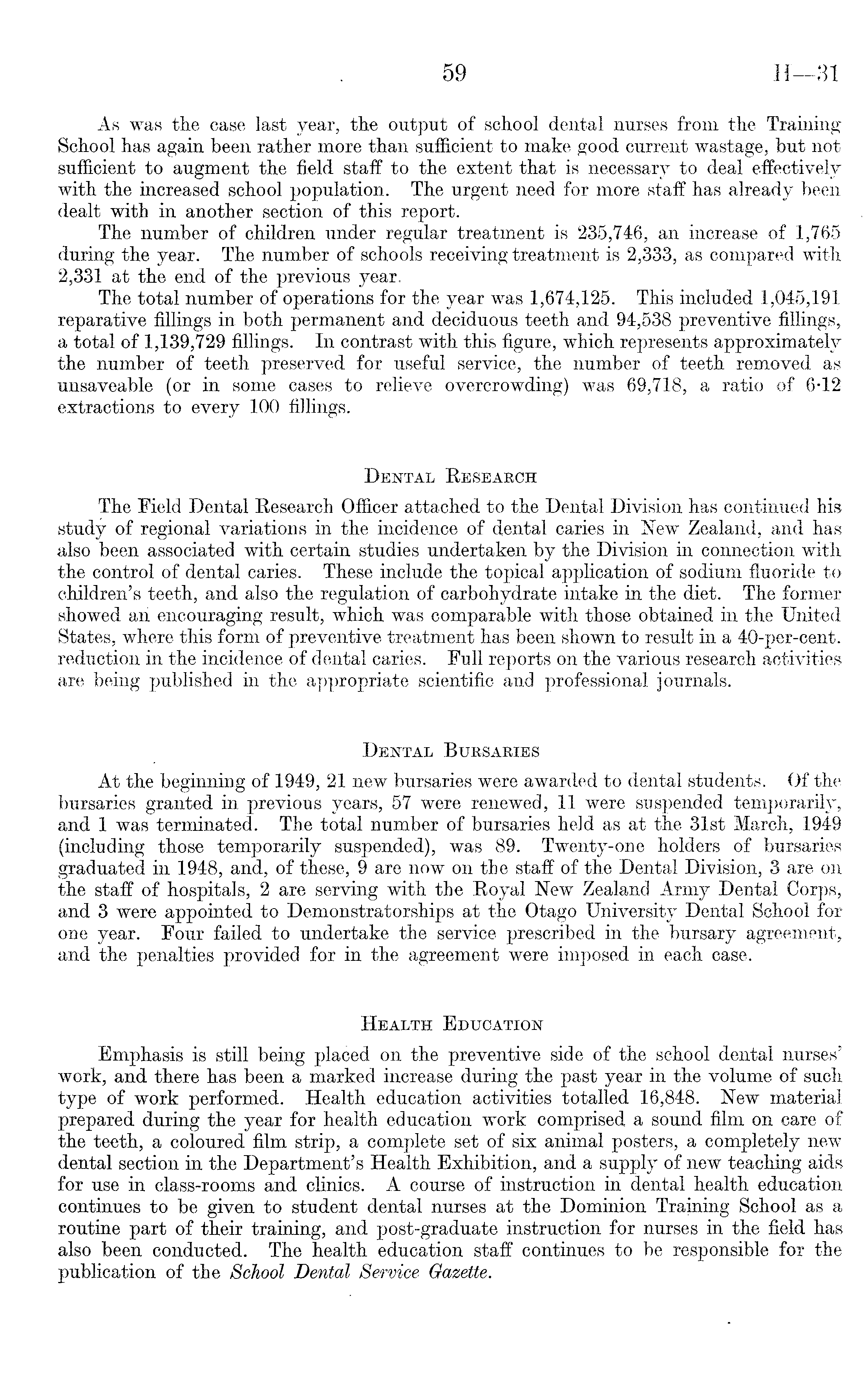 As was the case last year, the output of school dental nurses from the Training School has again been rather more than sufficient to make good current wastage, but not sufficient to augment the field staff to the extent that is necessary to deal effectively with the increased school population. The urgent need for more staff has already been dealt with in another section of this report. The number of children under regular treatment is 235,746, an increase of 1,765 during the year. The number of schools receiving treatment is 2,333, as compared with 2,331 at the end of the previous year. The total number of operations for the year was 1,674,125. This included 1,045,191 reparative fillings in both permanent and deciduous teeth and 94,538 preventive fillings, a total of 1,139,729 fillings. In contrast with this figure, which represents approximately the number of teeth preserved for useful service, the number of teeth removed as unsaveable (or in some cases to relieve overcrowding) was 69,718, a ratio of 6*12 extractions to every 100 fi]lings. Dental Research The Field Dental Research Officer attached to the Dental Division has continued his study of regional variations in the incidence of dental caries in New Zealand, and has also been associated with certain studies undertaken by the Division in connection with the control of dental caries. These include the topical application of sodium fluoride to children's teeth, and also the regulation of carbohydrate intake in the diet. The former showed an encouraging result, which was comparable with those obtained in the United States, where this form of preventive treatment has been shown to result in a 40-per-cent. reduction in the incidence of dental caries. Full reports on the various research activities are being published in the appropriate scientific and professional journals. Dental Bursaries At the beginning of 1949, 21 new bursaries were awarded to dental students. Of the bursaries granted in previous years, 57 were renewed, 11 were suspended temporarily ? and 1 was terminated. The total number of bursaries held as at the 31st March, 1949 (including those temporarily suspended), was 89. Twenty-one holders of bursaries graduated in 1948, and, of these, 9 are now on the staff of the Dental Division, 3 are on the staff of hospitals, 2 are serving with the Royal New Zealand Army Dental Corps, and 3 were appointed to Demonstratorships at the Otago University Dental School for one year. Four failed to undertake the service prescribed in the bursary agreement, and the penalties provided for in the agreement were imposed in each case. Health Education Emphasis is still being placed on the preventive side of the school dental nurses' work, and there has been a marked increase during the past year in the volume of such type of work performed. Health education activities totalled 16,848. New material prepared during the year for health education work comprised a sound film on care of the teeth, a coloured film strip, a complete set of six animal posters, a completely new dental section in the Department's Health Exhibition, and a supply of new teaching aids for use in class-rooms and clinics. A course of instruction in dental health education continues to be given to student dental nurses at the Dominion Training School as a routine part of their training, and post-graduate instruction for nurses in the field has also been conducted. The health education staff continues to be responsible for the publication of the School Dental Service Gazette.