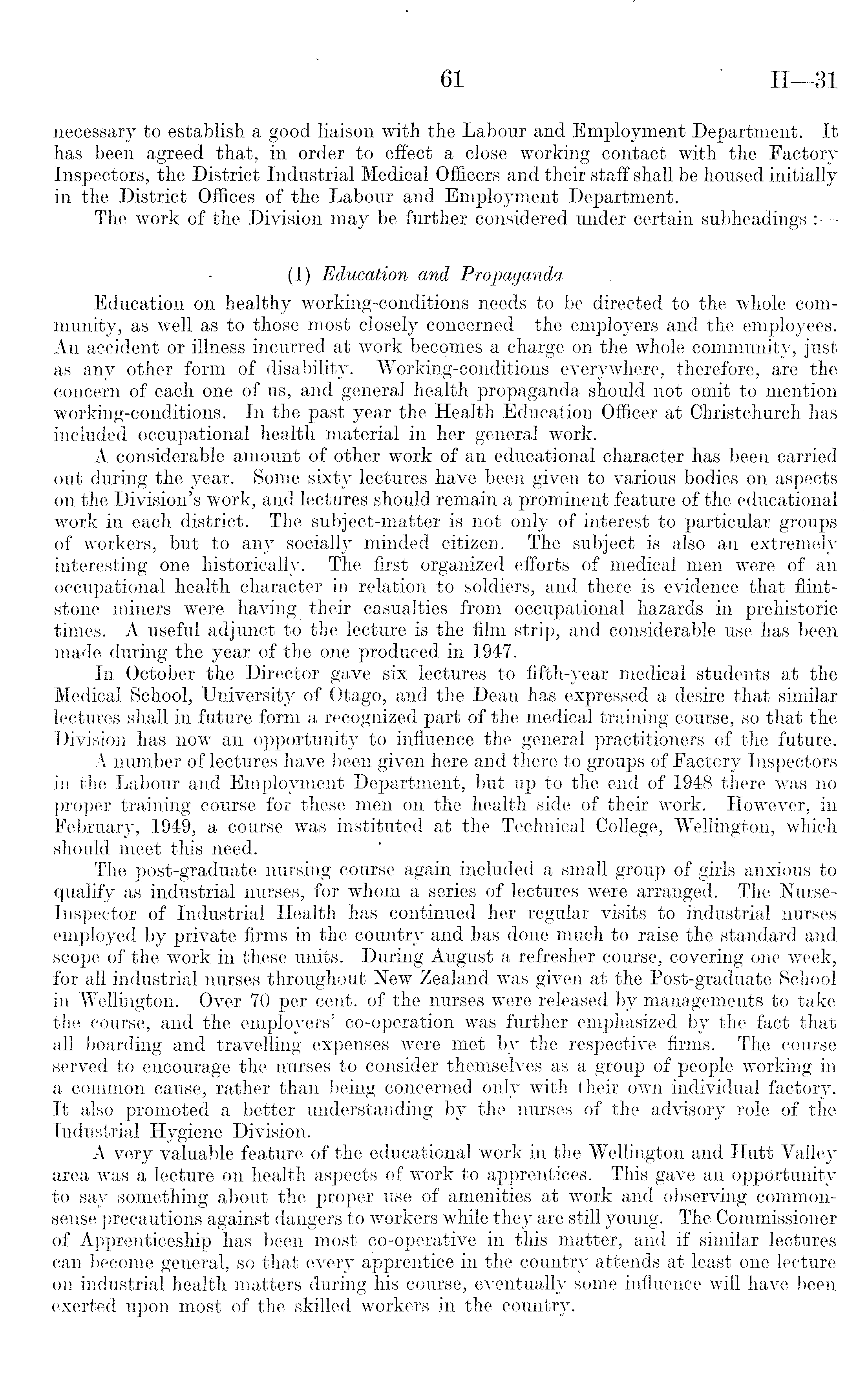 necessary to establish a good liaison with, the Labour and Employment Department. It has been agreed that, in order to effect a close working contact with the Factory Inspectors, the District Industrial Medical Officers and their staff shall be housed initially in the District Offices of the Labour and Employment Department. The work of the Division may be further considered under certain subheadings : —- (1) Education and Propaganda Education on healthy working-conditions needs to be directed to the whole community, as well as to those most closely concerned —the employers and the employees. An accident or illness incurred at work becomes a charge on the whole community, just as any other form of disability. Working-conditions everywhere, therefore, are the concern of each one of us, and general health propaganda should not omit to mention working-conditions. In the past year the Health Education Officer at Christchurch has included occupational health material in her general work. A considerable amount of other work of an educational character has been carried out during the year. Some sixty lectures have been given to various bodies on aspects on the Division's work, and lectures should remain a prominent feature of the educational work in each district. The subject-matter is not only of interest to particular groups of workers, but to any socially minded citizen. The subject is also an extremely interesting one historically. The first organized efforts of medical men were of an occupational health character in relation to soldiers, and there is evidence that flintstone miners were having their casualties from occupational hazards in prehistoric times. A useful adjunct to the lecture is the film -strip, and considerable use has been made during the year of the one produced in 1947. In October the Director gave six lectures to fifth-year medical students at the Medical School, University of Otago, and the Dean has expressed a desire that similar lectures shall in future form a recognized part of the medical training course, so that the Division has now an opportunity to influence the general practitioners of the future. A number of lectures have been given here and there to groups of Factory Inspectors in the Labour and Employment Department, but up to the end of 1948 there was no proper training course for these men on the health side of their work. However,- in February, 1949, a course was instituted at the Technical College, Wellington, which should meet this need. The post-graduate nursing course again included a small group of girls anxious to qualify as industrial nurses, for whom a series of lectures were arranged. The NurseInspector of Industrial Health has continued her regular visits to industrial nurses employed by private firms in the country and has .done much to raise the standard and scope of the work in these units. During August a refresher course, covering one week, for all industrial nurses throughout New Zealand was given at the Post-graduate School in Wellington. Over 70 per cent, of the nurses were released by managements to take the course, and the employers' co-operation was further emphasized by the fact that all boarding and travelling expenses were met by the respective firms. The course served to encourage the nurses to consider themselves as a group of people working in a common cause, rather than being concerned only with their own individual factory. It also promoted a better understanding by the nurses of the advisory role of the Industrial Hygiene Division. A very valuable feature of the educational work in the Wellington and Hutt Valley area was a lecture on health aspects of work to apprentices. This gave an opportunity to say something about the proper use of amenities at work and observing commonsense precautions against dangers to workers while they are still young. The Commissioner of Apprenticeship has been most co-operative in this matter, and if similar lectures can become general, so that every apprentice in the country attends at least one lecture on industrial health matters during his course, eventually some influence will have been exerted upon most of the skilled workers in the country.
