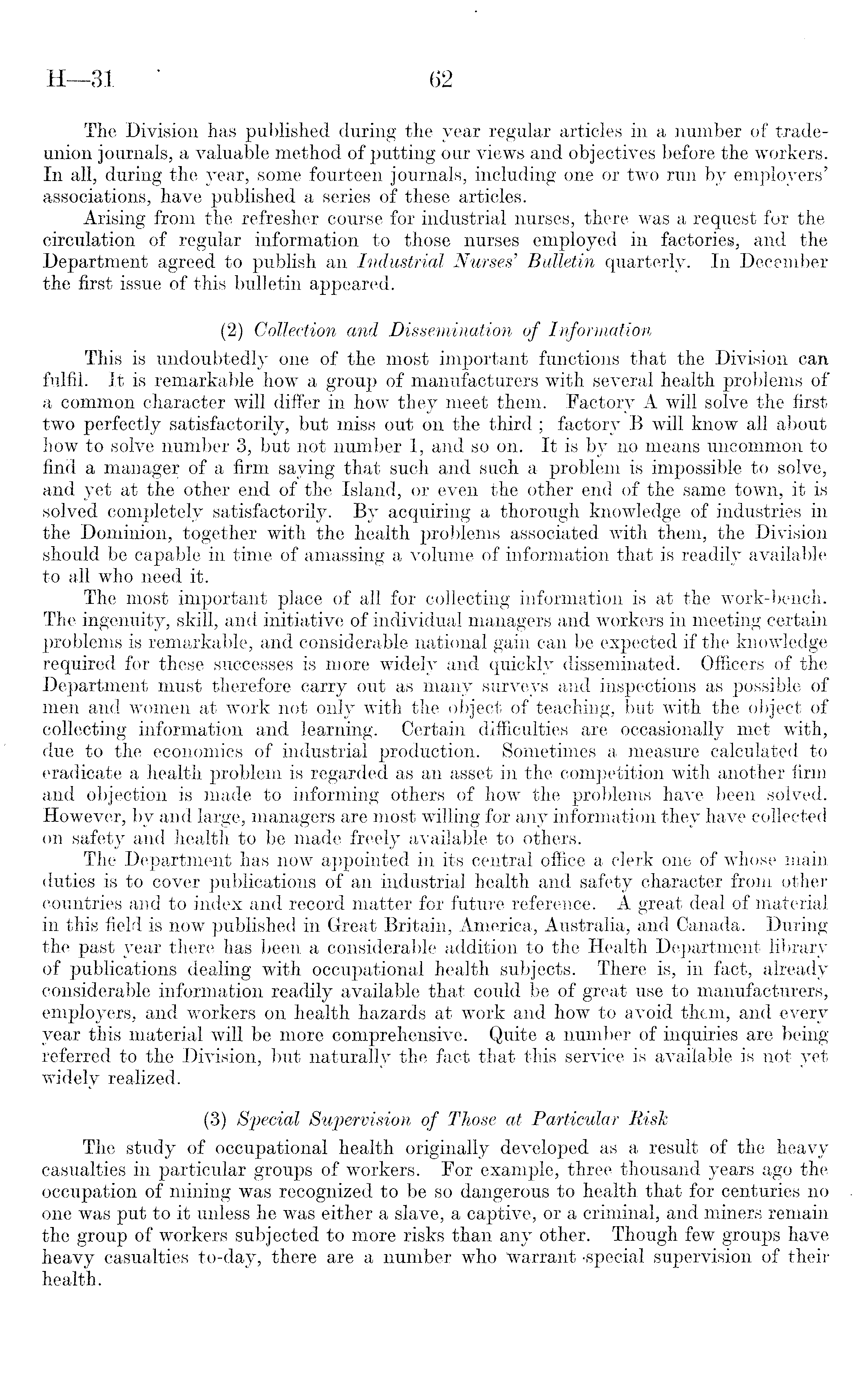 The Division has published during the year regular articles in a number of tradeunion journals, a valuable method of putting our views and objectives before the workers. In all, during the year,,some fourteen journals, including one or two run by employers' associations, have published a series of these articles. Arising from the refresher course for industrial nurses, there was a request for the circulation of regular information to those nurses employed in factories, and the Department agreed to publish an Industrial Nurses' Bulletin quarterly. In December the first issue of this bulletin appeared. (2) Collection and Dissemination of Information This is undoubtedly one of the most important functions that the Division can fulfil. It is remarkable how a group of manufacturers with several health problems of a common character will differ in how they meet them. Factory A will solve the first two perfectly satisfactorily, but miss out on the third ; factory B will know all about Low to solve number 3, but not number 1, and so on. It is by no means uncommon to find a manager of a firm saying that such and such a problem is impossible to solve, and yet at the other end of the Island, or even the other end of the same town, it is solved completely satisfactorily. By acquiring a thorough knowledge of industries in the Dominion, together with the health problems associated with them, the Division should be capable in time of amassing a volume of information that is readily available to all who need it. The most important place of all for collecting information is at the work-bench. The ingenuity, skill, and initiative of individual managers and workers in meeting certain problems is remarkable, and considerable national gain can be expected if the knowledge required for these successes is more widely and quickly disseminated. Officers of the Department must therefore carry out as many surveys and inspections as possible of men and women at work not only with the object of teaching, but with the object of collecting information and learning. Certain difficulties are occasionally met with, due to the economics of industrial production. Sometimes a measure calculated to eradicate a health problem is regarded as an asset in the competition with another firm and objection is made to informing others of how the problems have been solved. However, by and large, managers are most willing for any information they have collected on safety and health to be made freely available to others. The Department has now appointed in its central office a clerk one of whose main duties is to cover publications of an industrial health and safety character from other countries and to index and record matter for future reference. A great deal of material in this field is now published in Great Britain, America, Australia, and Canada. During the past year there has been a considerable addition to the Health Department library of publications dealing with occupational health subjects. There is, in fact, already considerable information readily available that could be of great use to manufacturers, employers, and workers on health hazards at work and how to avoid them, and every year this material 'will be more comprehensive. Quite a number of inquiries are being referred to the Division, but naturally the fact that this service is available is not yet widely realized. (3) Special Supervision of Those at Particular Risk The study of occupational health originally developed as a result of the heavy casualties in particular groups of workers. For example, three thousand years ago the occupation of mining was recognized to be so dangerous to health that for centuries no one was put to it unless he was either a slave, a captive, or a criminal, and miners remain the group of workers subjected to more risks than any other. Though few groups have heavy casualties to-day, there are a number who Warrant -special supervision of their health.
