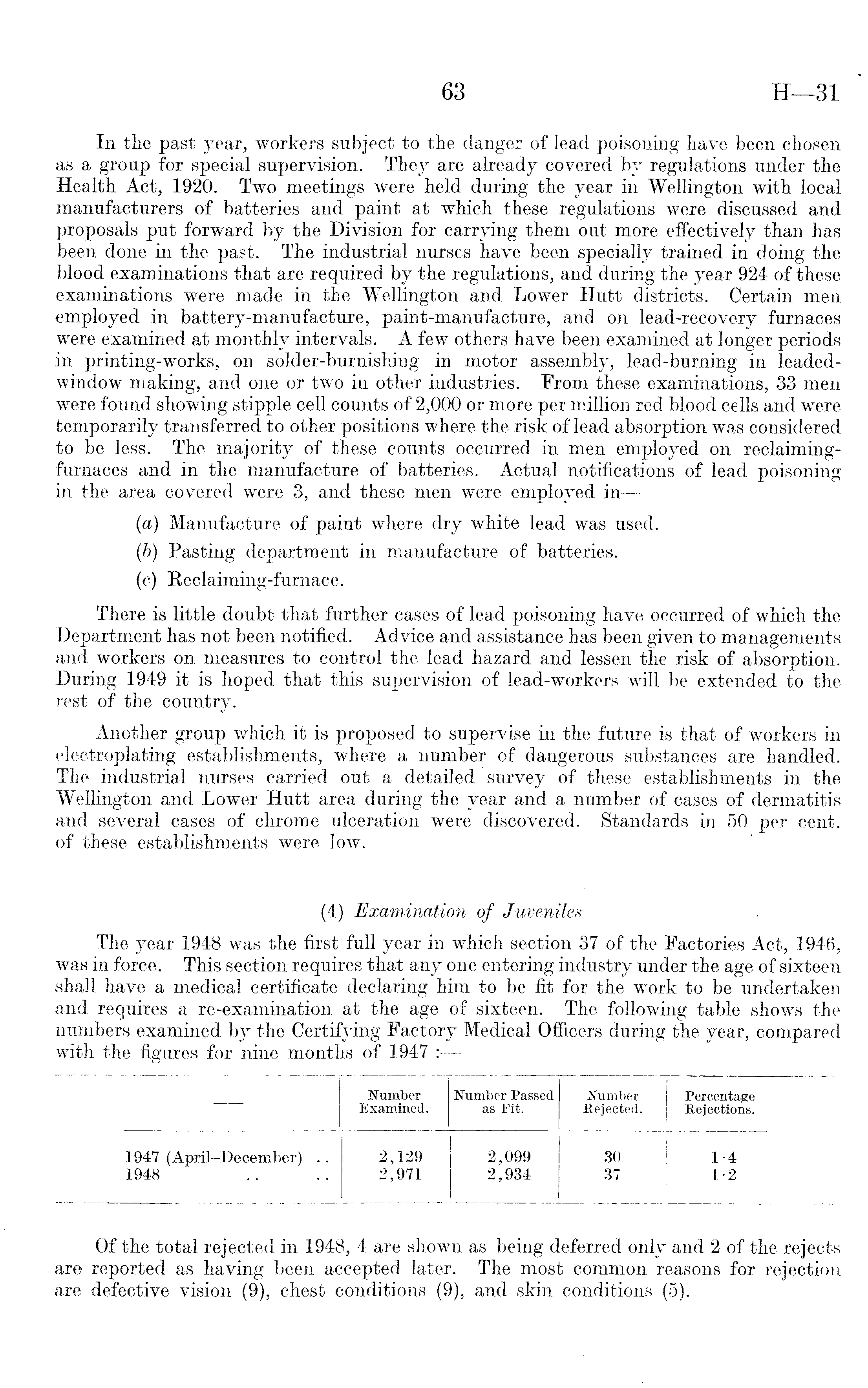 In tlie past year, workers subject to the danger of lead poisoning have been chosen as a group for special supervision. They are already covered by regulations under the Health Act, 1920. Two meetings were held during the year in Wellington with local manufacturers of batteries and paint at which these regulations were discussed and proposals put forward by the Division for carrying them out more effectively than has been done in the past. The industrial nurses have been specially trained in doing the blood examinations that are required by the regulations, and during the year 924 of these examinations were made in the Wellington and Lower Hutt districts. Certain men employed in battery-manufacture, paint-manufacture, and on lead-recovery furnaces were examined at monthly intervals. A few others have been examined at longer periods in printing-works, on solder-burnishing in motor assembly, lead-burning in leadedwindow making, and one or two in other industries. From these examinations, 33 men were found showing stipple cell counts of 2,000 or more per million red blood cells and were temporarily transferred to other positions where the risk of lead absorption was considered to be less. The majority of these counts occurred in men employed on reclaimingfurnaces and in the manufacture of batteries. Actual notifications of lead poisoning in the area covered were 3, and these men were employed in—(a) Manufacture of paint where dry white lead was used. (b) Pasting department in manufacture of batteries. (o) Reclaiming-furnace. There is little doubt that further cases of lead poisoning have occurred of which the Department has not been notified. Advice and assistance has been given to managements and workers on. measures to control the lead hazard and lessen the risk of absorption. During 1949 it is hoped that this supervision of lead-workers will be extended to the rest of the country. Another group which it is proposed to supervise in the future is that of workers in electroplating establishments, where a number of dangerous substances are handled. The industrial nurses carried out a detailed survey of these establishments in the Wellington and Lower Hutt area during the year and a number of cases of dermatitis and several cases of chrome ulceration were discovered. Standards in 50 per cent, of these establishments were low. (4) Examination of Juveniles The year 1948 was the first full year in which section 37 of the Factories Act, 1946, was in force. This section requires that any one entering industry under the age of sixteen shall have a medical certificate declaring him to be fit for the work to be undertaken and requires a re-examination at the age of sixteen. The following table shows the numbers examined by the Certifying Factory Medical Officers during the year, compared with the figures for nine months of 1947 :