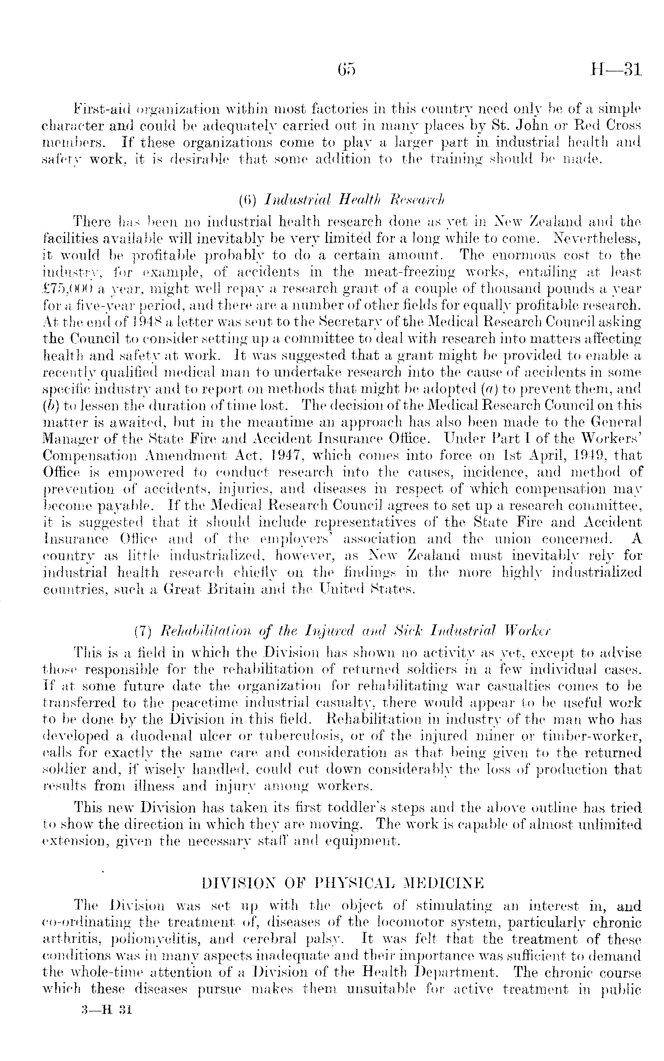 First-aid organization within most factories in this country need only be of a simple character and could be adequately carried out in many places by St. John or Red Cross members. If these organizations come to play a larger part in industrial health and safety work, it is desirable that some addition to the training should be made. (6) Industrial Health Research There has bean no industrial health research done as yet in New Zealand and the facilities available will inevitably be very limited for a long while to come. Nevertheless, it would be profitable probably to do a certain amount. The enormous cost to the industry, for example, of accidents in the meat-freezing works, entailing at least £75,000 a year, might well repay a research grant of a couple of thousand pounds a year for a five-year period, and there are a number of other fields for equally profitable research. At the end of 1948 a letter was sent to the Secretary of the Medical Research Council asking the Council to consider setting up a committee to deal with research into matters affecting health and safety at work. It was suggested that a grant might be provided to enable a recently qualified medical man to undertake research into the cause of accidents in some specific industry and to report on methods that might be adopted (a) to prevent them, and (b) to lessen the duration of time lost. The decision of the Medical Research Council on this matter is awaited, but in the meantime an approach has also been made to the General Manager of the State Fire and Accident Insurance Office. Under Part lof the Workers' Compensation Amendment Act, 1947, which comes into force on Ist April, 1949, that Office is empowered to conduct research into the causes, incidence, and method of prevention of accidents, injuries, and diseases in respect of which compensation may become payable. If the Medical Research Council agrees to set up a research committee, it is suggested that it should include representatives of the State Fire and Accident Insurance Office and of the employers' association and the union concerned. A country as little industrialized, however, as New Zealand must inevitably rely for industrial health research chiefly on the findings in the more highly industrialized countries, such a Great Britain and the United States. (7) Rehabilitation of the Injured and Sick Industrial Worker This is a field in which the Division has shown no activity as yet, except to advise those responsible for the rehabilitation of returned soldiers in a few individual cases. If at some future date the organization for rehabilitating war casualties comes to be transferred to the peacetime industrial casualty, there would appear to be useful work to be done by the Division in this field. Rehabilitation in industry of the man who has developed a duodenal ulcer or tuberculosis, or of the injured miner or timber-worker, calls for exactly the same care and consideration as that being given to the returned soldier and, if wisely handled, could cut down considerably the loss of production that results from illness and injury among workers. This new Division has taken its first toddler's steps and the above outline has tried to show the direction in which they are moving. The work is capable of almost unlimited extension, given the necessary staff and equipment. DIVISION OF PHYSICAL MEDICINE The Division was set up with the object of stimulating an interest in, and co-ordinating the treatment of, diseases of the locomotor system, particularly chronic arthritis, poliomyelitis, and cerebral palsy. It was felt that the treatment of these conditions was in many aspects inadequate and their importance was sufficient to demand the whole-time attention of a Division of the Health Department. The chronic course which these diseases pursue makes them unsuitable for active treatment in public