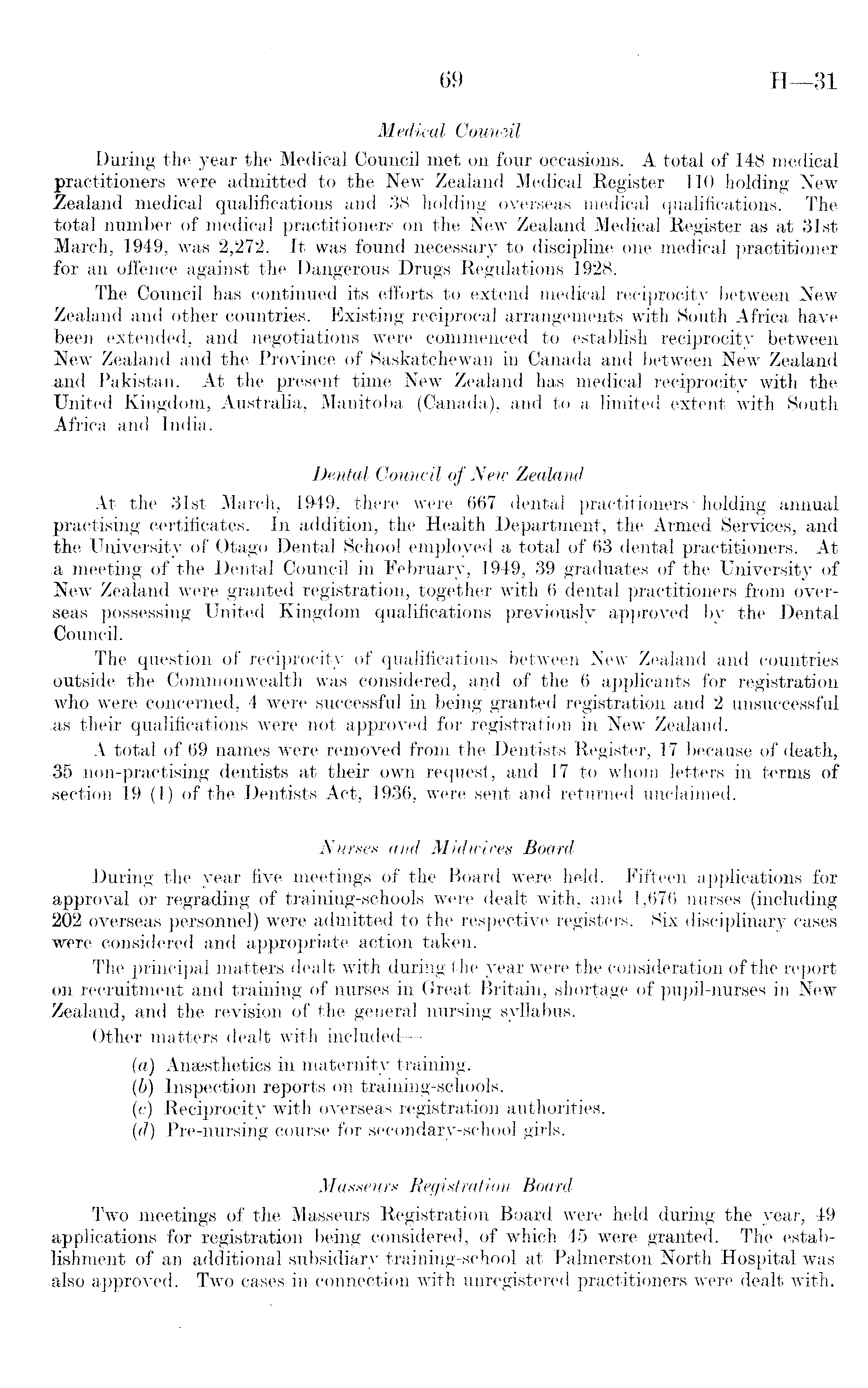 Medical Council During the year the Medical Council met on four occasions. A total of 148 medical practitioners were admitted to the New Zealand Medical Register- 110 holding New Zealand medical qualifications and 38 holding overseas medical qualifications. The total number of medical practitioners on the New Zealand Medical Register as at 31st March, 1949, was 2,272. It was found necessary to discipline one medical practitioner for an offence against the Dangerous Drugs Regulations 1928. The Council has continued its efforts to extend medical reciprocity between New Zealand and other countries. Existing reciprocal arrangements with South Africa have been extended, and negotiations were commenced to establish reciprocity between New Zealand and the Province of Saskatchewan in Canada and between New Zealand and Pakistan. At the present time New Zealand has medical reciprocity with the United Kingdom, Australia, Manitoba (Canada), and to a limited extent with South Africa and India. Dental Council of New Zealand At the 31st March, 1949, there were 667 dental practitioners" holding annual practising certificates. In addition, the Health Department, the Armed Services, and the University of Otago Dental School employed a total of 63 dental practitioners. At a meeting of the Dental Council in February, 1949, 39 graduates of the University of New Zealand were granted registration, together with 6 dental practitioners from overseas possessing United Kingdom qualifications previously approved by the Dental Council. The question of reciprocity of qualifications between New Zealand and countries •outside the Commonwealth was considered, and of the 6 applicants for registration who were concerned, 4 were successful in being granted registration and 2 unsuccessful as their qualifications were not approved for registration in New Zealand. A total of 69 names were removed from the Dentists Register, 17 because of death, 35 non-practising dentists at their own request, and 17 to whom letters in terms of section 19 (1) of the Dentists Act, 1936, were sent and returned unclaimed. Nurses and Mid wives Board During the year five meetings of the Board were held. Fifteen applications for approval or regrading of training-schools were dealt with, and 1,676 nurses (including 202 overseas personnel) were admitted to the respective registers. Six disciplinary cases were considered and appropriate action taken. The principal matters dealt'with during the year were the consideration of the report on recruitment and training of nurses in Great Britain, shortage of pupil-nurses in New Zealand, and the revision of the general nursing syllabus. Other matters dealt with included- — (a) Anaesthetics in maternity training. (b) Inspection reports on training-schools. (c) Reciprocity with overseas registration authorities. (d) Pre-nursing course for secondary-school girls. Masseurs Registration Board Two meetings of the Masseurs Registration Board were held during the year, 49 applications for registration being considered, of which 45 were granted. The establishment of an additional subsidiary training-school at Palmerston North Hospital was also approved. Two cases in connection with unregistered practitioners were dealt with.
