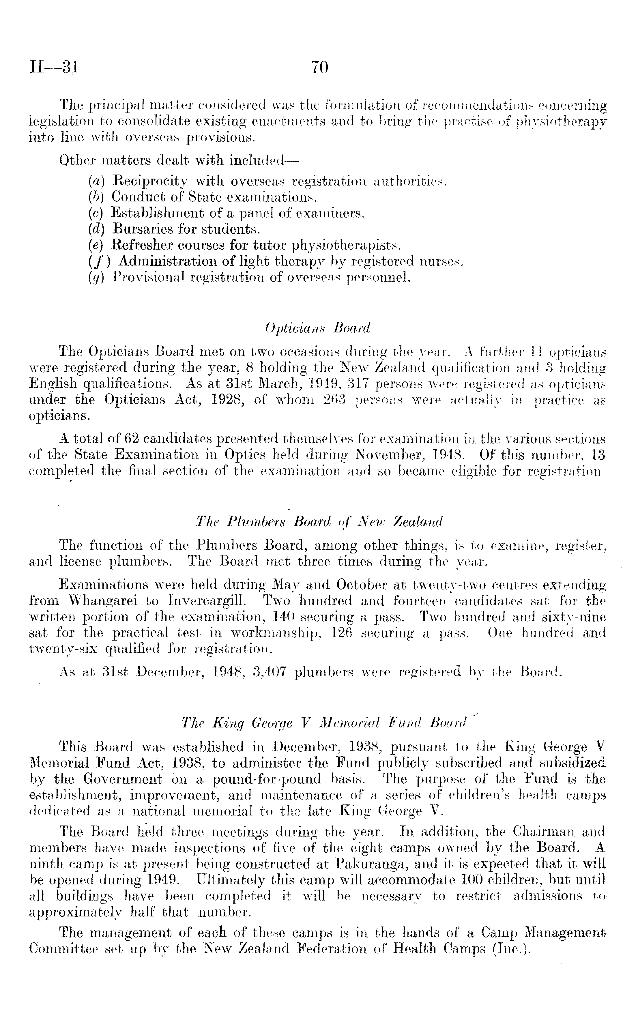 The principal matter considered was tJie formulation of recommendations concerning legislation to consolidate existing enactments and to bring the practise of physiotherapy into line with overseas provisions. Other matters dealt with included — (a) Reciprocity with overseas registration authorities. (b) Conduct of State examinations. (c) Establishment of a panel of examiners. (d) Bursaries for students. (e) Refresher courses for tutor physiotherapists. (/) Administration of light therapy by registered nurses. (g) Provisional registration of overseas personnel. Opticians Board The Opticians Board met on two occasions during the year. A further 11 opticianswere registered during the year, 8 holding the New Zealand qualification and 3 holding English qualifications. As at 31st March, 1949, 317 persons were registered as opticians under the Opticians Act, 1928, of whom 263 persons were actually in practice as opticians. A total of 62 candidates presented themselves for examination in the various sections of the State Examination in Optics held during November, 1948. Of this number, 13 completed the final section of the examination and so became eligible for registration. The Plumbers Board of New Zealand The function of the Plumbers Board, among other things, is to examine, register, and license plumbers. The Board met three times during the year. Examinations were held during May and October at twenty-two centres extending from Whangarei to Invercargill. Two hundred and fourteen candidates sat for the written portion of the examination, 140 securing a pass. Two hundred and sixty-nine sat for the practical test in workmanship, 126 securing a pass. One hundred and twenty-six qualified for registration. As at 31st December, 1948, 3,407 plumbers were registered by the Board. The King George V Memorial Fund Board This Board was established in December, 1938, pursuant to the King George V Memorial Fund Act, 1938, to administer the Fund publicly subscribed and subsidized by the Government on a pound-for-pound basis. The purpose of the Fund is the establishment, improvement, and maintenance of a series of children's health camps dedicated as a national memorial to the late King George V. The Board held three meetings during the year. In addition, the Chairman and members have made inspections of five of the eight camps owned by the Board. A ninth camp is at present being constructed at Pakuranga, and it is expected that it will be opened during 1949. Ultimately this camp will accommodate 100 children, but until all buildings have been completed it will be necessary to restrict admissions to approximately half that number. The management of each of these camps is in the hands of a Camp Management Committee set up by the New Zealand Federation of Health Camps (Inc.).