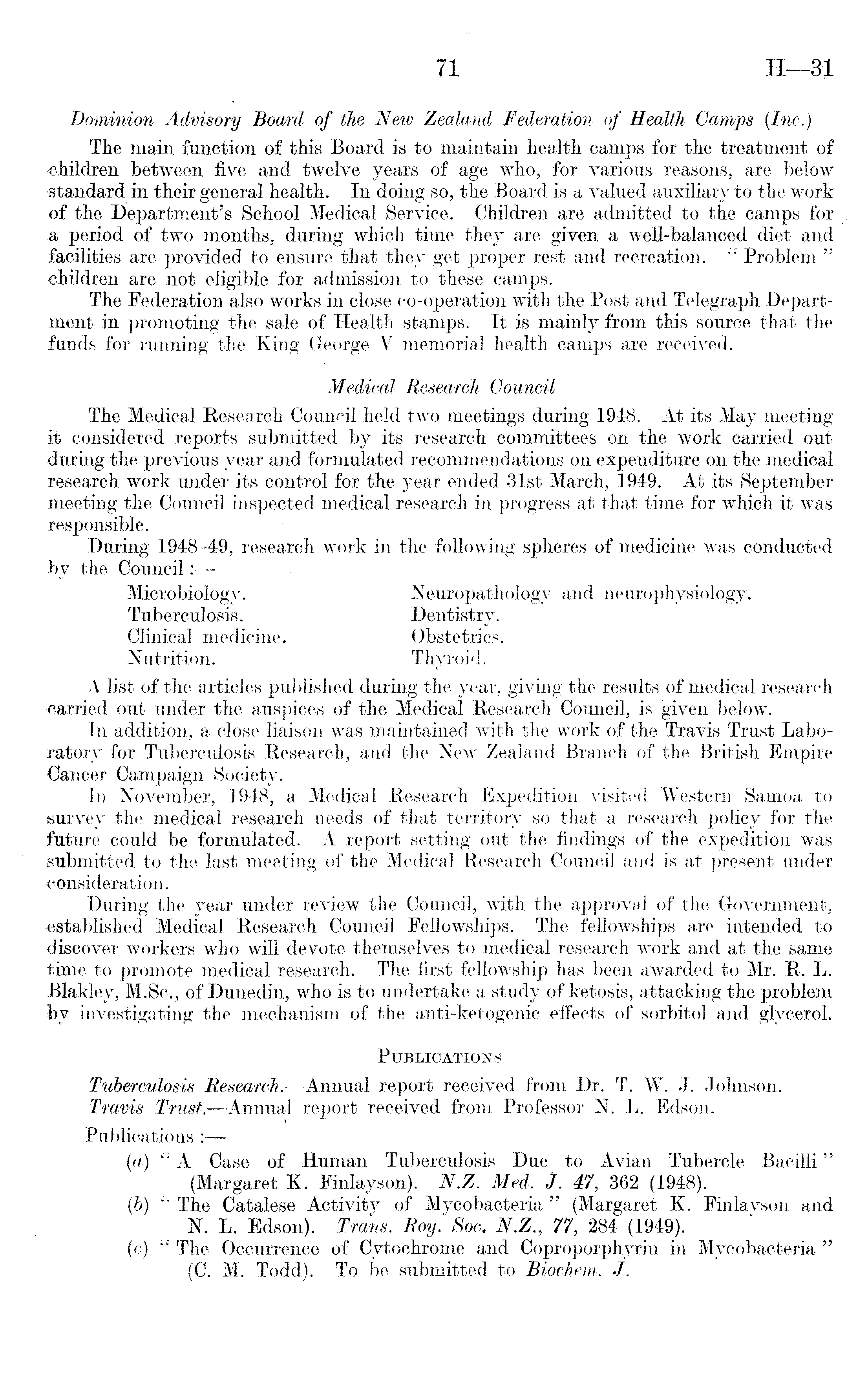 Dominion Advisory Board of the New Zealand Federation of Health Camps (Inc.) The main function of this Board is to maintain health camps for the treatment of children between five and twelve years of age who, for various reasons, are below standard in their general health. In doing so, the Board is a valued auxiliary to the work of the Department's School Medical Service. Children are admitted to the camps for a period of two months, during which time they are given a well-balanced diet and facilities are provided to ensure that they get proper rest and recreation. " Problem " children are not eligible for admission to these camps. The Federation also works in close co-operation with the Post and Telegraph Department in promoting the sale of Health stamps. It is mainly from this source that'the funds for running the King George V memorial health camps are received. Medical Research Council The Medical Research Council held two meetings during 1948. At its May meeting it considered reports submitted by its research committees on the work carried out during the previous year and formulated recommendations on expenditure on the medical research work under its control for the year ended -31 st March, 1949. At its September meeting the Council inspected medical research in progress at that time for which it was responsible. During 1948-49, research work in the following spheres of medicine was conducted by the Council: — Microbiology. Neuropathology and neurophysiology. Tuberculosis. Dentistry. Clinical medicine. " Obstetrics. Nutrition. Thyroid. A list of the articles published daring the year, giving the results of medical research carried out under the auspices of the Medical Research Council, is given below. In addition, a close liaison was maintained with the work of the Travis Trust Laboratory for Tuberculosis Research, and the New Zealand Branch of the British Empire Cancer Campaign Society. In November, 1948, a Medical Research Expedition visited Western Samoa to survey the medical research needs of that territory so that a research policy for the future could be formulated. A report setting out the findings of the expedition was submitted to the last meeting of the Medical Research Council and is at present under consideration. During the year under review the Council, with the approval of the Government, •established Medical Research Council Fellowships. The fellowships are intended to discover workers who will devote themselves to medical research work and at the same time to promote medical research. The first fellowship has been awarded to Mr. R. L. Blakley, M.Sc., of Dunedin, who is to undertake a study of ketosis, attacking the problem by investigating the mechanism of the anti-ketogenic effects of sorbitol and glycerol. Publications Tuberculosis Research. —Annual report received from Dr. T. W. J. Johnson. Travis Trust. —Annual report received from Professor N. L. Edson. Publications : (a) " A Case of Human Tuberculosis Due to Avian Tubercle Bacilli" (Margaret K. Finlayson). N.Z. Med. J. 47, 362 (1948). (b) " The Catalese Activity of Mycobacteria " (Margaret K. Finlayson and N. L. Edson). Trans. Roy. Soc. N.Z., 77, 284 (1949). (c) " The Occurrence of Cytochrome and Coproporphyrin in Mycobacteria " (C. M. Todd). To be submitted to Biochem. J.