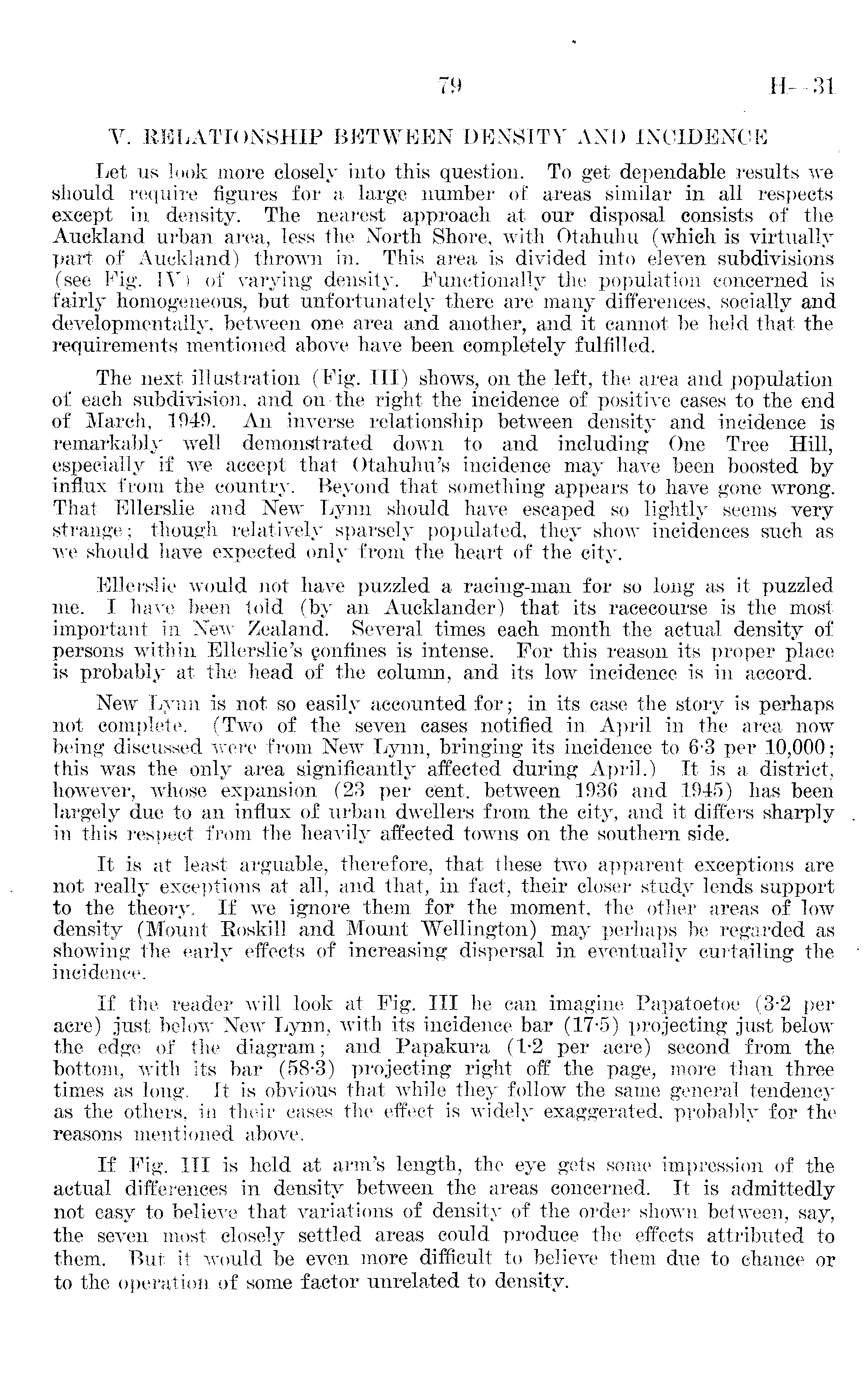 Y. RELATIONSHIP BETWEEN DENSITY AND INCIDENCE Let us look more closely into this question. To get dependable results we should require figures for a large number of areas similar in all respects except in density. The nearest approach at our disposal consists of the Auckland urban area, less the North Shore, with Otahuhu (which is virtually part of Auckland) thrown in. This area is divided into eleven subdivisions (see Pig. IV) of varying density. Functionally the population concerned is fairly homogeneous, but unfortunately there are many differences, socially and developmentally, between one area and another, and it cannot be held that the requirements mentioned above have been completely fulfilled. The next illustration (Fig. Ill) shows, on the left, the area and population of each subdivision, and on the right the incidence of positive cases to the end of March, 3949. An inverse relationship between density and incidence is remarkably well demonstrated down to and including One Tree Hill, especially if we accept that Otahuhu's incidence may have been boosted by influx from the country. Beyond that something appears to have gone wrong. That Ellerslie and New Lynn should have escaped so lightly seems very strange ; though relatively sparsely populated, they show incidences such as we should have expected only from the heart of the city. Ellerslie would not have puzzled a racing-man for so long as it puzzled me. I have been told (by an Aucklander) that its racecourse is the most important in New Zealand. Several times each month the actual density of persons within Ellerslie 7 s confines is intense. For this reason its proper place is probably at the head of the column, and its low incidence is in accord. New Lynn is not so easily accounted for; in its case the story is perhaps not complete. (Two of the seven cases notified in April in the area now being discussed were from New Lynn, bringing its incidence to 6-3 per 10,000; this was the only area significantly affected during April.) It is a district, however, whose expansion (23 per cent, between 1936 and 1945) has been largely due to an influx of urban dwellers from the city, and it differs sharply in this respect from the heavily affected towns on the southern side. It is at least arguable, therefore, that these two apparent exceptions are not really exceptions at all, and that, in fact, their closer study lends support to the theory. If we ignore them for the moment, the other areas of low density (Mount Roskill and Mount Wellington) may perhaps be regarded as showing the early effects of increasing dispersal in eventually curtailing the incidence. If the reader will look at Fig. 11l he can imagine Papatoetoe (3-2 per acre) just below New Lynn, with its incidence bar (17-5) projecting just below the edge of the diagram; and Papakura (1-2 per acre) second from the bottom, with its bar (58-3) projecting right off the page, more than three times as long. It is obvious that while they follow the same general tendency as the others, in their cases the effect is widely exaggerated, probably for the reasons mentioned above. If Fig. 11l is held at arm's length, the eye gets some impression of the actual differences in density between the areas concerned. It is admittedly not easy to believe that variations of density of the order shown between, say, the seven most closely settled areas could produce the effects attributed to them. But it would be even more difficult to believe them due to chance or to the operation of some factor unrelated to density.