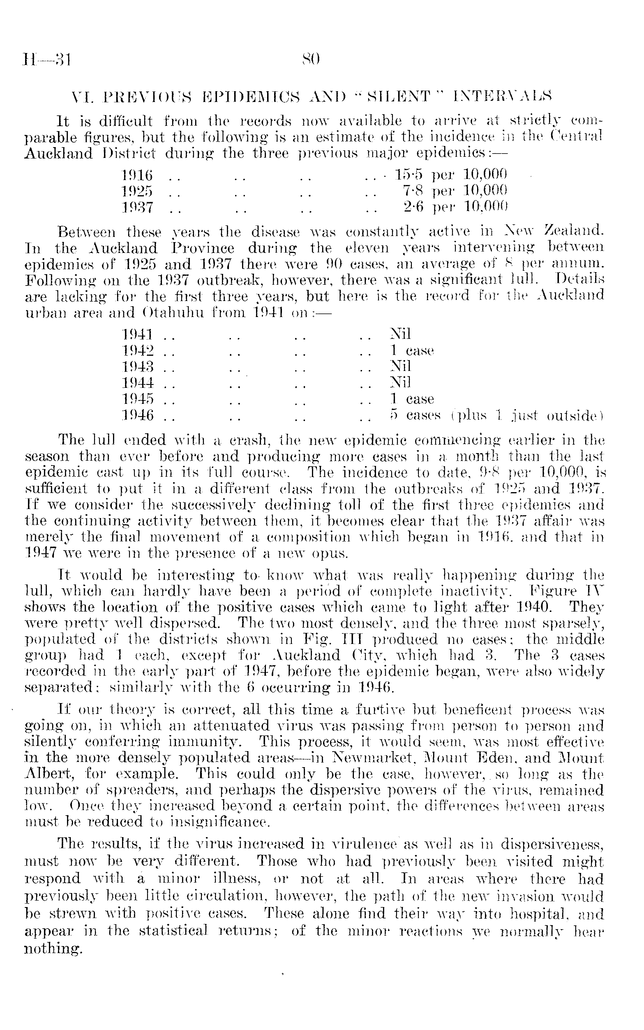 VI. PREVIOUS EPIDEMICS AND " SILENT " INTERVALS It is difficult from the records now available to arrive at strictly comparable figures, but the following is an estimate of the incidence in the Central Auckland District during the three previous major epidemics:— 1916 . . . . . . .. ■ 15-5 per 10,000 1925 . . . . . . . . 7-8 per 10,000 1937 . . . . . . 2-6 per 10,000 Between these years the disease was constantly active in New Zealand. In the Auckland Province during the eleven years intervening between epidemics of 1925 and 1937 there were 90 cases, an average of 8 per annum. Following on the 1937 outbreak, however, there was a significant lull. Details are lacking for the first three years, but here is the record for the Auckland urban area and Otahuhu from 1941 on: — 1941 . . . . . . . . Nil 1942 .. .. .. .. 1 ease 1943 . . . . . . . . Nil 1944 .. ..' .. ..Nil 1945 .. .. .. . . 1 case 1946 . . . . . . 5 cases (plus 1 just outside) The lull ended with a crash, the new epidemic commencing earlier in the season than ever before and producing more cases in a month than the last epidemic cast up in its full course. The incidence to date, 9-8 per 10,000, is sufficient to put it in a different class from the outbreaks of 1925 and 1937. If we consider the successively declining toll of the first three epidemics and the continuing activity between them, it becomes clear that the 1937 affair was merely the final movement of a composition which began in 1916, and that in 1947 we were in the presence of a new opus. ' It would be interesting to- know what, was really happening during the lull, which can hardly have been a period of complete inactivity. Figure IV shows the location of the positive cases which came to light after 1940. They were pretty well dispersed. The two most densely, and the three most sparsely, populated of the districts shown in Fig. 11l produced no eases; the middle group had 1 each, except for Auckland City, which had 3. The 3 cases recorded in the early part of 1947, before the epidemic began, were also widely separated; similarly with the 6 occurring in 1946. If our theory is correct, all this time a furtive but beneficent process was going on, in which an attenuated virus was passing from person to person and silently conferring immunity. This process, it would seem, was most effective in the more densely populated areas—in Newmarket, Mount Eden, and Mount Albert, for example. This could only be the case, however,. so long as the number of spreaders, and perhaps the dispersive powers of the virus, remained low. Once they increased beyond a certain point, the differences between areas must be reduced to insignificance. The results, if the virus increased in virulence' as well as in dispersiveness, must now be very different. Those who had previously been visited might respond with a minor illness, or not at all. In areas where there had previously been little circulation, however, the path of the new invasion would be strewn with positive cases. These alone find their way into hospital, and appear in the statistical returns; of the minor reactions we normally hear nothing.