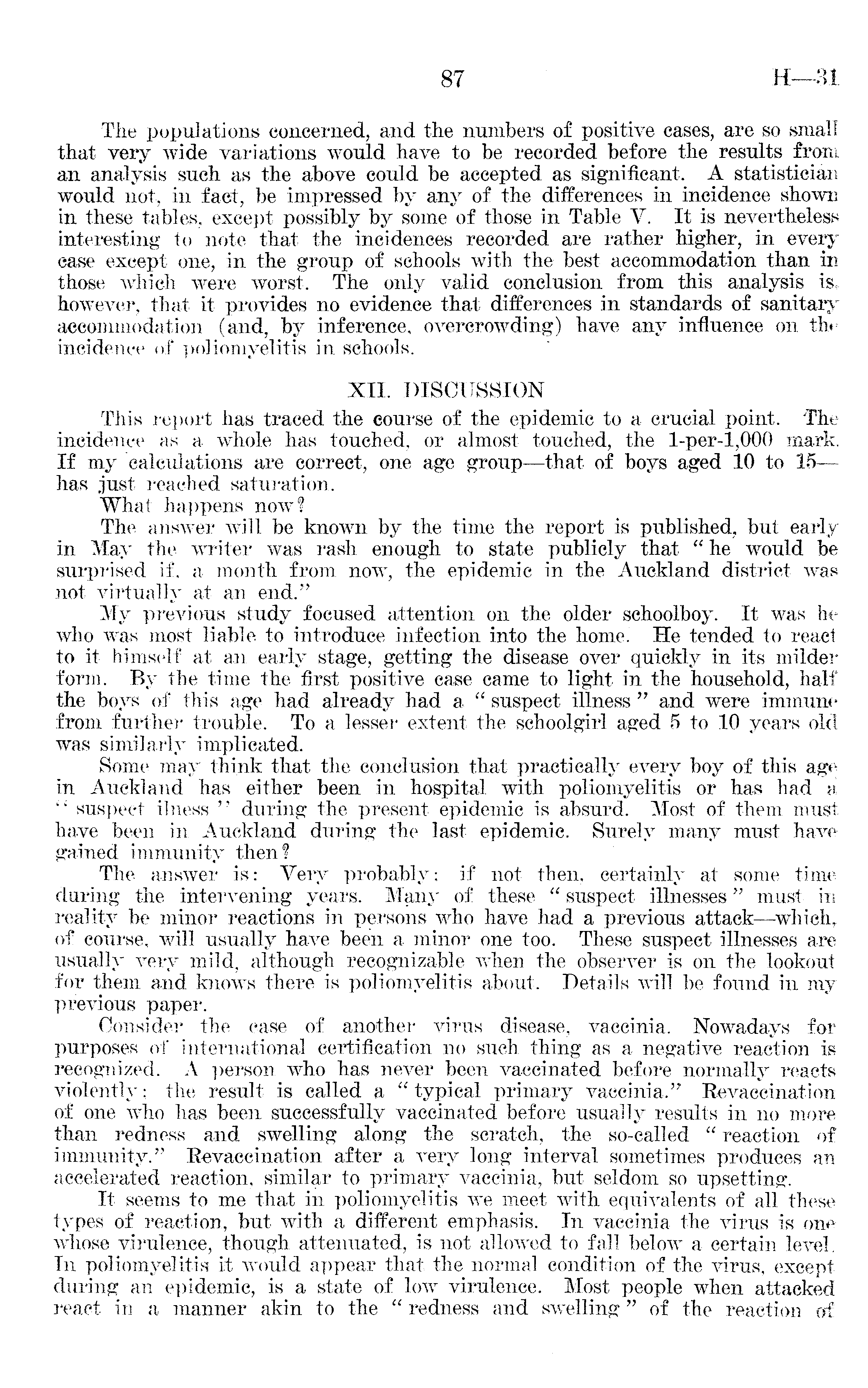 The populations concerned, and the numbers of positive cases, are so small that very wide variations would have to be recorded before the results from an analysis such as the above could be accepted as significant. A statistician would not, in fact, be impressed by any of the differences in incidence shown in these tables, except possibly by some of those in Table V. It is nevertheless interesting to note that the incidences recorded are rather higher, in every case except one, in the group of schools with the best accommodation than in those which were worst. The only valid conclusion from this analysis is r however, that it provides no evidence that differences in standards of sanitary accommodation (and, by inference, overcrowding) have any influence on the incidence of poliomyelitis in schools. XII. DISCUSSION This report has graced the course of the epidemic to a crucial point. The incidence as a whole has touched, or almost touched, the l-per-1,000 mark. If my calculations are correct, one age group—that of boys aged 10 to 15— has just reached saturation. What happens now? The answer will be known by the time the report is published, but early in May the writer was rash enough to state publicly that "he would be surprised if, a month from now, the epidemic in the Auckland district was not virtually at an end/' My previous study focused attention on the older schoolboy. It was he who was most liable to introduce infection into the home. He tended to react to it himself at an early stage, getting the disease over quickly in its milder form. By tfie time the first positive case came to light in the household, half the boys of this age had already had a " suspect illness " and were immune from further trouble. To a lesser extent the schoolgirl aged sto 10 years old was similarly implicated. Some may think that the conclusion that practically every boy of this age in Auckland has either been in hospital with poliomyelitis or has had a " suspect ilness " during the present epidemic is absurd. Most of them must have been in Auckland during the last epidemic. Surely many must have gained immunity then? The answer is: Very probably; if not then, certainly at some time during the intervening years. Many of these " suspect illnesses" must in reality be minor reactions in persons who have had a previous attack —which, of course, will usually have been a minor one too. These suspect illnesses are usually very mild, although recognizable when the observer is on the lookout for them and knows there is poliomyelitis about. Details will be found in my previous paper. Consider the case of another virus disease, vaccinia. Nowadays for purposes of international certification no such thing as a negative reaction is recognized. A person who has never been vaccinated before normally reacts violently; the result is called a "typical primary vaccinia." Revaccination of one who has been successfully vaccinated before usually results in no more than redness and swelling along the scratch, the so-called " reaction of immunity." Revaccination after a very long interval sometimes produces an accelerated reaction, similar to primary vaccinia, but seldom so upsetting. It seems to me that in poliomyelitis we meet with equivalents of all these types of reaction, but with a different emphasis. In vaccinia the virus is one whose virulence, though attenuated, is not allowed to fall below a certain level. In poliomyelitis it would appear that the normal condition of the virus, except during an epidemic, is a state of low virulence. Most people when attacked react in a manner akin to the " redness and swelling " of the reaction of