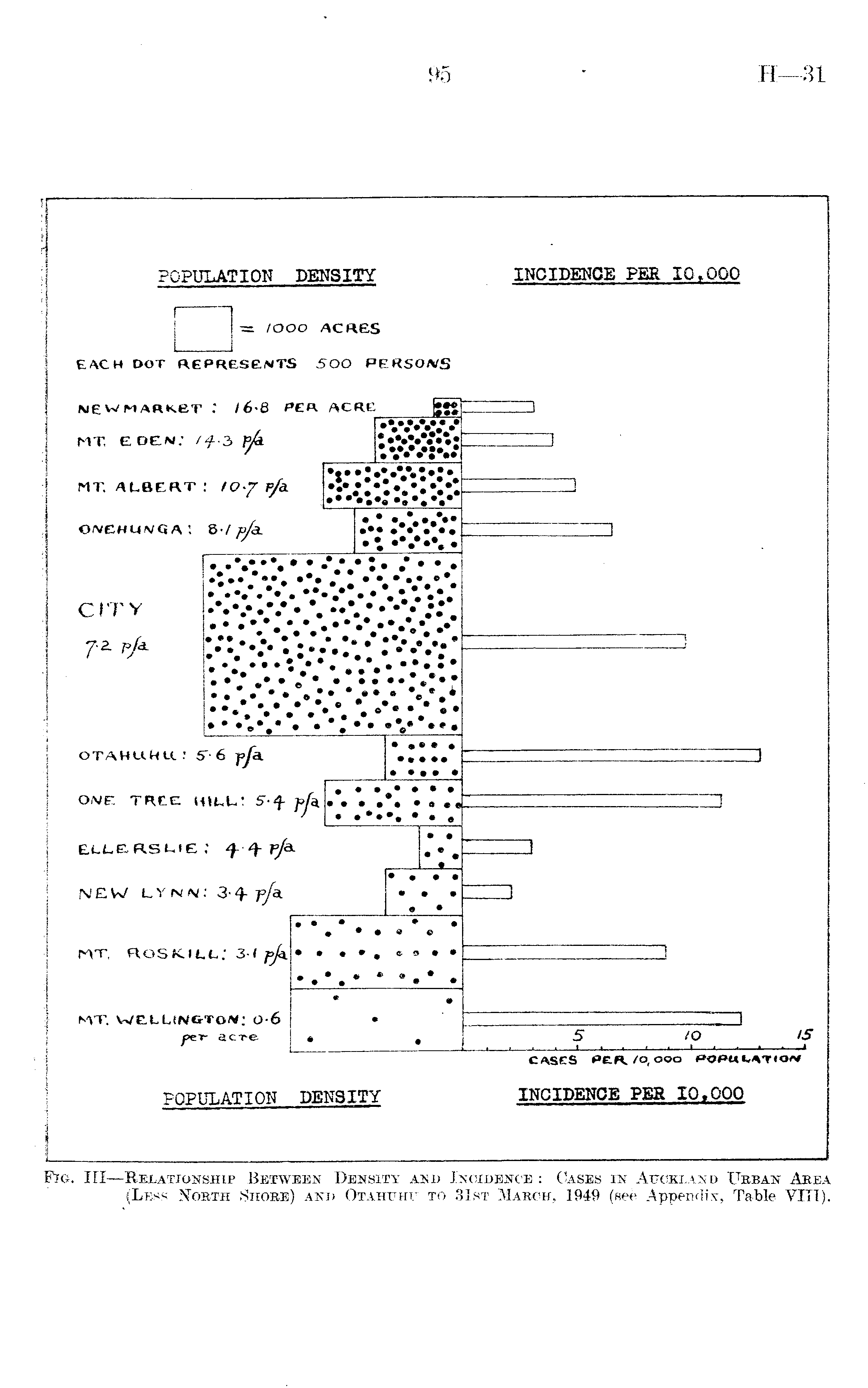Fig. III—Relationship Between Density and Incidence: Cases in Auckland Urban Area (Less North Shore) and Otahuhu to 31st March, 1949 (see Appendix, Table VIII).