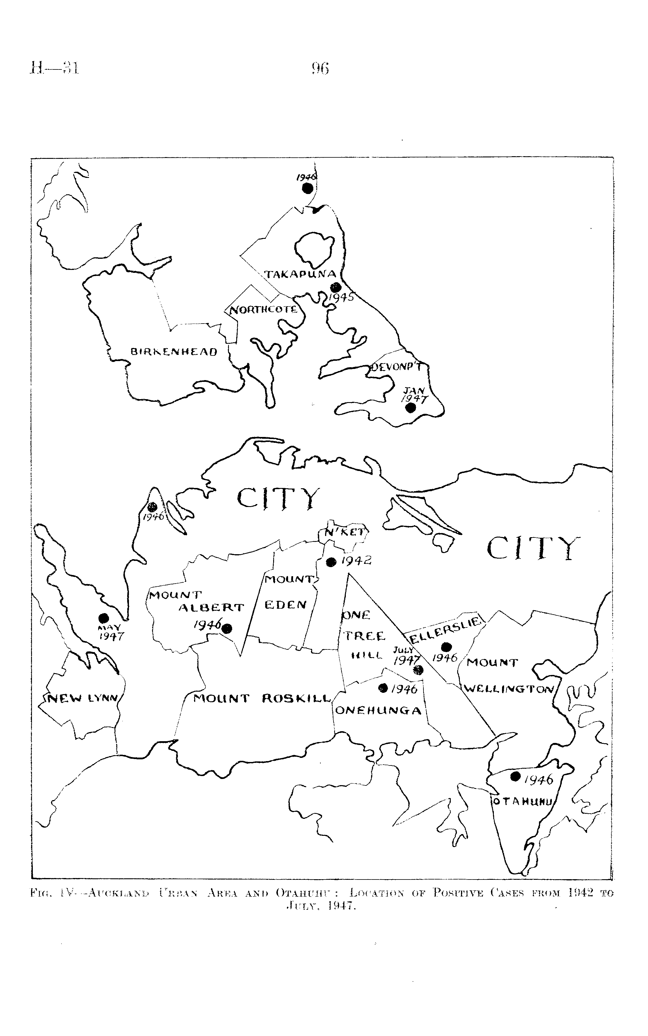 Fig. IV—Auckland Urban Area and Otahuhu: Location of Positive Cases from 1942 to July, 1947.