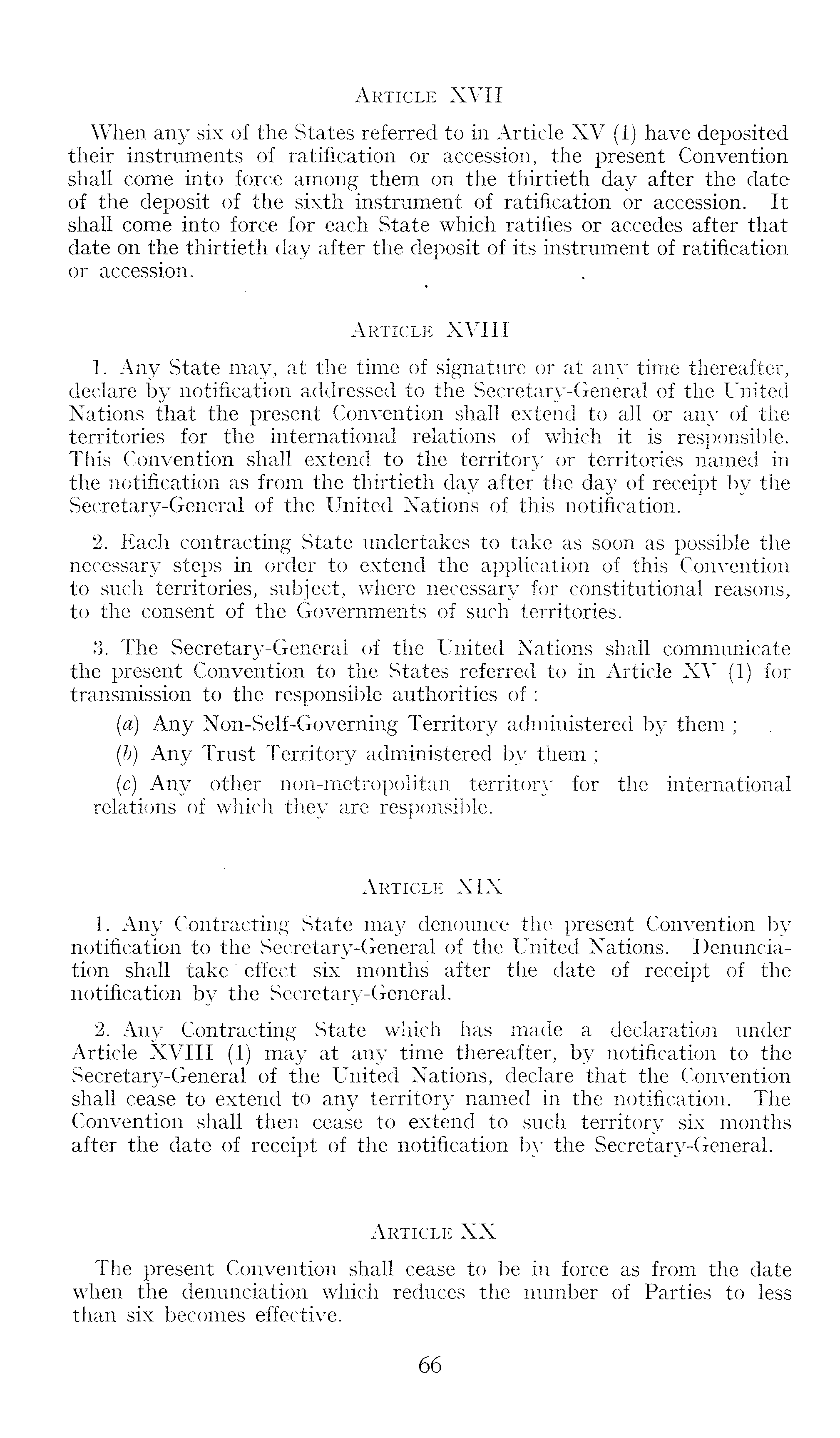 Article XVII When any six of the States referred to in Article XV (1) have deposited their instruments of ratification or accession, the present Convention shall come into force among them on the thirtieth day after the date of the deposit of the sixth instrument of ratification or accession. It shall come into force for each State which ratifies or accedes after that date on the thirtieth day after the deposit of its instrument of ratification or accession. Article XVIII 1. Any State may, at the time of signature or at any time thereafter, declare by notification addressed to the Secretary-General of the United Nations that the present Convention shall extend to all or any of the territories for the international relations of which it is responsible. This Convention shall extend to the territory or territories named in the notification as from the thirtieth day after the day of receipt by the Secretary-General of the United Nations of this notification. 2. Each contracting State undertakes to take as soon as possible the necessary steps in order to extend the application of this Convention to such territories, subject, where necessary for constitutional reasons, to the consent of the Governments of such territories. 3. The Secretary-General of the United Nations shall communicate the present Convention to the States referred to in Article XV (1) for transmission to the responsible authorities of : (а) Any Non-Self-Governing Territory administered by them ; (б) Any Trust Territory administered by them ; (c) Any other non-metropolitan territory for the international relations of which they are responsible. Article XIX 1. Any Contracting State may denounce the present Convention by notification to the Secretary-General of the United Nations. Denunciation shall take effect six months after the date of receipt of the notification by the Secretary-General. 2. Any Contracting State which has made a declaration under Article XVIII (1) may at any time thereafter, by notification to the Secretary-General of the United Nations, declare that the Convention shall cease to extend to any territory named in the notification. The Convention shall then cease to extend to such territory six months after the date of receipt of the notification by the Secretary-General. Article XX The present Convention shall cease to be in force as from the date when the denunciation which reduces the number of Parties to less than six becomes effective.