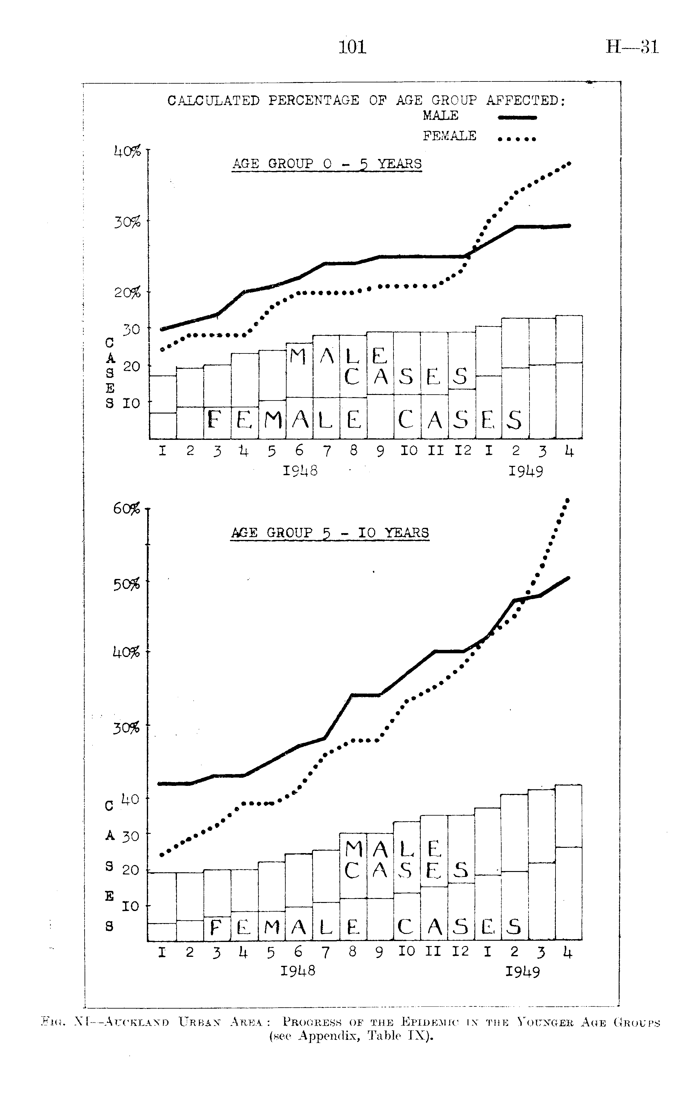 Fig. XI—Auckland Urban Area: Progress of the Epidemic in the Younger Age Groups (see Appendix, Table IX).
