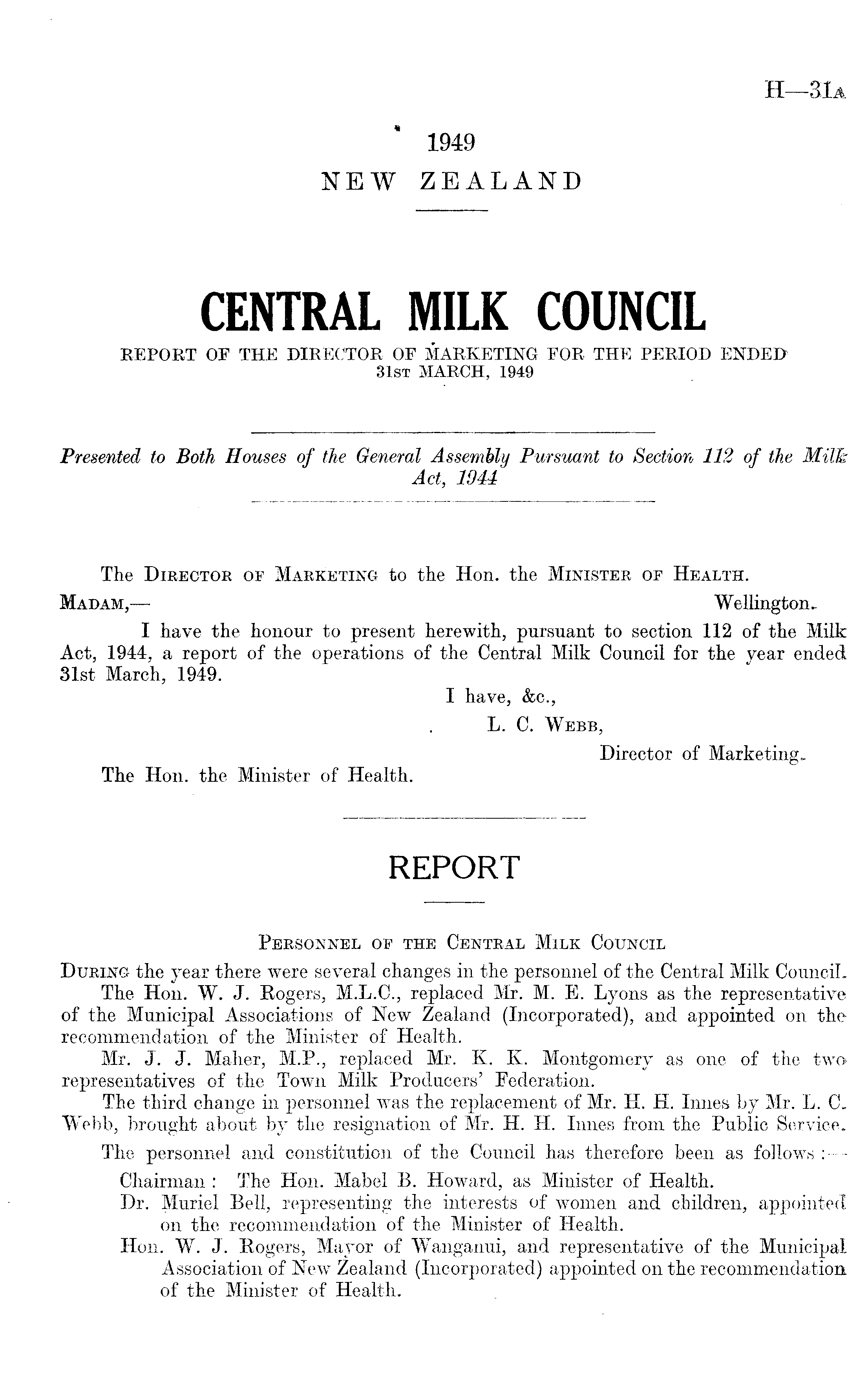 The Director of Marketing to the Hon. the Minister of Health. Madam, — Wellington. I have the honour to present herewith, pursuant to section 112 of the Milk Act, 1944, a report of the operations of the Central Milk Council for the year ended 31st March, 1949. I have, &c, L. C. Webb, Director of Marketing. The Hon. the Minister of Health.