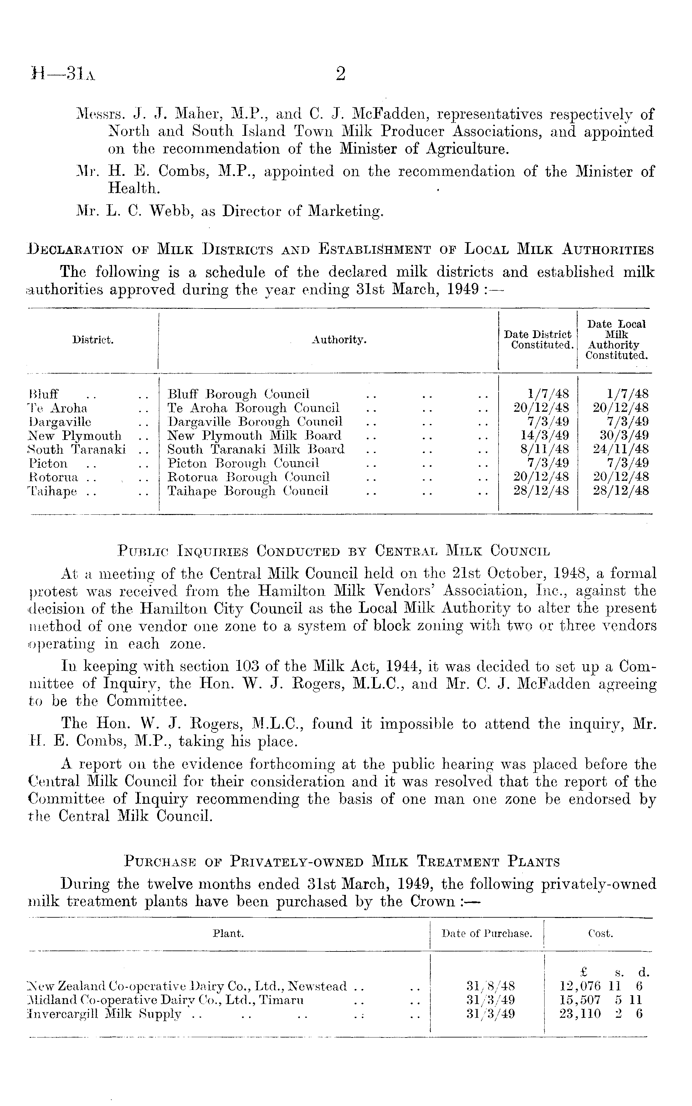 Public Inquiries Conducted by Central Milk Council At a meeting of the Central Milk Council held on the 21st October, 1948, a formal protest was received from the Hamilton Milk Vendors' Association, Inc., against the decision of the Hamilton City Council as the Local Milk Authority to alter the present method of one vendor one zone to a system of block zoning with two or three vendors operating in each zone. In keeping with section 103 of the Milk Act, 1944, it was decided to set up a Committee of Inquiry, the Hon. W. J. Eogers, M.L.C., and Mr. C. J. McFadden agreeing to be the Committee. The Hon. W. J. Rogers, M.L.C., found it impossible to attend the inquiry, Mr. H. E. Combs, M.P., taking his place. A report on the evidence forthcoming at the public hearing was placed before the Central Milk Council for their consideration and it was resolved that the report of the Committee of Inquiry recommending the basis of one man one zone be endorsed by the Central Milk Council. Purchase op Privately-owned Milk Treatment Plants During the twelve months ended 31st March, 1949, the following privately-owned milk treatment plants have been purchased by the Crown :