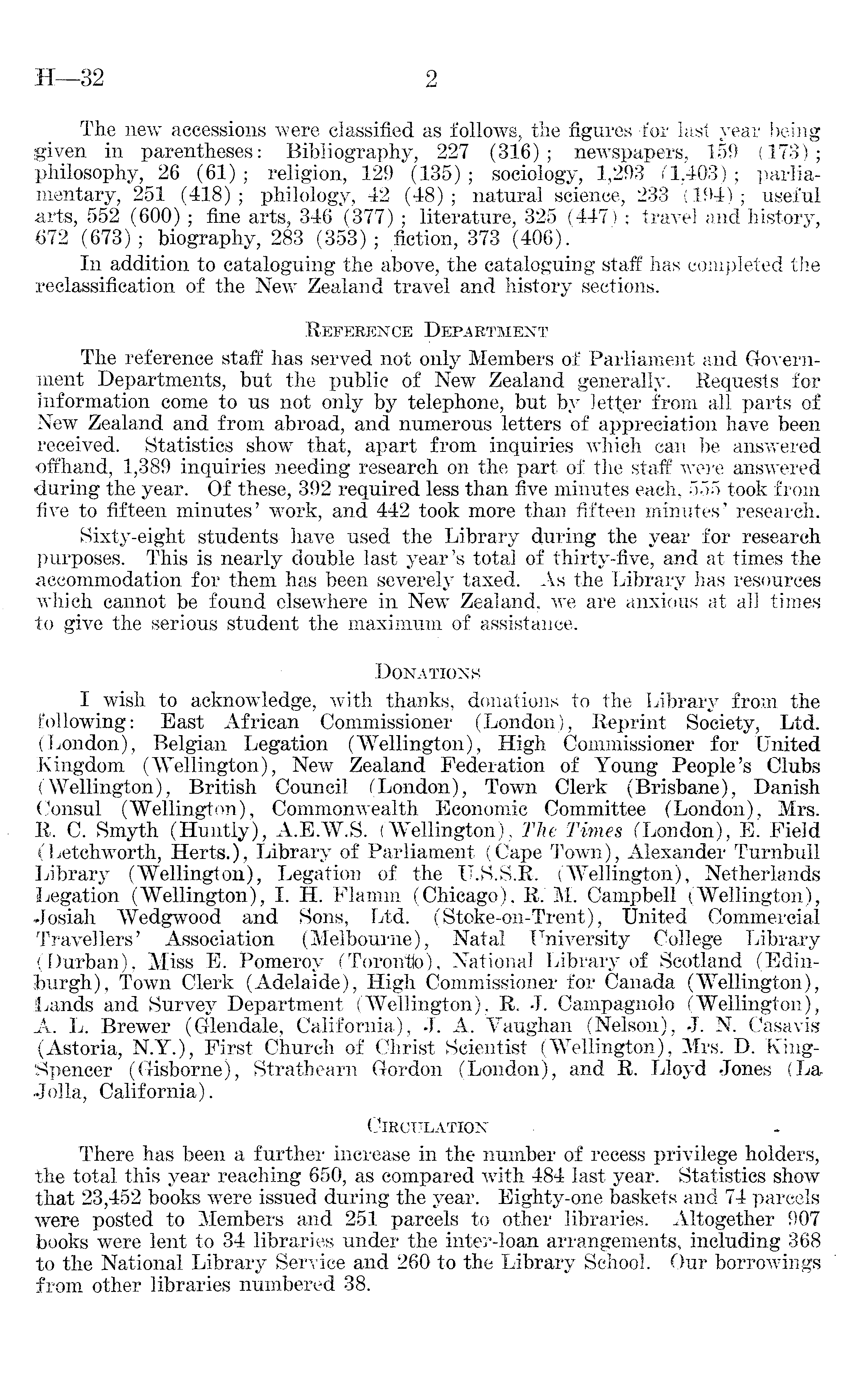 The new accessions were classified as follows, the figures for last year being given in parentheses: Bibliography, 227 (316); newspapers, 159 (173); philosophy, 26 (61) ; religion, 129 (135); sociology, 1,293 (1,403) ; parliamentary, 251 (418); philology, 42 (48); natural science, 233 (194); useful arts, 552 (600) ; fine arts, 346 (377) ; literature, 325 (447) ; travel and history, 672 (673); biography, 283 (353); fiction, 373 (406). In addition to cataloguing the above, the cataloguing staff has completed the reclassification of the New Zealand travel and history sections. Reference Department The reference staff has served not only Members of Parliament and Government Departments, but the public of New Zealand generally. Requests for information come to us not only by telephone, but by letter from all parts of New Zealand and from abroad, and numerous letters of appreciation have been received. Statistics show that, apart from inquiries which can be answered offhand, 1,389 inquiries needing research on the part of the staff were answered during the year. Of these, 392 required less than five minutes each, 555 took from five to fifteen minutes' work, and 442 took more than fifteen minutes' research. Sixty-eight students have used the Library during the year for research purposes. This is nearly double last year's total of thirty-five, and at times the accommodation for them has been severely taxed. As the Library has resources which cannot be found elsewhere in New Zealand, we are anxious at all times to give the serious student the maximum of assistance. Donations I wish to acknowledge, with thanks, donations to the Library from the following: East African Commissioner (London), Reprint Society, Ltd. (London), Belgian Legation (Wellington), High Commissioner for United Kingdom (Wellington), New Zealand Federation of Young People's Clubs (Wellington), British Council (London), Town Clerk (Brisbane), Danish Consul (Wellington), Commonwealth Economic Committee (London), Mrs. R. C. Smyth (Huntly), A.E.W.S. (Wellington), The Times (London), E. Field (Letchworth, Herts.), Library of Parliament (Cape Town), Alexander Turnbull Library (Wellington), Legation of the U.S.S.R. (Wellington), Netherlands Legation (Wellington), I. H. Flamm (Chicago), R. M. Campbell (Wellington), Josiah Wedgwood and Sons, Ltd. (Stoke-on-Trent), United Commercial Travellers' Association (Melbourne), Natal University College Library (Durban), Miss E. Pomerov (Toronto), National Library of Scotland (Edinburgh), Town Clerk (Adelaide), High Commissioner for Canada (Wellington), Lands and Survey Department (Wellington). R. J. Campagnolo (Wellington), A. L. Brewer (Glen dale, California), J. A. Vaughan (Nelson), J. N. Casavis (Astoria, N.Y.), First Church of Christ Scientist (Wellington), Mrs. D. KingSpencer (Gisborne), Strathearn Gordon (London), and R. Lloyd Jones (La Jolla, California). Circulation * There has been a further increase in the number of recess privilege holders, the total this year reaching 650, as compared with 484 last year. Statistics show that 23,452 books were issued during the year. Eighty-one baskets and 74 parcels were posted to Members and 251 parcels to other libraries. Altogether 907 books were lent to 34 libraries under the inter-loan arrangements, including 368 to the National Library Service and 260 to the Library School. Our borrowings from other libraries numbered 38.