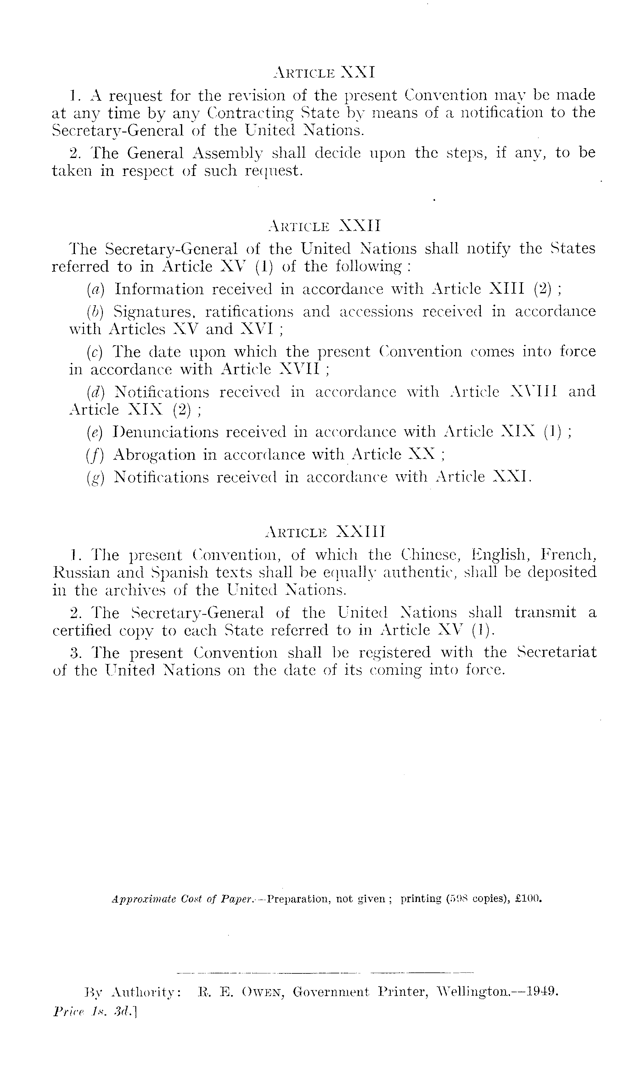 Article XXI 1. A request for the revision of the present Convention may be made at any time by any Contracting State by means of a notification to the Secretary-General of the United Nations. 2. The General Assembly shall decide upon the steps, if any, to be taken in respect of such request. Article XXII The Secretary-General of the United Nations shall notify the States referred to in Article XV (1) of the following : (a) Information received in accordance with Article XIII (2) ; (b) Signatures, ratifications and accessions received in accordance with Articles XV and XVI ; (c) The date upon which the present Convention comes into force in accordance with Article XVII ; (d) Notifications received in accordance with Article XVIII and Article XIX (2) ; (e) Denunciations received in accordance with Article XIX (1) ; (/) Abrogation in accordance with Article XX ; (g) Notifications received in accordance with Article XXI. Article XXIII 1. The present Convention, of which the Chinese, English, French, Russian and Spanish texts shall be equally authentic, shall be deposited in the archives of the United Nations. 2. The Secretary-General of the United Nations shall transmit a certified copy to each State referred to in Article XV (1). 3. The present Convention shall be registered with the Secretariat of the United Nations on the date of its coming into force. Approximate Cost of Paper.—Preparation, not given ; printing (598 copies), £lOO.
