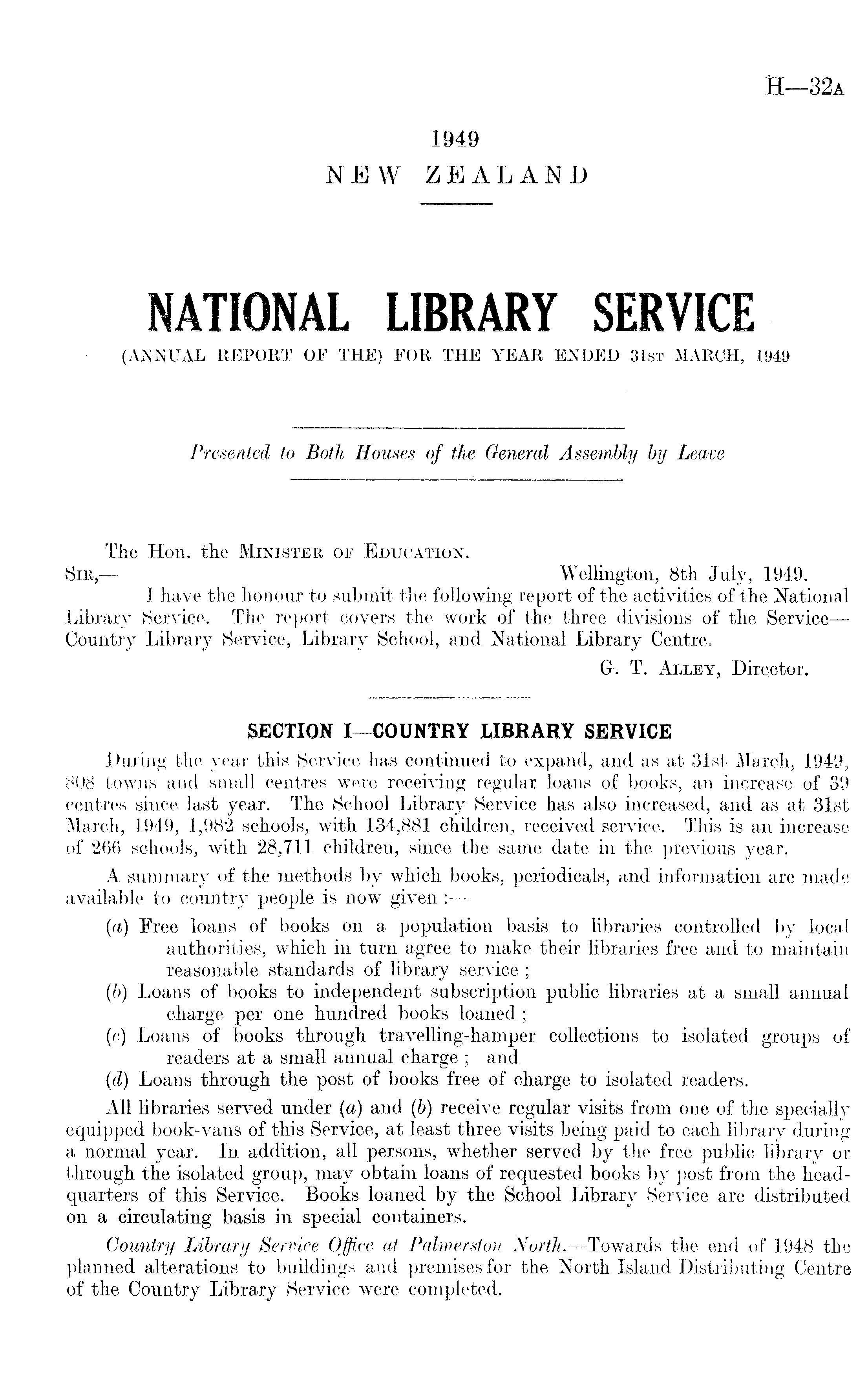 The Hon. the Minister of Education. Sib, — Wellington, Bth July, 1949. I have the honour to submit the following report of the activities of the National Library Service. The report covers the work of the three divisions of the Service— Country Library Service, Library School, and National Library Centre. G. T. Alley, Director.