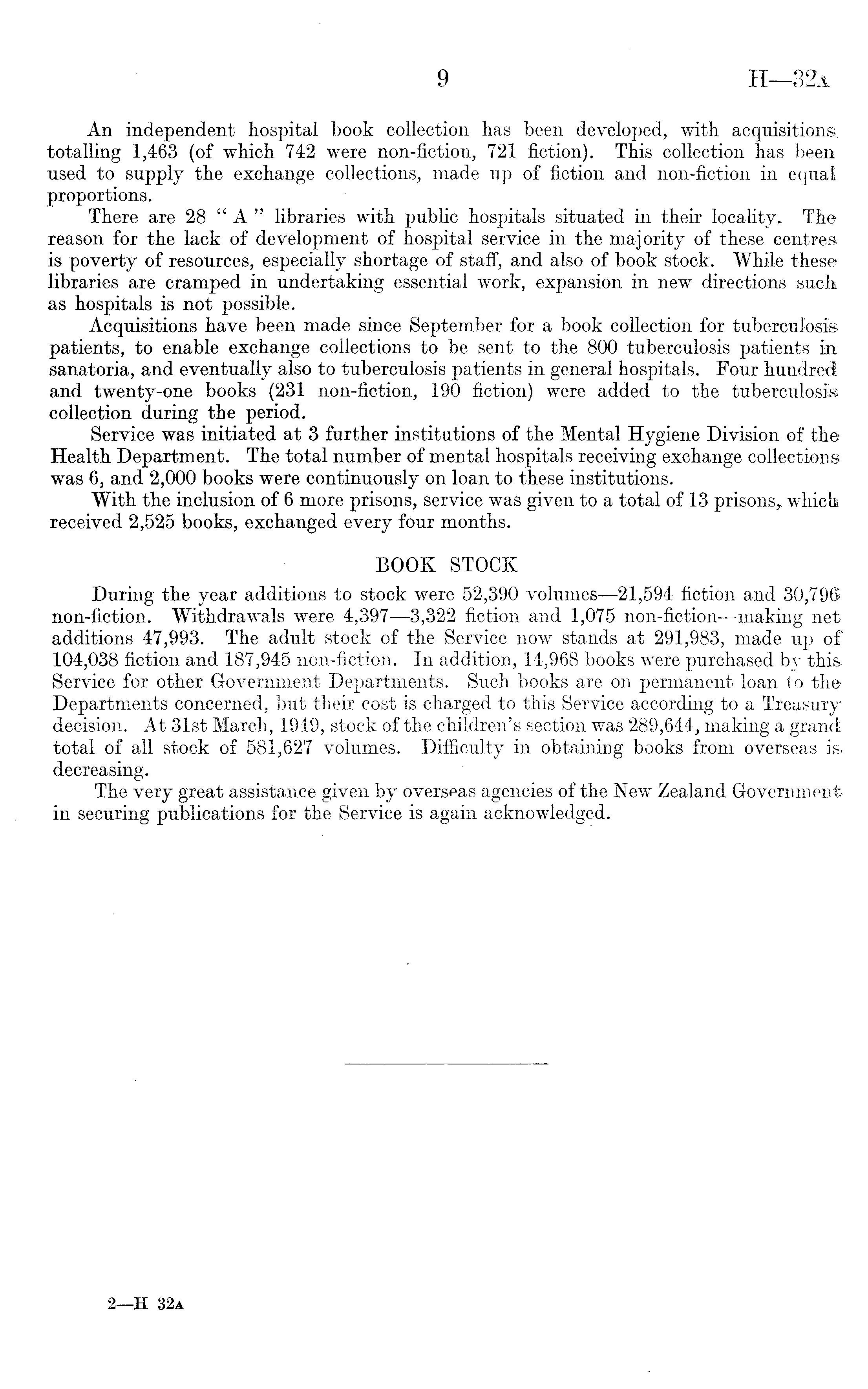 An independent hospital book collection has been developed, with acquisitions!, totalling 1,463 (of which 742 were non-fiction, 721 fiction). This collection has been used to supply the exchange collections, made up of fiction and non-fiction in equal proportions. There are 28 "A " libraries with public hospitals situated in their locality. The reason for the lack of development of hospital service in the majority of these centres is poverty of resources, especially shortage of staff, and also of book stock. While these libraries are cramped in undertaking essential work, expansion in new directions such as hospitals is not possible. Acquisitions have been made since September for a book collection for tuberculosis patients, to enable exchange collections to be sent to the 800 tuberculosis patients in sanatoria, and eventually also to tuberculosis patients in general hospitals. Four hundred and twenty-one books (231 non-fiction, 190 fiction) were added to the tuberculosis collection during the period. Service was initiated at 3 further institutions of the Mental Hygiene Division of the Health Department. The total number of mental hospitals receiving exchange collections was 6, and 2,000 books were continuously on loan to these institutions. With the inclusion of 6 more prisons, service was given to a total of 13 prisons,, which received 2,525 books, exchanged every four months. BOOK STOCK During the year additions to stock were 52,390 volumes—2l,s94 fiction and 30,796 non-fiction. Withdrawals were 4,397 —3,322 fiction and 1,075 non-fiction—making net additions 47,993. The adult stock of the Service now stands at 291,983, made up of 104,038 fiction and 187,945 non-fiction. In addition, 14,968 books were purchased by this Service for other Government Departments. Such books are on permanent loan to the Departments concerned, but their cost is charged to this Service according to a Treasury decision. At 31st March, 1949, stock of the children's section was 289,644, making a grand total of all stock of 581,627 volumes. Difficulty in obtaining books from overseas is decreasing. The very great assistance given by overseas agencies of the New Zealand Government in securing publications for the Service is again acknowledged.
