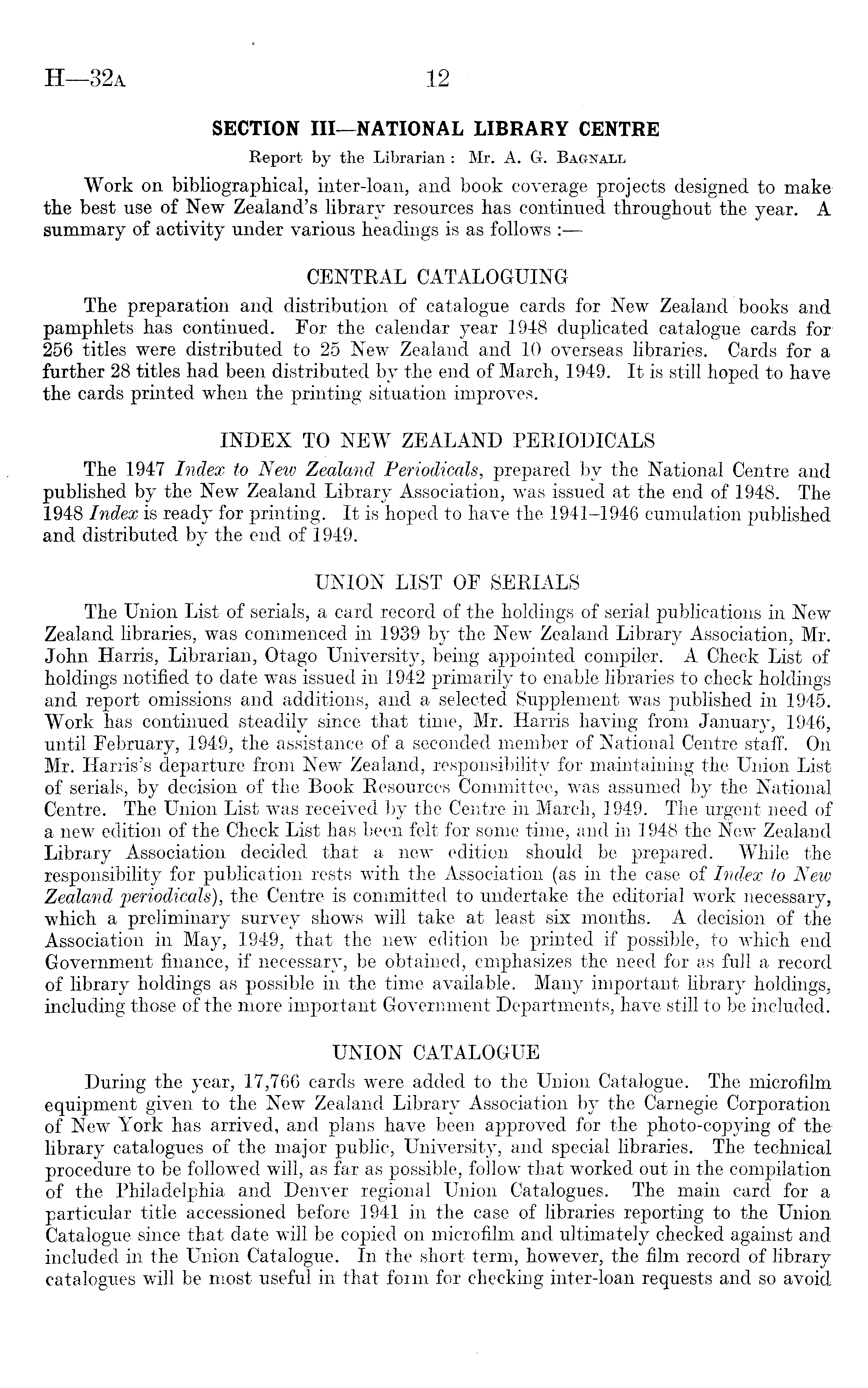 SECTION lII—NATIONAL LIBRARY CENTRE Report by the Librarian : Mr. A. G. Bagnall Work on bibliographical, inter-loan, and book coverage projects designed to make the best use of New Zealand's library resources has continued throughout the year. A summary of activity under various headings is as follows : CENTRAL CATALOGUING The preparation and distribution of catalogue cards for New Zealand books and pamphlets has continued. For the calendar year 1948 duplicated catalogue cards for 256 titles were distributed to 25 New Zealand and 10 overseas libraries. Cards for a further 28 titles had been distributed by the end of March, 1949. It is still hoped to have the cards printed when the printing situation improves. INDEX TO NEW ZEALAND PERIODICALS The 1947 Index to New Zealand Periodicals, prepared by the National Centre and published by the New Zealand Library Association, was issued at the end of 1948. The 1948 Index is ready for printing. It is hoped to have the 1941-1946 cumulation published and distributed by the end of 1949. UNION LIST OF SERIALS The Union List of serials, a card record of the holdings of serial publications in New Zealand libraries, was commenced in 1939 by the New Zealand Library Association, Mr. John Harris, Librarian, Otago University, being appointed compiler. A Check List of holdings notified to date was issued in 1942 primarily to enable libraries to check holdings and report omissions and additions, and a selected Supplement was published in 1945. Work has continued steadily since that time, Mr. Harris having from January, 1946, until February, 1949, the assistance of a seconded member of National Centre staff. On Mr. Harris's departure from New Zealand, responsibility for maintaining the Union List of serials, by decision of the Book Resources Committee, was assumed by the National Centre. The Union List was received by the Centre in March, 1949. The urgent need of a new edition of the Check List has been felt for some time, and in 1948 the New Zealand Library Association decided that a new edition should be prepared. While the responsibility for publication rests with the Association (as in the case of Index to New Zealand periodicals), the Centre is committed to undertake the editorial work necessary,, which a preliminary survey shows will take at least six months. A decision of the Association in May, 1949, that the new edition be printed if possible, to which end Government finance, if necessary, be obtained, emphasizes the need for as full a record of library holdings as possible in the time available. Many important library holdings,, including those of the more important Government Departments, have still to be included.. UNION CATALOGUE During the year, 17,766 cards were added to the Union Catalogue. The microfilm equipment given to the New Zealand Library Association by the Carnegie Corporation of New York has arrived, and plans have been approved for the photo-copying of the library catalogues of the major public, University, and special libraries. The technical procedure to be followed will, as far as possible, follow that worked out in the compilation of the Philadelphia and Denver regional Union Catalogues. The main card for a particular title accessioned before 1941 in the case of libraries reporting to the Union Catalogue since that date will be copied on microfilm and ultimately checked against and included in the Union Catalogue. In the short term, however, the film record of library catalogues will be most useful in that form for checking inter-loan requests and so avoid