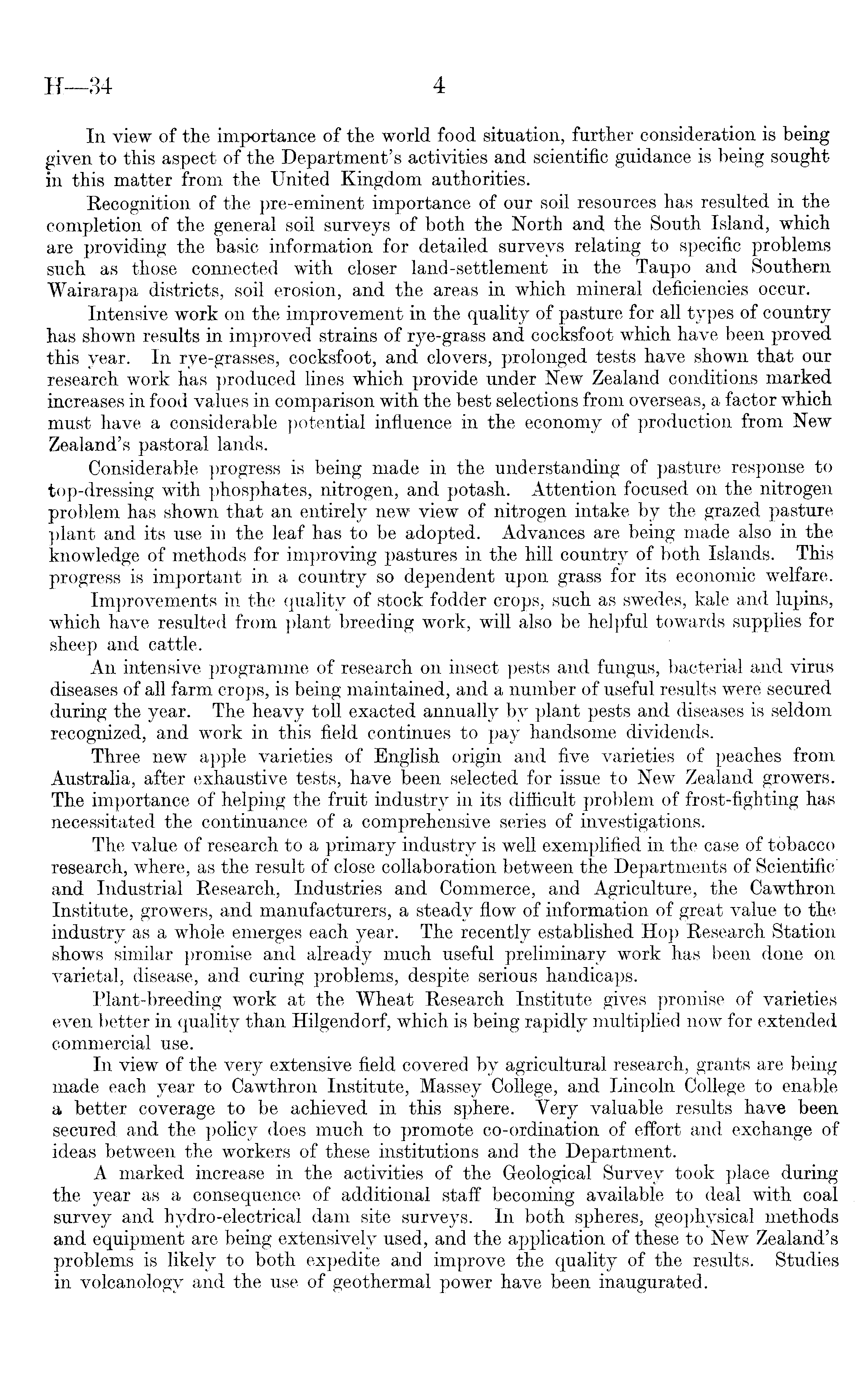 In view of the importance of the world food situation, further consideration is being given to this aspect of the Department's activities and scientific guidance is being sought in this matter from the United Kingdom authorities. Recognition of the pre-eminent importance of our soil resources has resulted in the completion of the general soil surveys of both the North and the South Island, which are providing the basic information for detailed surveys relating to specific problems such as those connected with closer land-settlement in the Taupo and Southern Wairarapa districts, soil erosion, and the areas in which mineral deficiencies occur. Intensive work on the improvement in the quality of pasture for all types of country has shown results in improved strains of rye-grass and cocksfoot which have been proved this year. In rye-grasses, cocksfoot, and clovers, prolonged tests have shown that our research work has produced lines which provide under New Zealand conditions marked increases in food values in comparison with the best selections from overseas, a factor which must have a considerable potential influence in the economy of production from New Zealand's pastoral lands. Considerable progress is being made in the understanding of pasture response to top-dressing with phosphates, nitrogen, and potash. Attention focused on the nitrogen problem has shown that an entirely new view of nitrogen intake by the grazed pasture plant and its use in the leaf has to be adopted. Advances are being made also in the knowledge of methods for improving pastures in the hill country of both Islands. This progress is important in a country so dependent upon grass for its economic welfare. Improvements in the quality of stock fodder crops, such as swedes, kale and lupins, which have resulted from plant breeding work, will also be helpful towards supplies for sheep and cattle. An intensive programme of research on insect pests and fungus, bacterial and virus diseases of all farm crops, is being maintained, and a number of useful results were secured during the year. The heavy toll exacted annually by plant pests and diseases is seldom recognized, and work in this field continues to pay handsome dividends. Three new apple varieties of English origin and five varieties of peaches from Australia, after exhaustive tests, have been selected for issue to New Zealand growers. The importance of helping the fruit industry in its difficult problem of frost-fighting has necessitated the continuance of a comprehensive series of investigations. The value of research to a primary industry is well exemplified in the case of tobacco research, where, as the result of close collaboration between the Departments of Scientific' and Industrial Research, Industries and Commerce, and Agriculture, the Cawthron Institute, growers, and manufacturers, a steady flow of information of great value to the industry as a whole emerges each year. The recently established Hop Research Station shows similar promise and already much useful preliminary work has been done on varietal, disease, and curing problems, despite serious handicaps. Plant-breeding work at the Wheat Research Institute gives promise of varieties even better in quality than Hilgendorf, which is being rapidly multiplied now for extended commercial use. In view of the very extensive field covered by agricultural research, grants are being made each year to Cawthron Institute, Massey College, and Lincoln College to enable a better coverage to be achieved in this sphere. Very valuable results have been secured, and the policy does much to promote co-ordination of effort and exchange of ideas between the workers of these institutions and the Department. A marked increase in the activities of the Geological Survey took place during the year as a consequence of additional staff becoming available to deal with coal survey and hydro-electrical dam site surveys. In both spheres, geophysical methods and equipment are being extensively used, and the application of these to New Zealand's problems is likely to both expedite and improve the quality of the results. Studies in volcanology and the use of geothermal power have been inaugurated.