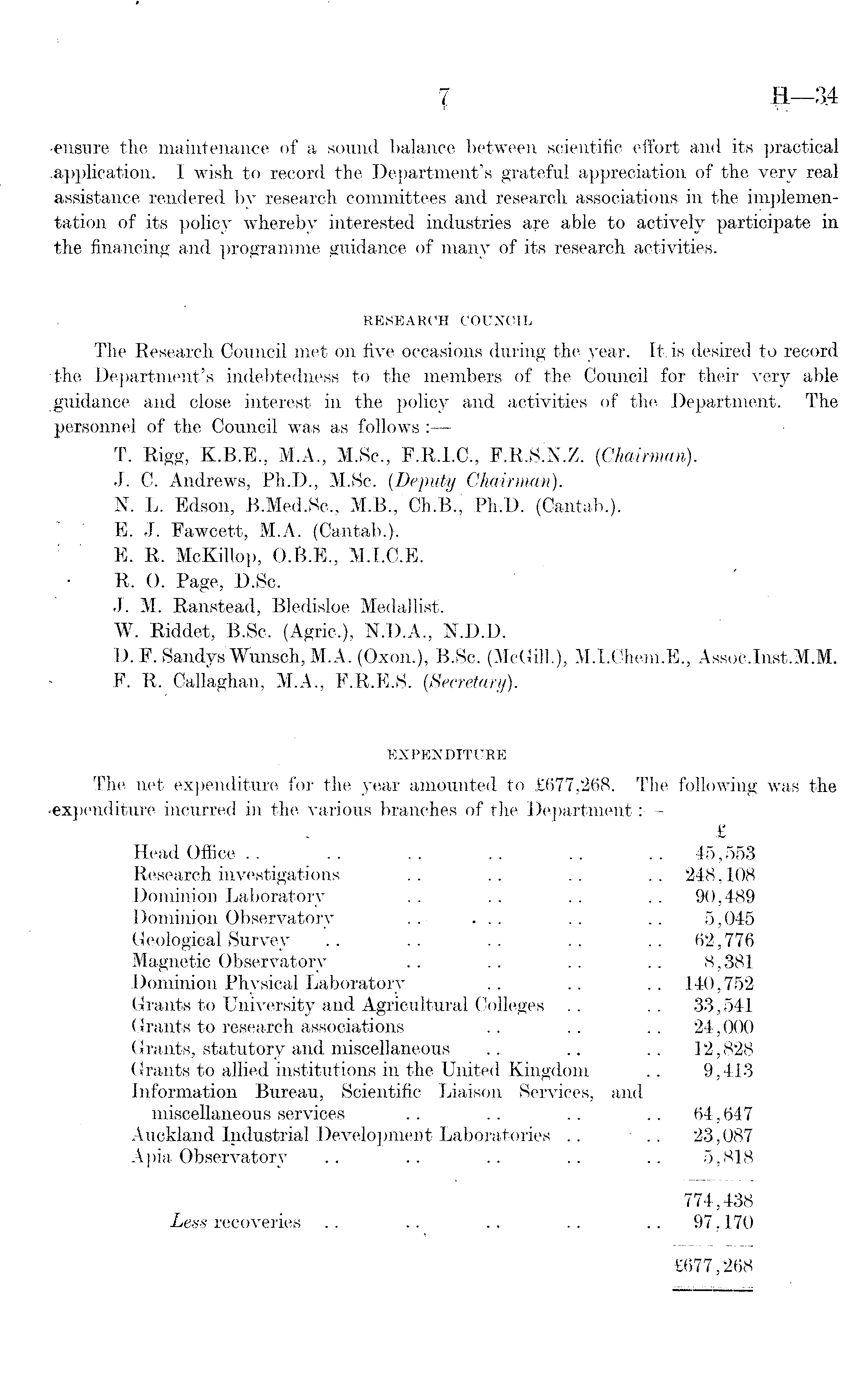 •ensure the maintenance of a sound balance between scientific effort and its practical .application. I AA r ish to record the Department's grateful appreciation of the very real assistance rendered by research committees and research associations in the implementation of its policy whereby interested industries are able to actively participate in the financing and programme guidance of many of its research activities. RESEARCH COUNCIL The Research Council met on five occasions during the year. It. is desired to record the Department's indebtedness to the members of the Council for their very able guidance and close interest in the policy and activities of the Department. The personnel of the Council was as follows : T. Rigg, K.8.E., M.A., M.Sc., F.R.1.C., F.R.S.N.Z. {Chairman). J. C. Andrews, Ph.D., M.Sc. (Deputy Chairman). N. L. Edson, B.Med.Sc., M.8., Ch.B., Ph.D. (Cantab.). E. J. Fawcett, M.A. (Cantab.). E. R. McKillop, 0.8. E., M.I.C.E. R. 0. Page, D.Sc. J. M. Ranstead, Bledisloe Medallist. W. Riddet, B.Sc. (Agric.), N.D.A., N.D.D. D.F. Sandys"Wunsch, M.A. (Oxon.), B.Sc. (McGill.), M.l.Chem.E., AssoC.lnst.M.M. F. R. Callaghan, M.A., F.R.E.S. (Secretary). EXPENDITURE The net expenditure for the year amounted to £677,268. The following was the -expenditure incurred in the various branches of the Department:— £ Head Office .. .. .. .. .. 45,553 Research investigations .. .. .. . . 248,108 Dominion Laboratory .. .. .. .. 90,489 Dominion Observatory . . ... .. .. 5,045 Geological Survey .. .. .. .. .. 62,776 Magnetic Observatory .. .. .. .. 8,381 Dominion Physical Laboratory .. .. .. 140,752 Grants to University and Agricultural Colleges .. .. 33,541 Grants to research associations .. .. . . 24,000 Grants, statutory and miscellaneous .. .. .. 12,828 Grants to allied institutions in the United Kingdom .. 9,413 Information Bureau, Scientific Liaison Services, and miscellaneous services .. .. .. .. 64,647 Auckland Industrial Development Laboratories ~ .. 23,087 Apia Observatory .. .. .. .. .. 5,818 774,438 Less recoveries .. .. .. .. .. 97,170 £677,268