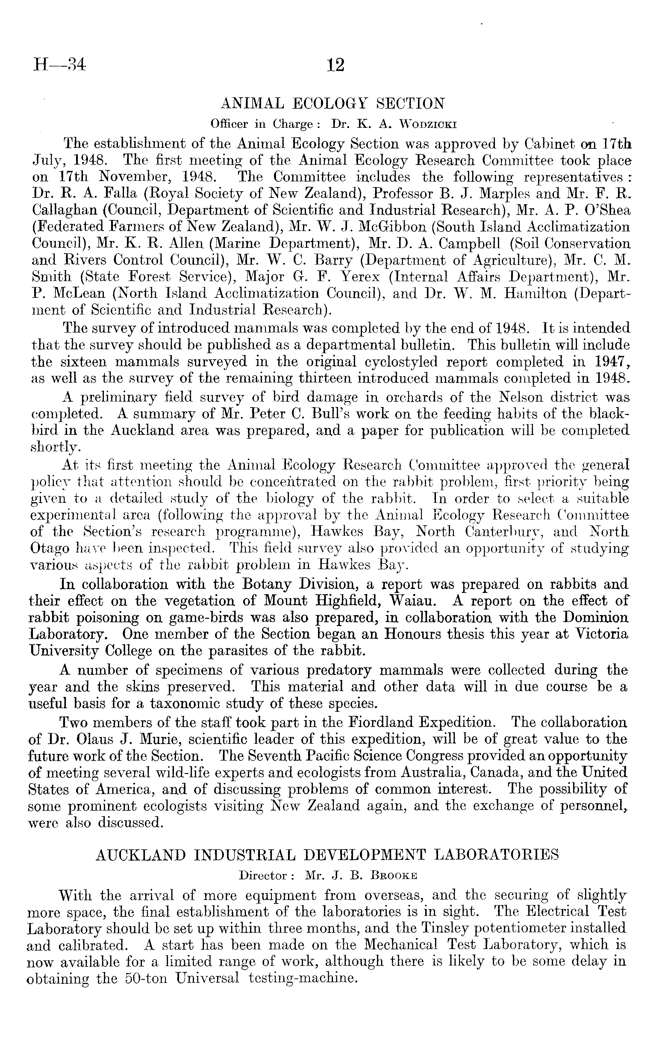 ANIMAL ECOLOGY SECTION Officer in Charge : Dr. K. A. Wodzicki The establishment of the Animal Ecology Section was approved by Cabinet on 17th July, 1948. The first meeting of the Animal Ecology Research Committee took place on 17th November, 1948. The Committee includes the following representatives : Dr. R. A. Falla (Royal Society of New Zealand), Professor B. J. Marples and Mr. F. R. Callaghan {Council, Department of Scientific and Industrial Research), Mr. A. P. O'Shea (Federated Farmers of New Zealand), Mr. W. J. McGibbon (South Island Acclimatization Council), Mr. K. R. Allen (Marine Department), Mr. D. A. Campbell (Soil Conservation and Rivers Control Council), Mr. W. C. Barry (Department of Agriculture), Mr. C. M. Smith (State Forest Service), Major Gr. F. Yerex (Internal Affairs Department), Mr. P. McLean (North Island Acclimatization Council), and Dr. W. M. Hamilton (Department of Scientific and Industrial Research). The survey of introduced mammals was completed by the end of 1948. It is intended that the survey should be published as a departmental bulletin. This bulletin will include tlie sixteen mammals surveyed in the original cyclostyled report completed in 1947, as well as the survey of the remaining thirteen introduced mammals completed in 1948. A preliminary field survey of bird damage in orchards of the Nelson district was completed. A summary of Mr. Peter C. Bull's work on the feeding habits of the blackbird in the Auckland area was prepared, and a paper for publication will be completed shortly. At its first meeting the Animal Ecology Research Committee approved the general policy that attention should be concentrated on the rabbit problem, first priority being given to a detailed study of the biology of the rabbit. In order to select a suitable experimental area (following the approval by the Animal Ecology Research Committee of the Section's research programme), Hawkes Bay, North Canterbury, and North Otago have been inspected. This field survey also provided an opportunity of studying various aspects of the rabbit problem in Hawkes Bay. In collaboration with the Botany Division, a report was prepared on rabbits and their effect on the vegetation of Mount Highfield, Waiau. A report on the effect of rabbit poisoning on game-birds was also prepared, in collaboration with the Dominion Laboratory. One member of the Section began an Honours thesis this year at Victoria University College on the parasites of the rabbit. A number of specimens of various predatory mammals were collected during the year and the skins preserved. This material and other data will in due course be a useful basis for a taxonomic study of these species. Two members of the staff took part in the Fiordland Expedition. The collaboration of Dr. Olaus J. Murie, scientific leader of this expedition, will be of great value to the future work of the Section. The Seventh Pacific Science Congress provided an opportunity of meeting several wild-life experts and ecologists from Australia, Canada, and the United States of America, and of discussing problems of common interest. The possibility of some prominent ecologists visiting New Zealand again, and the exchange of personnel,, were also discussed. AUCKLAND INDUSTRIAL DEVELOPMENT LABORATORIES Director : Mr. J. B. Brooke With the arrival of more equipment from overseas, and the securing of slightly more space, the final establishment of the laboratories is in sight. The Electrical Test Laboratory should be set up within three months, and the Tinsley potentiometer installed and calibrated. A start has been made on the Mechanical Test Laboratory, which is. now available for a limited range of work, although there is likely to be some delay in obtaining the 50-ton Universal testing-machine.