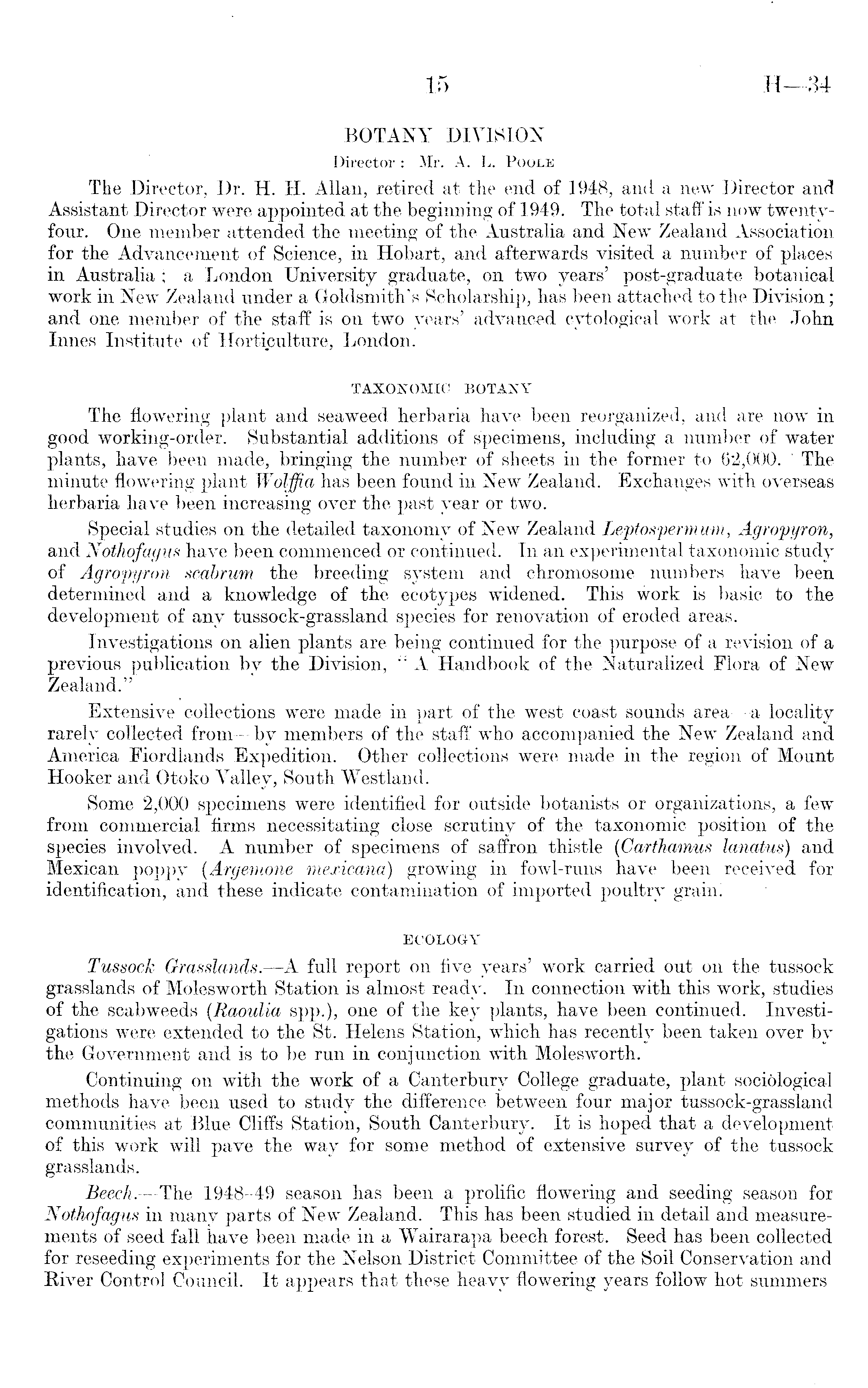 BOTANY DIVISION Director : Mr. A. L. Poole The Director, Dr. H. H. Allan, retired at the end of 1948, and a new Director and Assistant Director were appointed at the beginning of 1949. The total staff is now twentyfour. One member attended the meeting of the Australia and New Zealand Association for the Advancement of Science, in Hobart, and afterwards visited a number of places in Australia ; a London University graduate, on two years' post-graduate botanical work in New Zealand under a Goldsmith's Scholarship, has been attached to the Division; and one member of the staff is on two years' advanced cvtological work at the John Innes Institute of Horticulture, London. TAXONOMIC BOTANY The flowering plant and seaweed herbaria have been reorganized, and are now in good working-order. Substantial additions of specimens, including a number of water plants, have been made, bringing the number of sheets in the former to 62,000. ' The minute flowering plant Wolffia has been found in New Zealand. Exchanges with overseas herbaria have been increasing over the past year or two. Special studies on the detailed taxonomy of New Zealand Leptospermum, Agropyron, and Nothofagus have been commenced or continued. In an experimental taxonomic study of Agropyron scabrum the breeding system and chromosome numbers have been determined and a knowledge of the ecotypes widened. This work is basic to the development of any tussock-grassland species for renovation of eroded areas. Investigations on alien plants are being continued for the purpose of a revision of a previous publication by the Division, " A Handbook of the Naturalized Flora of New Zealand." Extensive collections were made in part of the west coast sounds area —a locality rarely collected from—by members of the staff who accompanied the New Zealand and America Fiordlands Expedition. Other collections were made in the region of Mount Hooker and Otoko Yalley, South Westland. Some 2,000 specimens were identified for outside botanists or organizations, a few from commercial firms necessitating close scrutiny of the taxonomic position of the species involved. A number of specimens of saffron thistle (Carthamus lanatus) and Mexican poppy (Argemone mexicana) growing in fowl-runs have been received for identification, and these indicate contamination of imported poultry grain: ECOLOGY Tussock Grasslands. —A full report on five years' work carried out on the tussock grasslands of Molesworth Station is almost ready. In connection with this work, studies of the scabweeds (Raoulia spp.), one of the key plants, have been continued. Investigations were extended to the St. Helens Station, which has recently been taken over by the Government and is to be run in conjunction with Molesworth. Continuing on with the work of a Canterbury College graduate, plant soci6logical methods have been used to study the difference between four major tussock-grassland communities at Blue Cliffs Station, South Canterbury. It is hoped that a development of this work will pave the way for some method of extensive survey of the tussock grasslands. Beech. —The 1948-49 season has been a prolific flowering and seeding season for Nothofagus in many parts of New Zealand. This has been studied in detail and measurements of seed fall have been made in a Wairarapa beech forest. Seed has been collected for reseeding experiments for the Nelson District Committee of the Soil Conservation and River Control Council. It appears that these heavy flowering years follow hot summers
