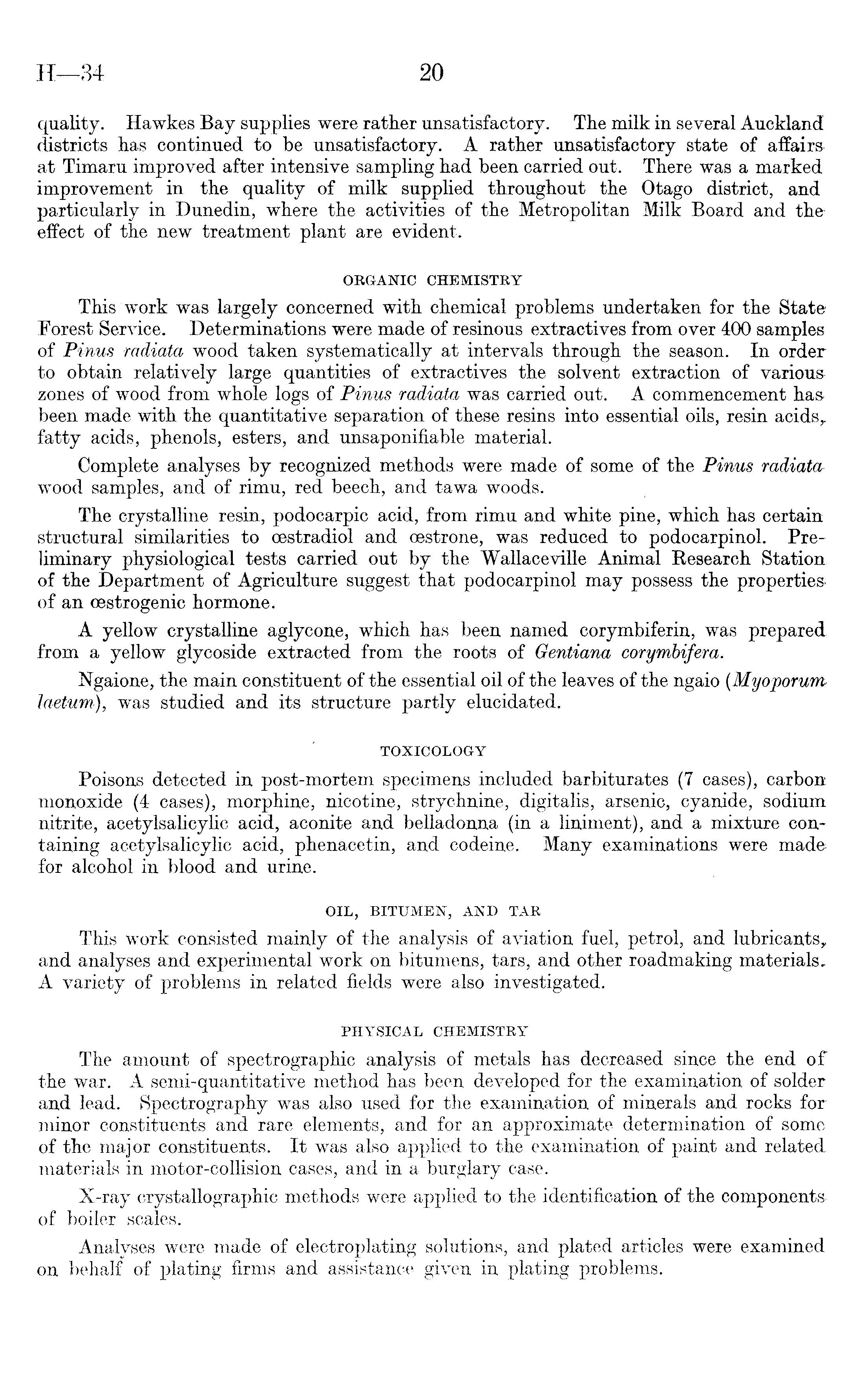 quality. Hawkes Bay supplies were rather unsatisfactory. The milk in several Auckland districts has continued to be unsatisfactory. A rather unsatisfactory state of affairs at Timaru improved after intensive sampling had been carried out. There was a marked improvement in the quality of milk supplied throughout the Otago district, and particularly in Dunedin, where the activities of the Metropolitan Milk Board and the effect of the new treatment plant are evident. ORGANIC CHEMISTRY This work was largely concerned with chemical problems undertaken for the State Forest Service. Determinations were made of resinous extractives from over 400 samples of Pinus radiata wood taken systematically at intervals through the season. In order to obtain relatively large quantities of extractives the solvent extraction of various zones of wood from whole logs of Pinus radiata was carried out. A commencement has. been made with the quantitative separation of these resins into essential oils, resin acids,, fatty acids, phenols, esters, and unsaponifiable material. Complete analyses by recognized methods were made of some of the Pinus radiatawood samples, and of rimu, red beech, and tawa woods. The crystalline resin, podocarpic acid, from rimu and white pine, which has certain structural similarities to cestradiol and cestrone, was reduced to podocarpinol. Preliminary physiological tests carried out by the Wallaceville Animal Research Station of the Department of Agriculture suggest that podocarpinol may possess the properties, of an (estrogenic hormone. A yellow crystalline aglycone, which has been named corymbiferin, was prepared from a yellow glycoside extracted from the roots of Gentiana corymbifera. Ngaione, the main constituent of the essential oil of the leaves of the ngaio (Myoporum laetum), was studied and its structure partly elucidated. TOXICOLOGY Poisons detected in post-mortem specimens included barbiturates (7 cases), carbon monoxide (4 cases), morphine, nicotine, strychnine, digitalis, arsenic, cyanide, sodium nitrite, acetylsalicylic acid, aconite and belladonna (in a liniment), and a mixture containing acetylsalicylic acid, phenacetin, and codeine. Many examinations were made for alcohol in blood and urine. OIL, BITUMEN, AND TAR This work consisted mainly of the analysis of aviation fuel, petrol, and lubricants, and analyses and experimental work on bitumens, tars, and other roadmaking materials. A variety of problems in related fields were also investigated. PHYSICAL CHEMISTRY The amount of spectrographic analysis of metals has decreased since the end of the war. A semi-quantitative method has been developed for the examination of solder and lead. Spectrography was also used for the examination of minerals and rocks for minor constituents and rare elements, and for an approximate determination of some of the major constituents. It was also applied to the examination of paint and related materials in motor-collision cases, and in a burglary case. X-ray crystallographic methods were applied to the identification of the components of boiler scales. Analyses were made of electroplating solutions, and plated articles were examined on behalf of plating firms and assistance given in plating problems.
