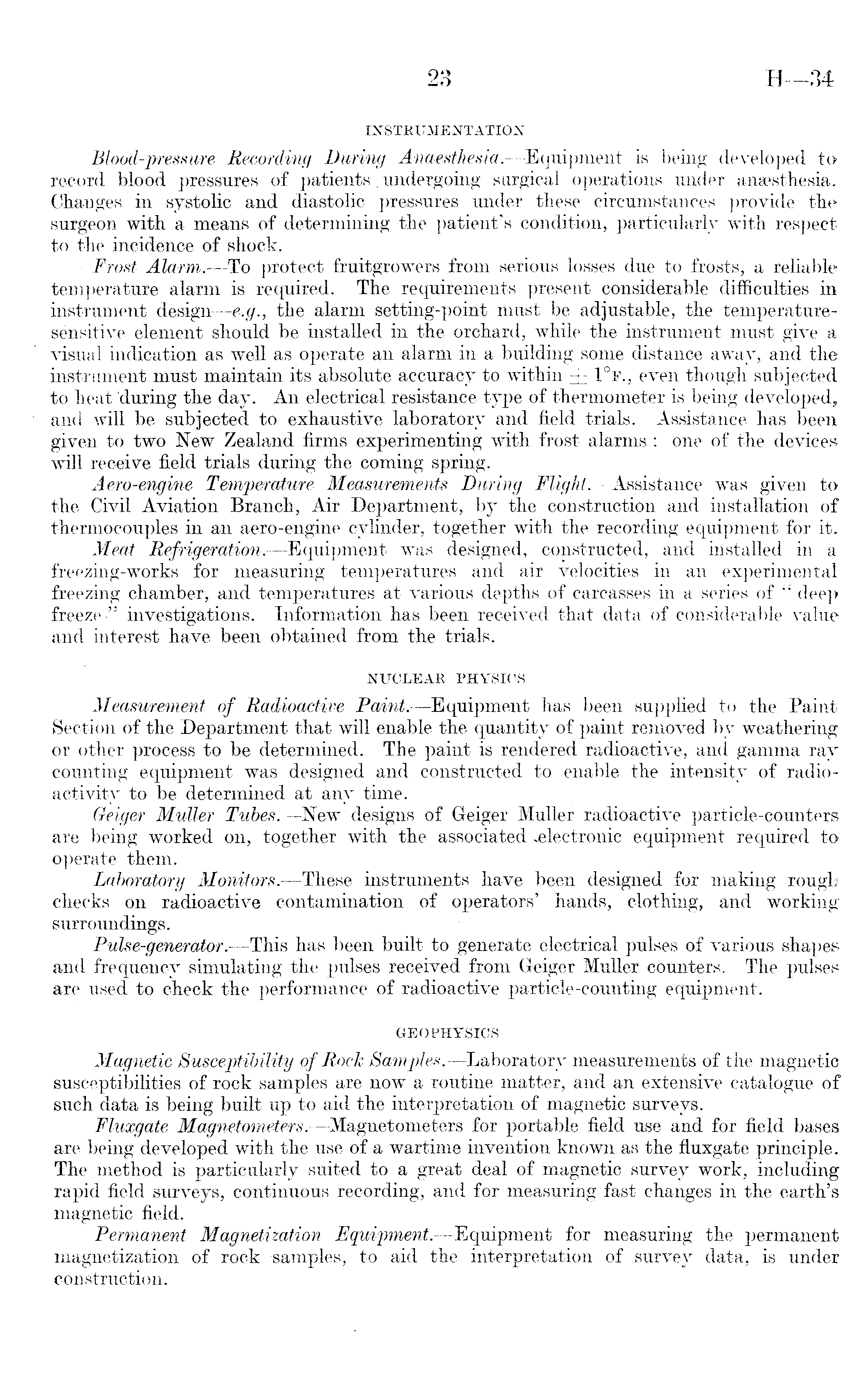 INSTRUMENTATION Blood-pressure Recording During Anaesthesia. —Equipment is being developed to record blood pressures of patients . undergoing surgical operations under anaesthesia. Changes in systolic and diastolic pressures under these circumstances provide the surgeon with a means of determining the patient's condition, particularly with respect to the incidence of shock. Frost Alarm. —To protect fruitgrowers from serious losses due to frosts, a reliable temperature alarm is required. The requirements present considerable difficulties in instrument design—e.g., the alarm setting-point must be adjustable, the temperaturesensitive element should be installed in the orchard, while the instrument must give a visual indication as well as operate an alarm in a building some distance away, and the instrument must maintain its absolute accuracy to within ± I°f., even though subjected to heat during the day. An electrical resistance type of thermometer is being developed, and will be subjected to exhaustive laboratory and field trials. Assistance has been given to two New Zealand firms experimenting with frost alarms ; one of the devices will receive field trials during the coming spring. Aero-engine Temperature Measurements During Flight.—Assistance was given to the Civil Aviation Branch, Air Department, by the construction and installation of thermocouples in an aero-engine cylinder, together with the recording equipment for it. Meat Refrigeration.—Equipment was designed, constructed, and installed in a freezing-works for measuring temperatures and air velocities in an experimental freezing chamber, and temperatures at various depths of carcasses in a series of " deep freeze " investigations. Information has been received that data of considerable value and interest have been obtained from the trials. NUCLEAR PHYSICS Measurement of Radioactive Paint.—Equipment has been supplied to the Paint Section of the Department that will enable the quantity of paint removed by weathering or other process to be determined. The paint is rendered radioactive, and gamma ray counting equipment was designed and constructed to enable the intensity of radioactivity to be determined at any time. Geiger Muller Tubes. —New designs of Geiger Muller radioactive particle-counters are being worked on, together with the associated .electronic equipment required to operate them. Laboratory Monitors. —These instruments have been designed for making rough checks on radioactive contamination of operators' hands, clothing, and working surroundings. Pulse-generator.—This has been built to generate electrical pulses of various shapes and frequency simulating the pulses received from Geiger Muller counters. The pulses are used to check the performance of radioactive particle-counting equipment. GEOPHYSICS Magnetic Susceptibility of Rock Samples.—Laboratory measurements of the magnetic susceptibilities of rock samples are now a routine matter, and an extensive catalogue of such data is being built up to aid the interpretation of magnetic surveys. Fluxgate Magnetometers.—Magnetometers for portable field use and for field bases are being developed with the use of a wartime invention known as the fluxgate principle. The method is particularly suited to a great deal of magnetic survey work, including rapid field surveys, continuous recording, and for measuring fast changes in the earth's magnetic field. Permanent Magnetization Equipment. —Equipment for measuring the permanent magnetization of rock samples, to aid the interpretation of survey data, is under construction.