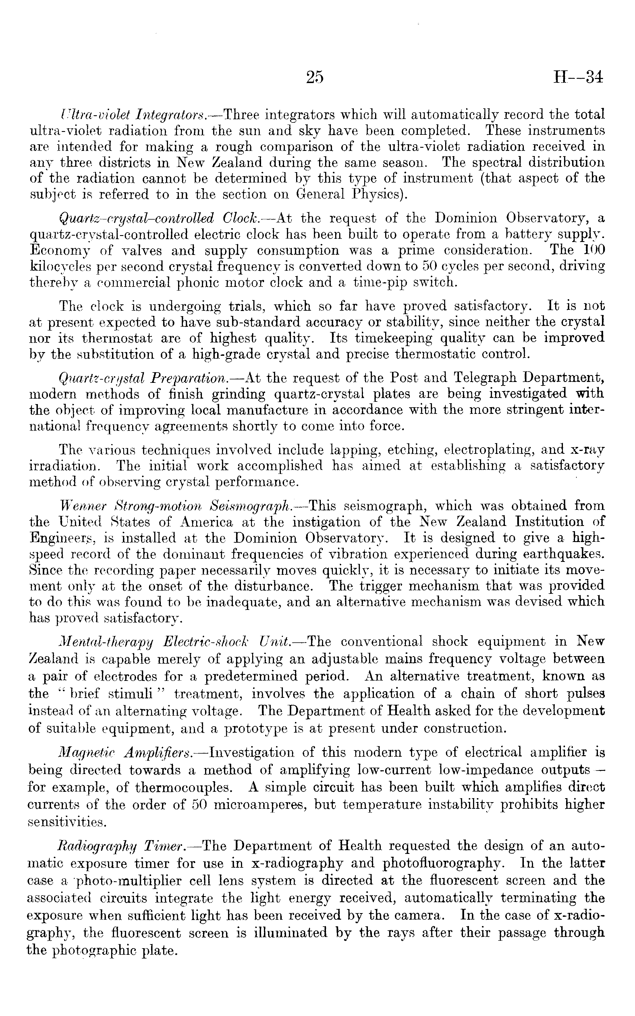 Ultra-violet Integrators.—Three integrators which will automatically record the total ultra-violet radiation from the sun and sky have been completed. These instruments are intended for making a rough comparison of the ultra-violet radiation received in any three districts in New Zealand during the same season. The spectral distribution of the radiation cannot be determined by this type of instrument (that aspect of the subject is referred to in the section on General Physics). Quartz-crystal-controlled Clock.—At the request of the Dominion Observatory, a quartz-crystal-controlled electric clock has been built to operate from a battery supply. Economy of valves and supply consumption was a prime consideration. The 100 kilocycles per second crystal frequency is converted down to 50 cycles per second, driving thereby a commercial phonic motor clock and a time-pip switch. The clock is undergoing trials, which so far have proved satisfactory. It is not at present expected to have sub-standard accuracy or stability, since neither the crystal nor its thermostat are of highest quality. Its timekeeping quality can be improved by the substitution of a high-grade crystal and precise thermostatic control. Quartz-crystal Preparation.—At the request of the Post and Telegraph Department, modern methods of finish grinding quartz-crystal plates are being investigated with the object of improving local manufacture in accordance with the more stringent international frequency agreements shortly to come into force. The various techniques involved include lapping, etching, electroplating, and x-ray irradiation. The initial work accomplished has aimed at establishing a satisfactory method of observing crystal performance. Wenner Strong-motion Seismograph.—This seismograph, which was obtained from the United States of America at the instigation of the New Zealand Institution of Engineers, is installed at the Dominion Observatory. It is designed to give a highspeed record of the dominant frequencies of vibration experienced during earthquakes. Since the recording paper necessarily moves quickly, it is necessary to initiate its movement only at the onset of the disturbance. The trigger mechanism that was provided to do this was found to be inadequate, and an alternative mechanism was devised which has proved satisfactory. Mental-therapy Electric-shock Unit. —The conventional shock equipment in New Zealand is capable merely of applying an adjustable mains frequency voltage between a pair of electrodes for a predetermined period. An alternative treatment, known as the " brief stimuli" treatment, involves the application of a chain of short pulses instead of an alternating voltage. The Department of Health asked for the development of suitable equipment, and a prototype is at present under construction. Magnetic Amplifiers. —Investigation of this modern type of electrical amplifier is being directed towards a method of amplifying low-current low-impedance outputs — for example, of thermocouples. A simple circuit has been built which amplifies direct currents of the order of 50 microamperes, but temperature instability prohibits higher sensitivities. Radiography Timer, —The Department of Health requested the design of an automatic exposure timer for use in x-radiography and photofluorography. In the latter case a photo-multiplier cell lens system is directed at the fluorescent screen and the associated circuits integrate the light energy received, automatically terminating the exposure when sufficient light has been received by the camera. In the case of x-radio-graphy, the fluorescent screen is illuminated by the rays after their passage through the photographic plate.