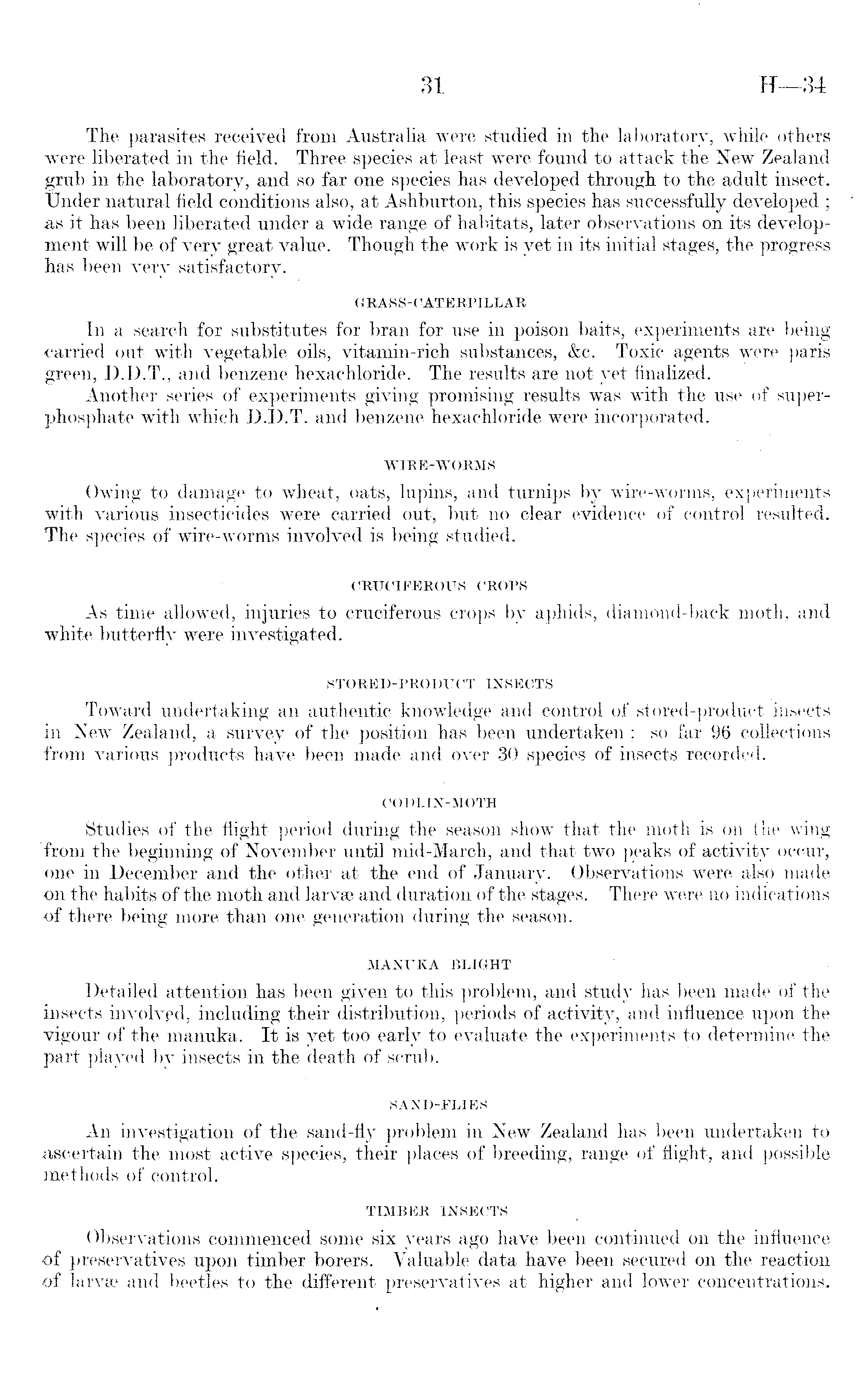 The parasites received from Australia were studied in the laboratory, while others were liberated in the field. Three species at least were found to attack the New Zealand grub in the laboratory, and so far one species has developed through to the adult insect. Under natural field conditions also, at Ashburton, this species has successfully developed ; as it has been liberated under a wide range of habitats, later observations on its development will be of very great value. Though the work is yet in its initial stages, the progress has been very satisfactory. GRASS-CATERPILLAR In a search for substitutes for bran for use in poison baits, experiments are being carried out with vegetable oils, vitamin-rich substances, &c. Toxic agents were paris green, D.D.T., and benzene hexachloride. The results are not yet finalized. Another series of experiments giving promising results was with the use of superphosphate with which D.D.T. and benzene hexachloride were incorporated. WIRE-WORMS Owing to damage to wheat, oats, lupins, and turnips by wire-worms, experiments with various insecticides were carried out, but no clear evidence of control resulted. The species of wire-worms involved is being studied. CRUCIFEROUS CROPS As time allowed, injuries to cruciferous crops by aphids, diamond-back moth, and white butterfly were investigated. STORED-PRODUCT INSECTS Toward undertaking an authentic knowledge and control of stored-product insects in New Zealand, a survey of the position has been undertaken ; so far 96 collections from various products have been made and over 30 species of insects recorded. CODLIN-MOTH Studies of the flight period during the season show that the moth is on the wing from the beginning of November until mid-March, and that two peaks of activity occur, one in December and the other at the end of January. Observations were also made on the habits of the moth and larvae and duration of the stages. There were no indications of there being more than one generation during the season. MANUKA BLIGHT Detailed attention has been given to this problem, and study has been made of the insects involved, including their distribution, periods of activity, and influence upon the vigour of the manuka. It is yet too early to evaluate the experiments to determine the part played by insects in the death of scrub. SAND-PLIES An investigation of the sand-fly problem in New Zealand has been undertaken to ascertain the most active species, their places of breeding, range of flight, and possible methods of control. TIMBER INSECTS Observations commenced some six years ago have been continued on the influence of preservatives upon timber borers. Valuable data have been secured on the-reaction of larvae and beetles to the different preservatives at higher, and lower concentrations.