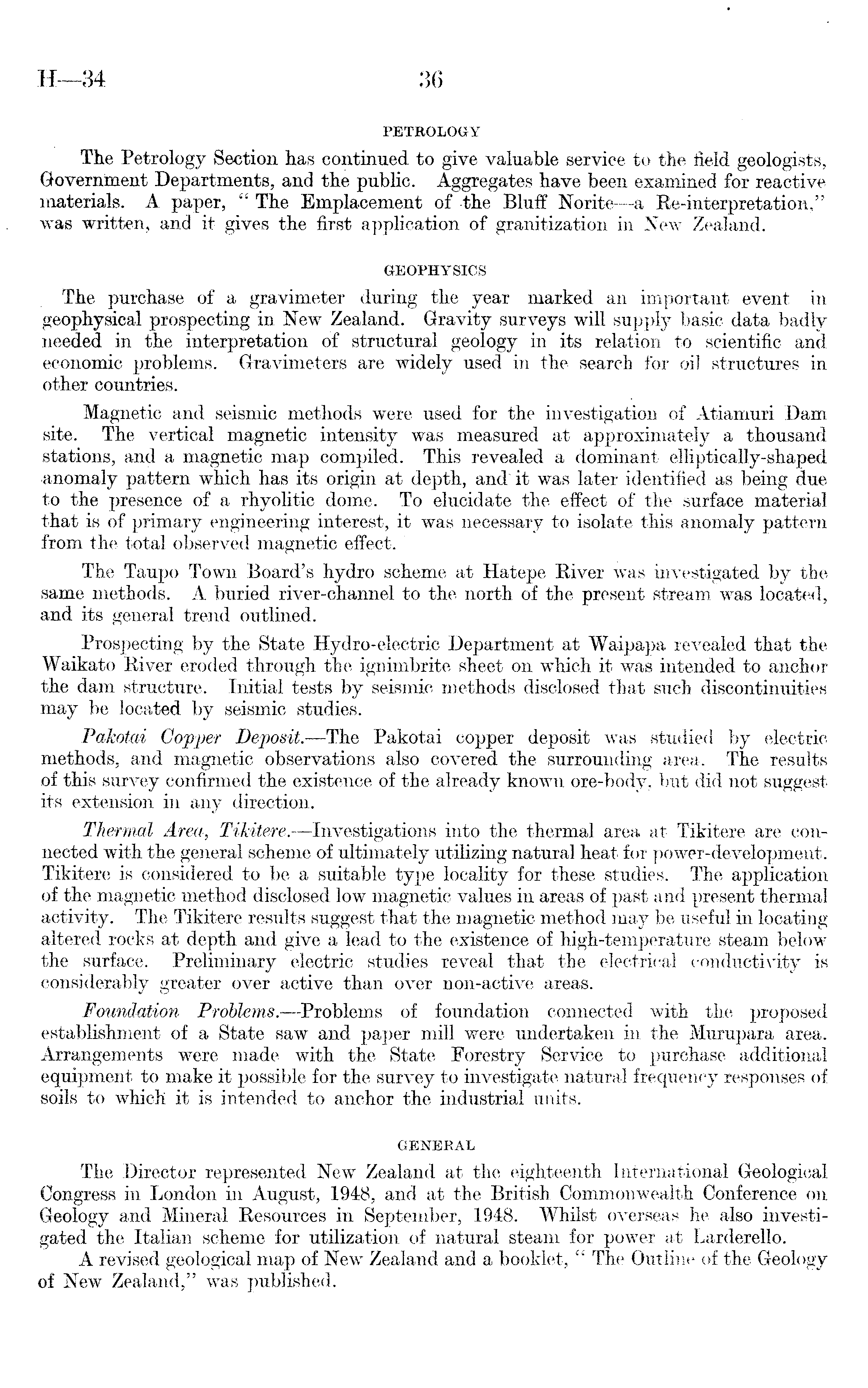 PETROLOGY The Petrology Section has continued to give valuable service to the field geologists, Government Departments, and the public. Aggregates have been examined for reactive materials. A paper, " The Emplacement of the Bluff Norite—a Re-interpretation," was written, and it gives the first application of granitization in New Zealand. GEOPHYSICS The purchase of a gravimeter during the year marked an important event in geophysical prospecting in New Zealand. Gravity surveys will supply basic data badly needed in the interpretation of structural geology in its relation to scientific and economic problems. Gravimeters are widely used in the search for oil structures in other countries. Magnetic and seismic methods were used for the investigation of Atiamuri Dam site. The vertical magnetic intensity was measured at approximately a thousand stations, and a magnetic map compiled. This revealed a dominant elliptically-shaped anomaly pattern which has its origin at depth, and'it was later identified as being due to the presence of a rhyolitic dome. To elucidate the effect of the surface material that is of primary engineering interest, it was necessary to isolate this anomaly pattern from the total observed magnetic effect. The Taupo Town Board's hydro scheme at Hatepe River was investigated by the same methods. A buried river-channel to the north of the present stream was located, and its general trend outlined. Prospecting by the State Hydro-electric Department at Waipapa revealed that the Waikato River eroded through the ignimbrite sheet on which it was intended to anchor the dam structure. Initial tests by seismic methods disclosed that such discontinuities may be located by seismic studies. Pakotai Copper Deposit. —The Pakotai copper deposit was studied by electric methods, and magnetic observations also covered the surrounding area. The results of this survey confirmed the existence of the already known ore-body, but did not suggest its extension in any direction. Thermal Area, Tikitere Investigations into the thermal area at Tikitere are connected with the general scheme of ultimately utilizing natural heat for power-development. Tikitere is considered to be a suitable type locality for these studies. The application of the magnetic method disclosed low magnetic values in areas of past and present thermal activity. The Tikitere results suggest that the magnetic method may be useful in locating altered rocks at depth and give a lead to the existence of high-temperature steam below the surface. Preliminary electric studies .reveal that the electrical conductivity is considerably greater over active than over non-active areas. Foundation Problems. —Problems of foundation connected with the proposed establishment of a State saw and paper mill were undertaken in the Murupara area. Arrangements were made with the State Forestry Service to purchase additional equipment to make it possible for the survey to investigate natural frequency responses of soils to which it is intended to anchor the industrial units. GENERAL The Director represented New Zealand at the eighteenth International Geological Congress in London in August, 1948, and at the British Commonwealth Conference on Geology and Mineral Resources in September, 1948. Whilst overseas he also investigated the Italian scheme for utilization of natural steam for power at Larderello. A revised geological map of New Zealand and a booklet, The Outline of the Geology of New Zealand," was published.