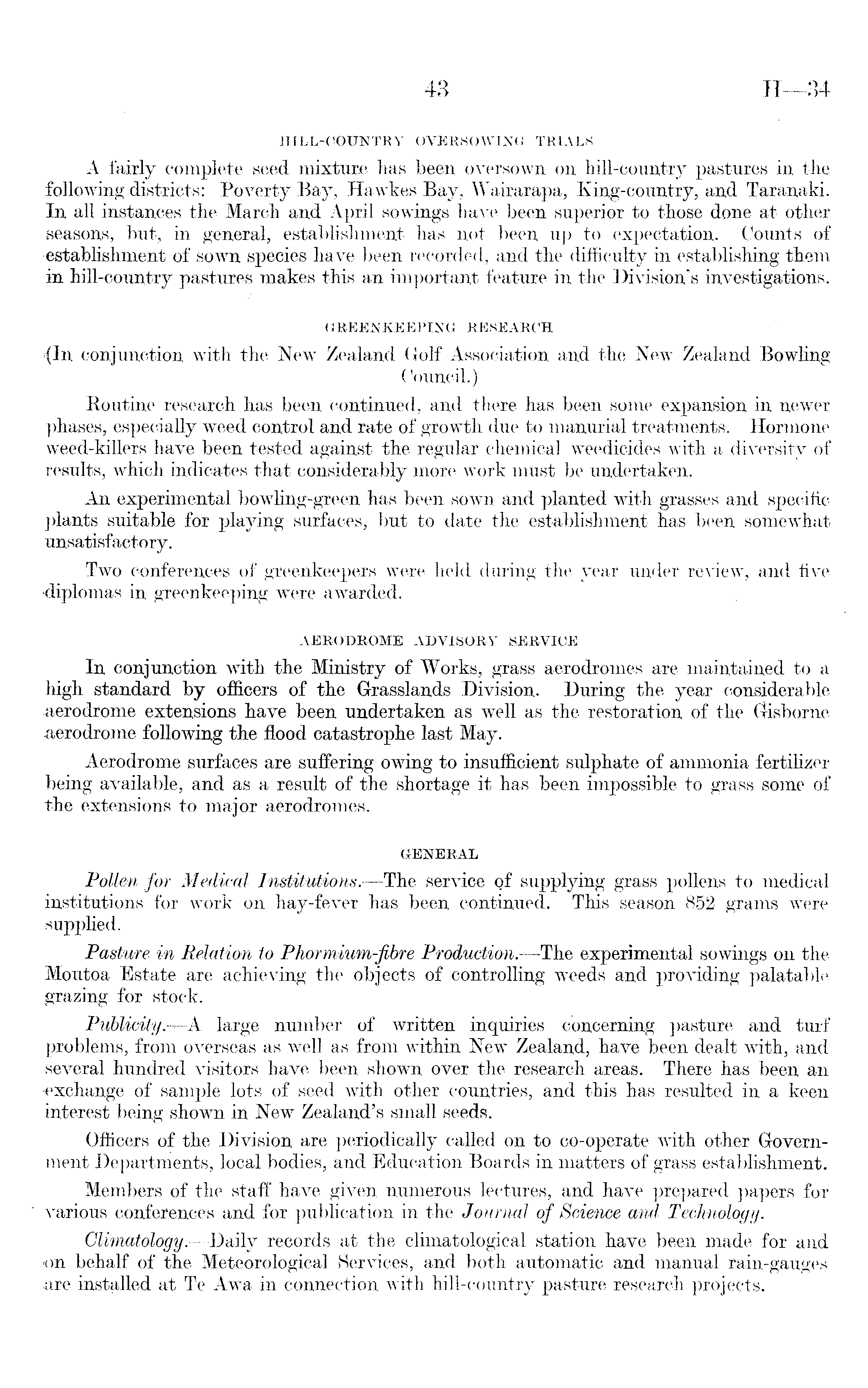 HILL-COUNTRY OVERSOWING TRIALS A fairly complete seed mixture has been oversown on hill-country pastures in the following districts: Poverty Bay, Hawkes Bay, Wairarapa, King-country, and Taranaki. In all instances the March and April sowings have been superior to those done at other seasons, but, in general, establishment has not- been up to expectation. Counts of ■establishment of sown species have been recorded, and the difficulty in establishing them in hill-country pastures makes this an important feature in the Division's investigations. GREENKEEPING RESEARCH <{ln conjunction with the New Zealand Golf Association and the New Zealand Bowling Council.) Routine research has been continued, and there has been some expansion in newer phases, especially weed control and rate of growth due to manurial treatments. Hormone weed-killers have been tested against the regular chemical weedicides with a diversity of results, which indicates that considerably more work must be undertaken. An experimental bowling-green has been sown and planted with grasses and specific plants suitable for playing surfaces, but to date the establishment has been somewhat unsatisfactory. Two conferences of greenkeepers were held during the .year under review, and five diplomas in greenkeeping were awarded. AERODROME ADVISORY SERVICE In conjunction with the Ministry of Works, grass aerodromes are maintained to a high standard by officers of the Grasslands Division. During the year considerable aerodrome extensions have been undertaken as well as the restoration of the Grisborne aerodrome following the flood catastrophe last May. Aerodrome surfaces are suffering owing to insufficient sulphate of ammonia fertilizer being available, and as a result of the shortage it has been impossible to grass some of the extensions to major aerodromes. GENERAL Pollen for Medical Institutions.—The service of supplying grass pollens to medical institutions for work on hay-fever has been continued. This season 852 grams were supplied. Pasture in Relation to Phormium-fibre Production. —The experimental sowings on the Moutoa Estate are achieving the objects of controlling weeds and providing palatable grazing for stock. Publicity—A. large number of written inquiries concerning pasture and turf problems, from overseas as well as from within New Zealand, have been dealt with, and several hundred visitors have been shown over the research areas. There has been an •exchange of sample lots of seed with other countries, and this has resulted in a keen interest being shown in New Zealand's small seeds. Officers of the Division are periodically called on to co-operate with other Government Departments, local bodies, and Education Boards in matters of grass establishment. Members of the staff have given numerous lectures, and have prepared papers for various conferences and for publication in the Journal of Science and Technology. Climatology.—Daily records at the climatological station have been made for and on behalf of the Meteorological Services, and both automatic and manual rain-gauges are installed at Te Awa in connection with hill-country pasture research projects.