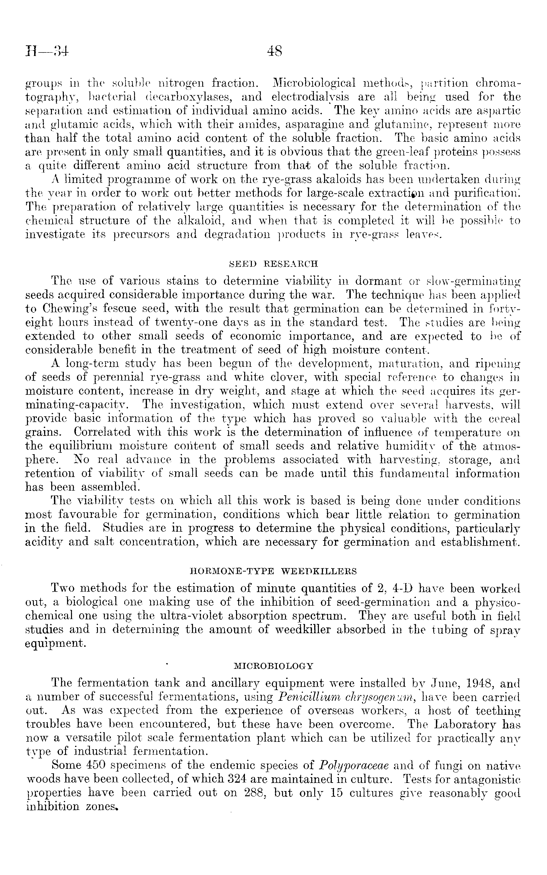 groups in the soluble nitrogen fraction. Microbiological methods, partition chromatography, bacterial decarboxylases, and electrodialysis are all being used for the separation and estimation of individual amino acids. The key amino acids are aspartic and glutamic acids, which with their amides, asparagine and glutamine, represent more than half the total amino acid content of the soluble fraction. The basic amino acids are present in only small quantities, and it is obvious that the green-leaf proteins possess a quite different amino acid structure from that of the soluble fraction. A limited programme of work on the rye-grass akaloids has been undertaken during the year in order to work out better methods for large-scale extraction and purification! The preparation of relatively large quantities is necessary for the determination of the chemical structure of the alkaloid, and when that is completed it will be possible to investigate its precursors and degradation products in rye-grass leaves. SEED RESEARCH The use of various stains to determine viability in dormant or slow-germinating seeds acquired considerable importance during the war. The technique has been applied to Chewing's fescue seed, with the result that germination can be determined in fortyeight hours instead of twenty-one days as in the standard test. The studies are being extended to other small seeds of economic importance, and are expected to be of considerable benefit in the treatment of seed of high moisture content. A long-term study has been begun of the development, maturation, and ripening of seeds of perennial rye-grass and white clover, with special reference to changes in moisture content, increase in dry weight, and stage at which the seed acquires its ger-minating-capacity. The investigation, which must extend over several harvests, will provide basic information of the type which has proved so valuable with the cereal grains. Correlated with this work is the determination of influence of temperature on the equilibrium moisture content of small seeds and relative humidity of the atmosphere. No real advance in the problems associated with harvesting, storage, and retention of viability of small seeds can be made until this fundamental information has been assembled. The viability tests on which all this work is based is being done under conditions most favourable for germination, conditions which bear little relation to germination in the field. Studies are in progress to determine the physical conditions, particularly acidity and salt concentration, which are necessary for germination and establishment. HORMONE-TYPE WEEDKILLERS Two methods for the estimation of minute quantities of 2, 4-D have been worked out, a biological one making use of the inhibition of seed-germination and a physicochemical one using the ultra-violet absorption spectrum. They are useful both in field studies and in determining the amount of weedkiller absorbed in the tubing of spray equipment. MICROBIOLOGY The fermentation tank and ancillary equipment were installed by June, 1948, and a number of successful fermentations, using Penicillium chrysogenum, have been carried out. As was expected from the experience of overseas workers, a host of teething troubles have been encountered, but these have been overcome. The Laboratory has now a versatile pilot scale fermentation plant which can be utilized for practically any type of industrial fermentation. Some 450 specimens of the endemic species of Polyporaceae and of fungi on native woods have been collected, of which 324 are maintained in culture. Tests for antagonistic properties have been carried out on 288. but only 15 cultures give reasonably good inhibition zones.