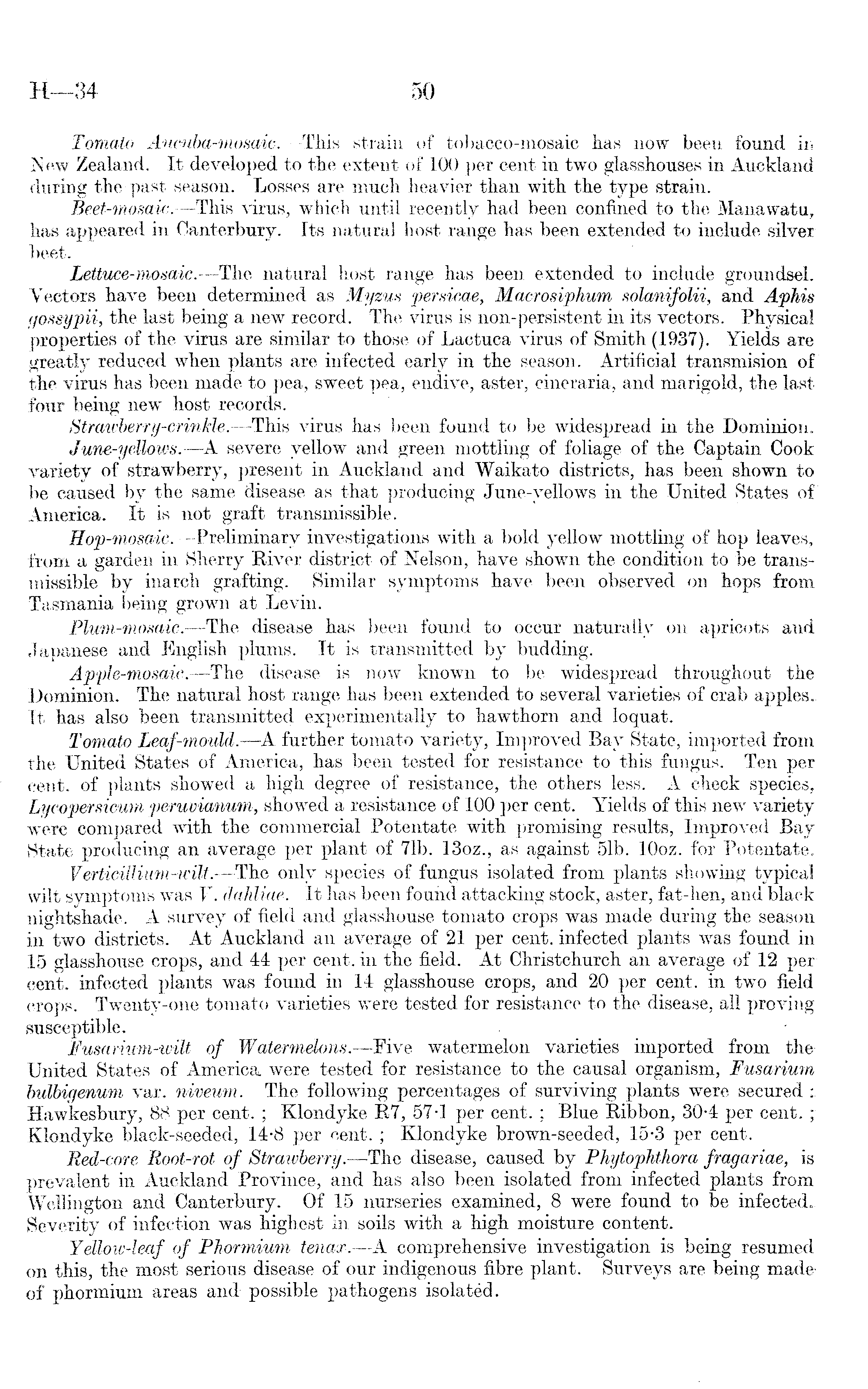 Tomato Aucuba-mosaic. —This strain of tobacco-mosaic has now been found in New Zealand. It developed to the extent of 100 per cent in two glasshouses in Auckland during the past season. Losses are much heavier than with the type strain. Beet-mosaic. —This virus, which until recently had been confined to the Manawatu, has appeared in Canterbury. Its natural host range has been extended to include silver beet. Lettuce-mosaic. —The natural host range has been extended to include groundsel. Vectors have been determined as Myzus persicae, Macrosiphum solanifolii, and Aphis gossypii, the last being a new record. The virus is non-persistent in its vectors. Physical properties of the virus are similar to those of Lactuca virus of Smith (1937). Yields are greatly reduced when plants are infected early in the season. Artificial transmision of the virus has been made to pea, sweet pea, endive, aster, cineraria, and marigold, the last four being new host records. Strawberry-crinkle.—This virus has been found to be widespread in the Dominion. June-yellows. —A severe yellow and green mottling of foliage of the Captain Cook variety of strawberry, present in Auckland and Waikato districts, has been shown to be caused by the same disease as that producing June-yellows in the United States of America. It is not graft transmissible. Hop-mosaic. —Preliminary investigations with a bold yellow mottling of hop leaves, from a garden in Sherry River district of Nelson, have shown the condition to be transmissible by inarch grafting. Similar symptoms have been observed on hops from Tasmania being grown at Levin. Plum-mosaic. —The disease has been found to occur naturally on apricots and Japanese and English plums. It is transmitted by budding. Apple-mosaic. —The disease is now known to be widespread throughout the Dominion. The natural host range has been extended to several varieties of crab apples.. It has also been transmitted experimentally to hawthorn and loquat. Tomato Leaf-mould. —A further tomato variety, Improved Bay State, imported from the United States of America, has been tested for resistance to this fungus. Ten per cent, of plants showed a high degree of resistance, the others less. A check species, Lycopersicum peruvianum, showed a resistance of 100 per cent. Yields of this new variety were compared with the commercial Potentate with promising results, Improved Bay State producing an average per plant of 71b. 130z., as against 51b. lOoz. for Potentate. Verticillium-wilt. —The only species of fungus isolated from plants showing typical wilt symptoms was V. dahliae. It has been found attacking stock, aster, fat-hen, and black nightshade. A survey of field and glasshouse tomato crops was made during the season in two districts. At Auckland an average of 21 per cent, infected plants was found in 15 glasshouse crops, and 44 per cent, in the field. At Christchurch an average of 12 per cent, infected plants was found in 14 glasshouse crops, and 20 per cent, in two field crops. Twenty-one tomato varieties were tested for resistance .to the disease, all proving susceptible. Fusarium-wilt of Watermelons.—Five watermelon varieties imported from the United States of America, were tested for resistance to the qausal organism, Fusarium bulbigenum var. niveum. The following percentages of surviving plants were secured Hawkesbury, 88 per cent. ; Klondyke R7, 57-1 per cent. ; Blue Ribbon, 30-4 per cent. Klondyke black-seeded, 14-8 per cent. ; Klondyke brown-seeded, 15-3 per cent. Red-core Root-rot of Strawberry. —The disease, caused by Phytophthora fragariae, is prevalent in Auckland Province, and has also been isolated from infected plants from Wellington and Canterbury. Of 15 nurseries examined, 8 were found to be infectedSeverity of infection was highest in soils with a high moisture content. Yellow-leaf of Phormium tenax. —A comprehensive investigation is being resumed on this, the most serious disease of our indigenous fibre plant. Surveys are being madeof phormium areas and possible pathogens isolated.