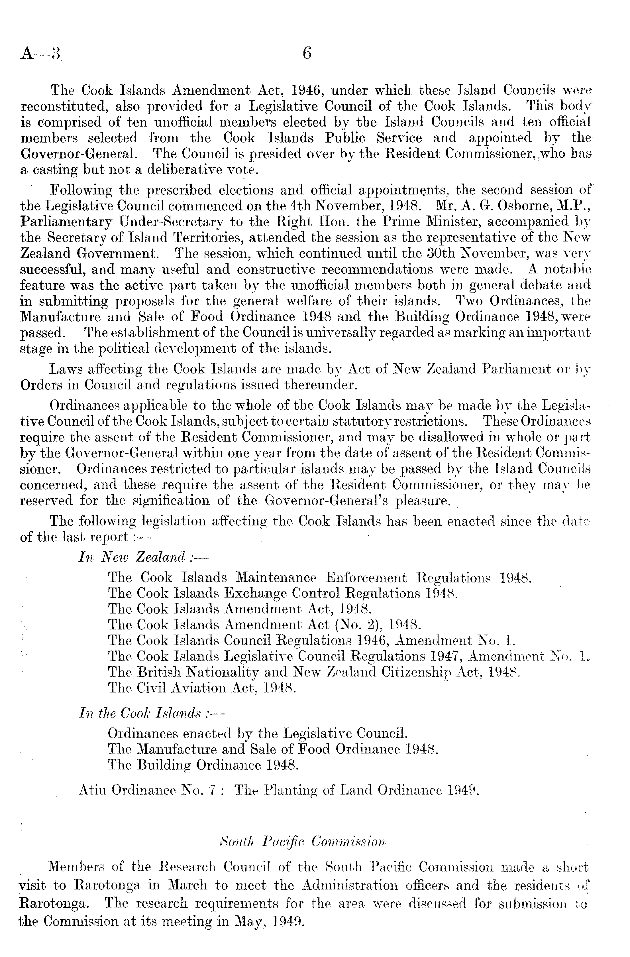 The Cook Islands Amendment Act, 1946, under which these Island Councils were reconstituted, also provided for a Legislative Council of the Cook Islands. This body is comprised of ten unofficial members elected by the Island Councils and ten official members selected from the Cook Islands Public Service and appointed by the Governor-General. The Council is presided over by the Resident Commissioner, ,who has a casting but not a deliberative vote. Following the prescribed elections and official appointments, the second session of the Legislative Council commenced on the 4th November, 1948. Mr. A. G. Osborne, M.P., Parliamentary Under-Secretary to the Right Hon. the Prime Minister, accompanied by the Secretary of Island Territories, attended the session as the representative of the New Zealand Government. The session, which continued until the 30th November, was very successful, and many useful and constructive recommendations were made. A notable feature was the active part taken by the unofficial members both in general debate and in submitting proposals for the general welfare of their islands. Two Ordinances, the Manufacture and Sale of Food Ordinance 1948 and the Building Ordinance 1948, were passed. The establishment of the Council is universally regarded as marking an important stage in the political development of the islands. Laws affecting the Cook Islands are made by Act of New Zealand Parliament or by Orders in Council and regulations issued thereunder. Ordinances applicable to the whole of the Cook Islands may be made by the Legislative Council of the Cook Islands, subject to certain statutory restrictions. These Ordinances require the assent of the Resident Commissioner, and may be disallowed in whole or part by the Governor-General within one year from the date of assent of the Resident Commissioner. Ordinances restricted to particular islands may be passed by the Island Councils concerned, and these require the assent of the Resident Commissioner, or they may be reserved for the signification of the Governor-General's pleasure. The following legislation affecting the Cook Islands has been enacted since the date of the last report:— In New Zealand : The Cook Islands Maintenance Enforcement Regulations 1948. The Cook Islands Exchange Control Regulations 1948. The Cook Islands Amendment Act, 1948. The Cook Islands Amendment Act (No. 2), 1948. The Cook Islands Council Regulations 1946, Amendment No. 1. The Cook Islands Legislative Council Regulations 1947, Amendment No. 1, The British Nationality and New Zealand Citizenship Act, 1948. The Civil Aviation Act, 1948. In the CooJc Islands : Ordinances enacted by the Legislative Council. The Manufacture and Sale of Food Ordinance 1948. The Building Ordinance 1948. Atiu Ordinance No. 7 : The Planting of Land Ordinance 1949. South Pacific Commission Members of the Research Council of the South Pacific Commission made a short visit to Rarotonga in March to meet the Administration officers and the residents of Rarotonga. The research requirements for the area were discussed for submission to the Commission at its meeting in May, 1949.
