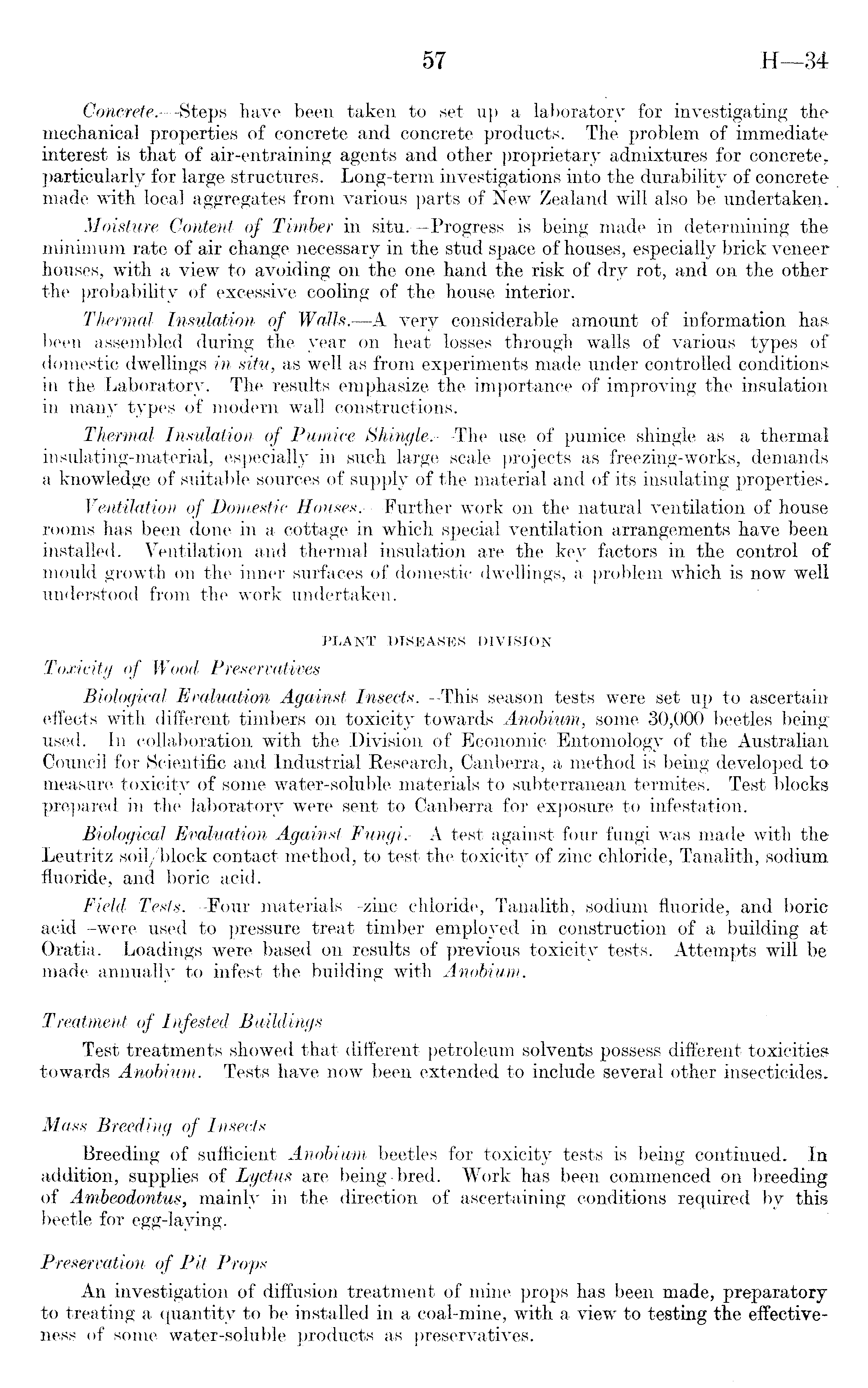 Concrete.—Steps have been taken to set up a laboratory for investigating the mechanical properties of concrete and concrete products. The problem of immediate interest is that of air-entraining agents and other proprietary admixtures for concrete, particularly for large structures. Long-term investigations into the durability of concrete made with local aggregates from various parts of New Zealand will also be undertakenMoisture Content of Timber in situ.—Progress is being made in determining the minimum rate of air change necessary in the stud space of houses, especially brick veneer houses, with a view to avoiding on the one hand the risk of dry rot, and on the other the probability of excessive cooling of the house interior. Thermal Insulation of Walls.—A very considerable amount of information has been assembled during the year on heat losses through walls of various types of domestic dwellings in situ, as well as from experiments made under controlled conditions in the Laboratory. The results emphasize the importance of improving the insulation in many types of modern wall constructions. Thermal Insulation of Pumice Shingle.—The use of pumice shingle as a thermal insulating-material, especially in such large scale projects as freezing-works, demands a knowledge of suitable sources of supply of the material and of its insulating properties. Ventilation of Domestic Houses.—Further work on the natural ventilation of house rooms has been done in a cottage in which special ventilation arrangements have been installed. Ventilation and thermal insulation are the key factors in the control of mould growth on the inner surfaces of domestic dwellings, a problem which is now well understood from the work undertaken. plant diseases division Toxicity of Wood Preservatives Biological Evaluation Against Insects.—This season tests were set up to ascertain effects with different timbers on toxicity towards Anobium, some 30,000 beetles beingused. In collaboration with the Division of Economic Entomology of the Australian Council for Scientific and Industrial Kesearch, Canberra, a method is being developed to measure toxicity of some water-soluble materials to subterranean termites. Test blocks prepared in the laboratory were sent to Canberra for exposure to infestation. Biological Evaluation Against Fungi.—A test against four fungi was made with the Leutritz soil/block contact method, to test the toxicity of zinc chloride, Tanalith, sodium fluoride, and boric acid. Field Tests. - Four materials —zinc chloride, Tanalith, sodium fluoride, and boric acid—were used to pressure treat timber employed in construction of a building at Oratia. Loadings were based on results of previous toxicity tests. Attempts will be made annually to infest the building with Anobium. Treatment of Infested Buildings Test treatments showed that different petroleum solvents possess different toxicities towards Anobium. Tests have now been extended to include several other insecticides. Mass Breeding of Insects Breeding of sufficient Anobium beetles for toxicity tests is being continued. In addition, supplies of Lyctus are being bred. Work has been commenced on breeding of Ambeodontus, mainly in the direction of ascertaining conditions required by this beetle for egg-laying. Preservation of Pit Props An investigation of diffusion treatment of mine props has been made, preparatory to treating a quantity to be installed in a coal-mine, with a view to testing the effectiveness of some water-soluble products as preservatives.