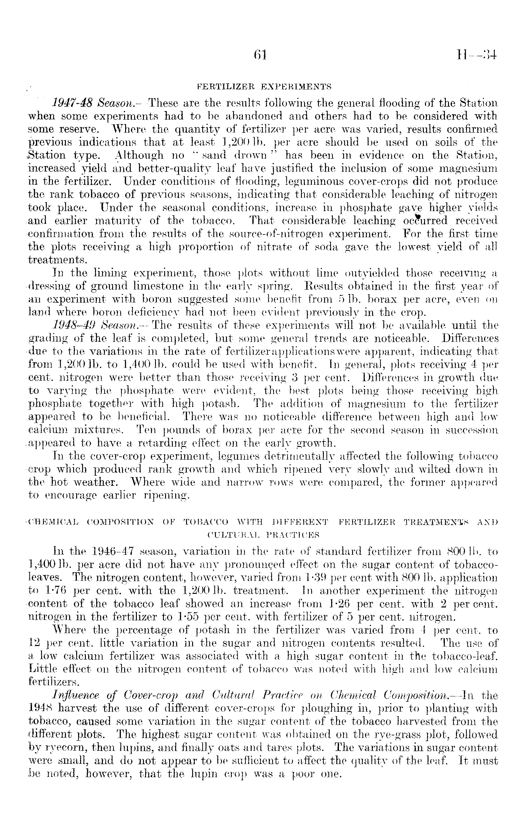 . • . FERTILIZER EXPERIMENTS 1947-48 Season. —These are the results following the general flooding of the Station when some experiments had to be abandoned and others had to be considered with some reserve. Where the quantity of fertilizer per acre was varied, results confirmed previous indications that at least 1,2001b. per acre should be used on soils of the type. Although no sand drown " has been in evidence on the Station, increased yield and better-quality leaf have justified the inclusion of some magnesium in the fertilizer. Under conditions of flooding, leguminous cover-crops did not produce the rank tobacco of previous seasons, indicating that considerable leaching of nitrogen took place. Under the seasonal conditions, increase in phosphate gave higher yields and earlier maturity of the tobacco. That considerable leaching occurred received confirmation from the results of the source-of-nitrogen experiment. For the first time the plots receiving a high proportion of nitrate of soda gave the lowest yield of all treatments. In the liming experiment, those plots without lime outyielded those receiving a -dressing of ground limestone in the early spring. Results obtained in the first year of an experiment with boron suggested some benefit from 5 lb. borax per acre, even on land where boron deficiency had not been evident previously in the crop. 1948-49 Season. —The results of these experiments will not be available until the grading of the leaf is completed, but some general trends are noticeable. Differences due to the variations in the rate of fertilizer applications were apparent, indicating that from 1,2001b. to 1,4001b. could be used with benefit. In general, plots receiving 4 per cent, nitrogen were better than those receiving 3 per cent. Differences in growth due to varying the phosphate were evident, the best plots being those receiving high phosphate together with high potash. The addition of magnesium to the fertilizer appeared to be beneficial. There was no noticeable difference between high and low calcium mixtures. Ten pounds of borax per acre for the second season in succession .appeared to have a retarding effect on the early growth. In the cover-crop experiment, legumes detrimentally affected the following tobacco crop which produced rank growth and which ripened very slowly and wilted down in the hot weather. Where wide and narrow rows were compared, the former appeared to encourage earlier ripening. | CHEMICAL COMPOSITION OF TOBACCO WITH DIFFERENT FERTILIZER TREATMENTS AND CULTURAL PRACTICES In the 1946-47 season, variation in the rate of standard fertilizer from 8001b. to 1,400 lb. per acre did not have any pronounced effect on the sugar content of tobaccoleaves. The nitrogen content, however, varied from 1*39 per cent with 800 lb. application to 1-76 per cent, with the 1,2001b. treatment. In another experiment the nitrogen content of the tobacco leaf showed an increase from 1-26 per cent, with 2 percent, nitrogen in the fertilizer to 1-55 per cent, with fertilizer of 5 per cent, nitrogen. Where the percentage of potash in the fertilizer was varied from 4 per cent, to 12 per cent, little variation in the sugar and nitrogen contents resulted. The use of a low calcium fertilizer was associated with a high sugar content in the tobacco-leaf. Little effect on the nitrogen content of tobacco was noted with high and low calcium fertilizers. Influence of Cover-crop and Cultural Practice on Chemical Composition.—ln the 1948 harvest the use of different cover-crops for ploughing in, prior to planting with tobacco, caused some variation in the sugar content of the tobacco harvested from the different plots. The highest sugar content was obtained on the rye-grass plot, followed by ryecorn, then lupins, and finally oats and tares plots. The variations in sugar content were small, and do not appear to be sufficient to affect the quality of the leaf. It must be noted, however, that the lupin crop was a poor one.