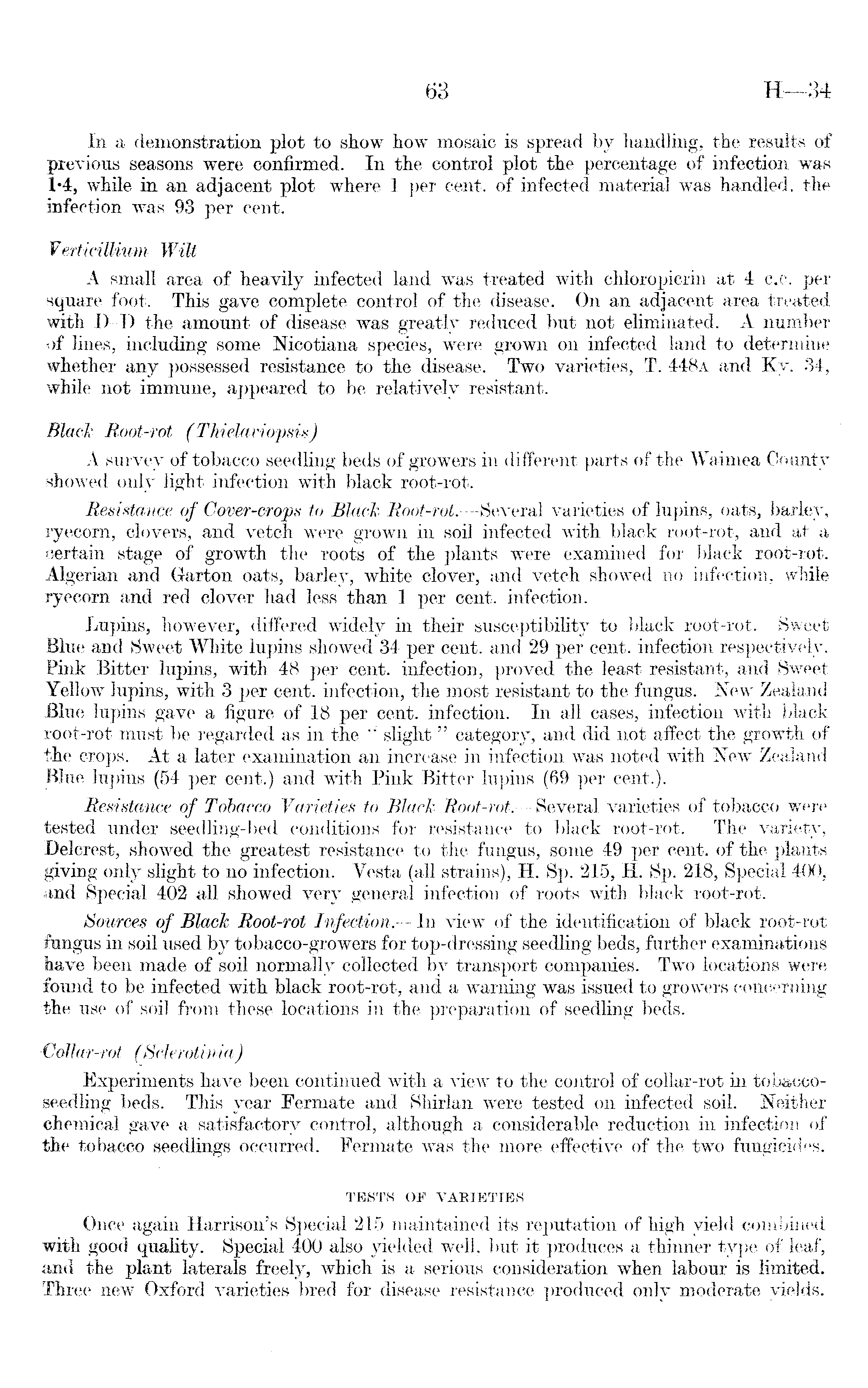 In a demonstration plot to show how mosaic is spread by handling, the results of previous seasons were confirmed. In the control plot the percentage of infection was I*4, while in an adjacent plot where 1 per cent, of infected material was handled, the infection was 93 per cent. Verticillium Wilt A small area of heavily infected land was treated with chloropicrin at 4 c.c. per square foot. This gave complete control of the disease. On an adjacent area treated with D-D the amount of disease was greatly reduced but not eliminated. A number of lines, including some Nicotiana species, were grown on infected land to determine whether any possessed resistance to the disease. Two varieties, T. 448 a and Kv. 34, while not immune, appeared to be relatively resistant. Black Root-rot (Thielaviopsis) A survey of tobacco seedling beds of growers in different parts of the Waimea County showed only light infection with black root-rot. Resistance of Cover-crops to Black Root-rot. —Several varieties of lupins, oats, barley, ryecorn, clovers, and vetch were grown in soil infected with black root-rot, and at a certain stage of growth the roots of the plants were examined for black root-rot. Algerian and Garton oats, barley, white clover, and vetch showed no infection, while ryecorn and red clover had less than 1 per cent, infection. Lupins, however, differed widely in their susceptibility to black root-rot. Sweet Blue and Sweet White lupins showed 34 per cent, and 29 per cent, infection respectively. Pink Bitter lupins, with 48 per cent, infection, proved the least resistant, and Sweet Yellow lupins, with 3 per cent, infection, the most resistant to the fungus. New Zealand Blue lupins gave a figure of 18 per cent, infection. In all cases, infection with black root-rot must be regarded as in the " slight " category, and did not affect the growth of the crops. At a later examination an increase in infection was noted with New Zealand Blue lupins (54 per cent.) and with Pink Bitter lupins (69 per cent.). Resistance of Tobacco Varieties to Black Root-rot. —Several varieties of tobacco were tested under seedling-bed conditions for resistance to. black root-rot. The variety, Delcrest, showed the greatest resistance to the fungus, some 49 per cent, of the plants giving only slight to no infection. Vesta (all strains), H. Sp. 215, H. Sp. 218, Special 400, and Special 402 all showed very general infection of roots with black root-rot. Sources of Black Root-rot Infection. —In view of the identification of black root-rot fungus in soil used by tobacco-growers for top-dressing seedling beds, further examinations have been made of soil normally collected by transport companies. Two locations were found to be infected with black root-rot, and a warning was issued to growers concerning' the use of soil from these locations in the preparation of seedling beds. -Collar-rot (Sclerotinia) Experiments have been continued with a view to the control of collar-rot in tobaccoseedling beds. This year Fermate and Shirlan were tested on infected soil. Neither chemical gave a satisfactory control, although a considerable reduction in infection of the tobacco seedlings occurred. Fermate was the more effective of the two fungicides. TESTS OF VARIETIES Once again Harrison's Special 215 maintained its reputation of high yield combined with good quality. Special 400 also yielded well, but it produces a thinner type of leaf, and the plant laterals freely, which is a serious consideration when labour is limited. Three new Oxford varieties bred for disease resistance produced only moderate yields.