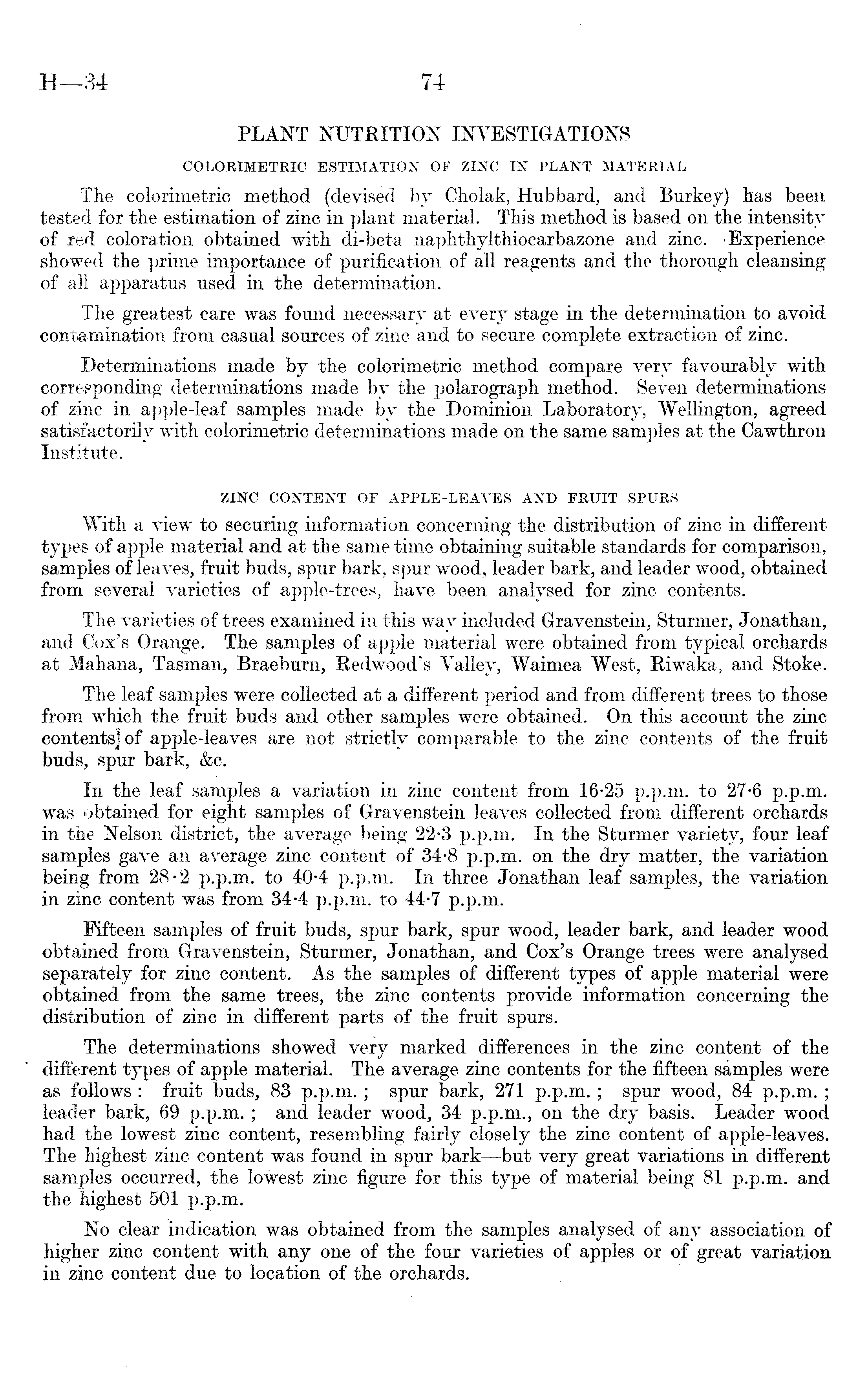 PLANT NUTRITION INVESTIGATIONS COLORIMETRIC ESTIMATION OF ZINC IN PLANT MATERIAL The colorimetric method (devised by Cholak, Hubbard, and Burkey) has been tested for the estimation of zinc in plant material. This method is based on the intensity of red coloration obtained with di-beta naphthylthiocarbazone and zinc. •Experience showed the prime importance of purification of all reagents and the thorough cleansing of all apparatus used in the determination. The greatest care was found necessary at every stage in the determination to avoid contamination from casual sources of zinc and to secure complete extraction of zinc. Determinations made by the colorimetric method compare very favourably with corresponding determinations made by the polarograph method. Seven determinations of zinc in apple-leaf samples made by the Dominion Laboratory, Wellington, agreed satisfactorily with colorimetric determinations made on the same samples at the Cawthron Institute. ZINC CONTENT OF APPLE-LEAVES AND FRUIT SPURS With a view to securing information concerning the distribution of zinc in different types of apple material and at the same time obtaining suitable standards for comparison, samples of leaves, fruit buds, spur bark, spur wood, leader bark, and leader wood, obtained from several varieties of apple-trees, have been analysed for zinc contents. The varieties of trees examined in this way included Gravenstein, Sturmer, Jonathan, and Cox's Orange. The samples of apple material were obtained from typical orchards at Mahana, Tasman, Braeburn, Redwood's Valley, Waimea West, Riwaka, and Stoke. The leaf samples were collected at a different period and from different trees to those from which the fruit buds and other samples were obtained. On this account the zinc contents] of apple-leaves are not strictly comparable to the zinc contents of the fruit buds, spur bark, &c. In the leaf samples a variation in zinc content from 16-25 p.p.m. to 27-6 p.p.m. was obtained for eight samples of Gravenstein leaves collected from different orchards in the Nelson district, the average being 22-3 p.p.m. In the Sturmer variety, four leaf samples gave an average zinc content of 34-8 p.p.m. on the dry matter, the variation being from 28-2 p.p.m. to 40-4 p.p.m. In three Jonathan leaf samples, the variation in zinc content was from 34-4 p.p.m. to 44-7 p.p.m. Fifteen samples of fruit buds, spur bark, spur wood, leader bark, and leader wood obtained from Gravenstein, Sturmer, Jonathan, and Cox's Orange trees were analysed separately for zinc content. As the samples of different types of apple material were obtained from the same trees, the zinc contents provide information concerning the distribution of zinc in different parts of the fruit spurs. The determinations showed very marked differences in the zinc content of the different types of apple material. The average zinc contents for the fifteen samples were as follows : fruit buds, 83 p.p.m. ; spur bark, 271 p.p.m. ; spur wood, 84 p.p.m. ; leader bark, 69 p.p.m. ; and leader wood, 34 p.p.m., on the dry basis. Leader wood had the lowest zinc content, resembling fairly closely the zinc content of apple-leaves. The highest zinc content was found in spur bark —but very great variations in different samples occurred, the lowest zinc figure for this type of material being 81 p.p.m. and the highest 501 p.p.m. No clear indication was obtained from the samples analysed of any association of higher zinc content with any one of the four varieties of apples or of great variation in zinc content due to location of the orchards.