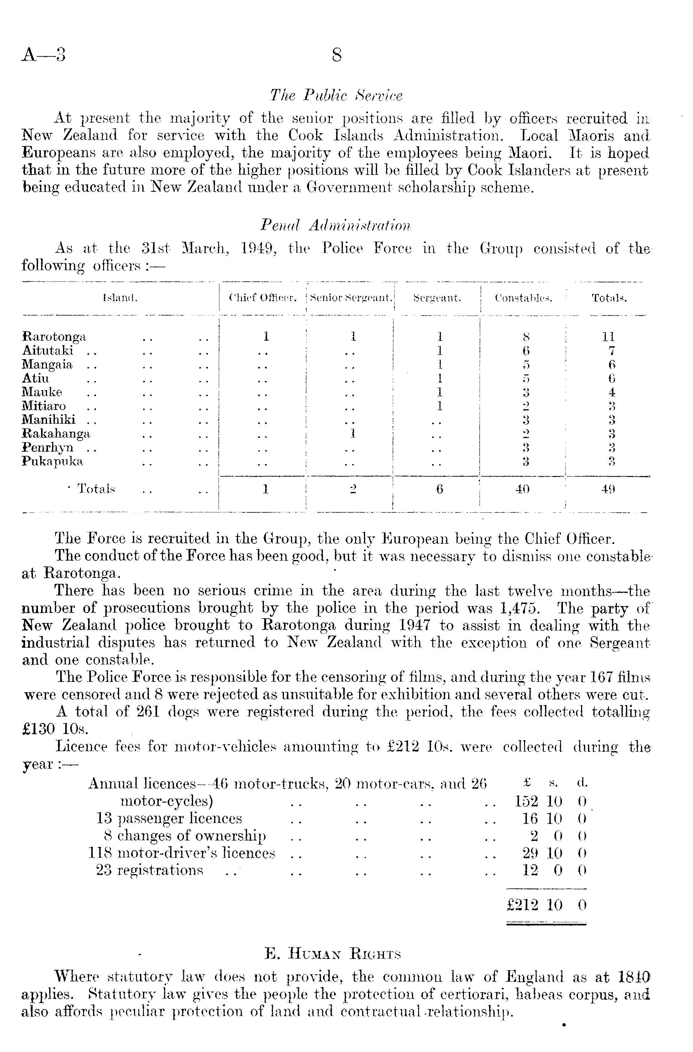 The Force is recruited in the Group, the only European being the Chief Officer. The conduct of the Force has been good, but it was necessary to dismiss one constable at Raro tonga. There has been no serious crime in the area during the last twelve months—the number of prosecutions brought by the police in the period was 1,475. The party of New Zealand police brought to Rarotonga during 1947 to assist in dealing with the industrial disputes has returned to New Zealand with the exception of one Sergeant and one constable. The Police Force is responsible for the censoring of films, and during the year 167 films were censored and 8 were rejected as unsuitable for exhibition and several others were cut. A total of 261 dogs were registered during the period, the fees collected totalling £l3O 10s. Licence fees for motor-vehicles amounting to £212 10s. were collected during theyear : Annual licences —46 motor-trucks, 20 motor-cars, and 26 £ s. d. motor-cycles) .. .. .. .. 152 10 0 13 passenger licences .. .. .. .. 16 10 0 8 changes of ownership .. .. .. .. 2 0 0 118 motor-driver's licences .. .. .. .. 29 10 0 * 23 registrations .. .. .. .. .. 12 0 0 £212 10 0 E. Human Rights Where statutory law does not provide, the common law of England as at 1840 applies. Statutory law gives the people the protection of certiorari, habeas corpus, and also affords peculiar protection of land and contractual -relationship.