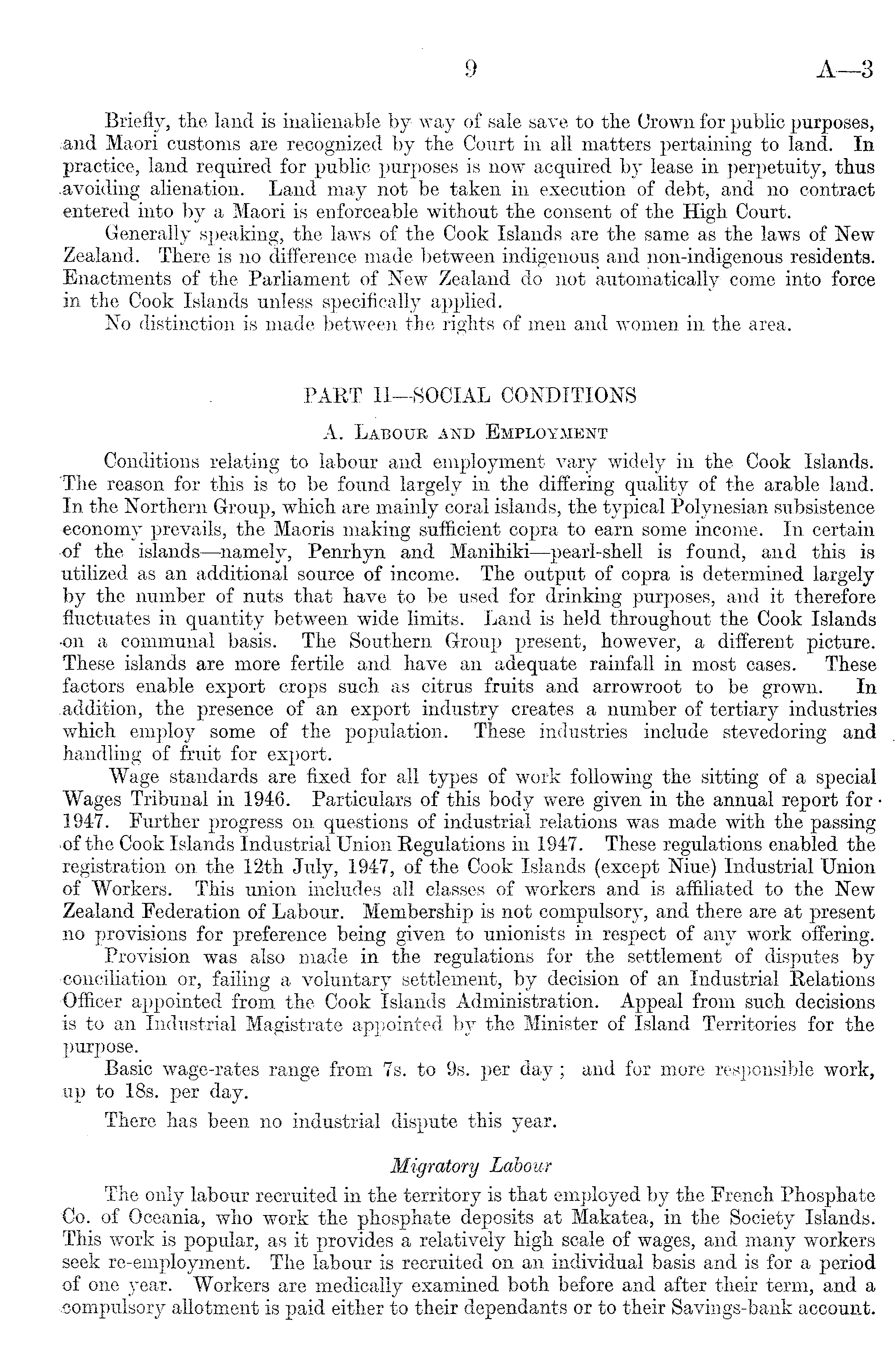 Briefly, the land is inalienable by way of sale save to the Crown for public purposes, .and Maori customs are recognized by the Court in all matters pertaining to land. In practice, land required for public purposes is now acquired by lease in perpetuity, thus .avoiding alienation. Land may not be taken in execution of debt, and no contract entered into by a Maori is enforceable without the consent of the High Court. Generally speaking, the laws of the Cook Islands are the same as the laws of New Zealand. There is no difference made between indigenous and non-indigenous residents. Enactments of the Parliament of New Zealand do not automatically come into force in the Cook Islands unless specifically applied. No distinction is made between the rights of men and women in the area. PART lI—SOCIAL CONDITIONS A. Labour and Employment Conditions relating to labour and employment vary widely in the Cook Islands. "The reason for this is to be found largely in the differing quality of the arable land. In the Northern Group, which are mainly coral islands, the typical Polynesian subsistence -economy prevails, the Maoris making sufficient copra to earn some income. In certain -of the islands—namely, Penrhyn and Manihiki—pearl-shell is found, and this is utilized as an additional source of income. The output of copra is determined largely by the number of nuts that have to be used for drinking purposes, and it therefore fluctuates in quantity between wide limits. Land is held throughout the Cook Islands •on a communal basis. The Southern Group present, however, a different picture. These islands are more fertile and have an adequate rainfall in most cases. These factors enable export crops such as citrus fruits and arrowroot to be grown. In .addition, the presence of an export industry creates a number of tertiary industries which employ some of the population. These industries include stevedoring and handling of fruit for export. Wage standards are fixed for all types of work following the sitting of a special Wages Tribunal in 1946. Particulars of this body were given in the annual report for 1947. Further progress on questions of industrial relations was made with the passing •of the Cook Islands Industrial Union Regulations in 1947. These regulations enabled the registration on the 12th July, 1947, of the Cook Islands (except Niue) Industrial Union of Workers. This union includes all classes of workers and is affiliated to the New Zealand Federation of Labour. Membership is not compulsory, and there are at present no provisions for preference being given to unionists in respect of any work offering. Provision was also made in the regulations for the settlement of disputes by •conciliation or, failing a voluntary settlement, by decision of an Industrial Relations ■Officer appointed from the Cook Islands Administration. Appeal from such decisions is to an Industrial Magistrate appointed by the Minister of Island Territories for the purpose. Basic wage-rates range from 7s. to 9s. per day; and for more responsible work, up to 18s. per day. There has been no industrial dispute this year. V Migratory Labour The only labour recruited in the territory is that employed by the French Phosphate •Co. of Oceania, who work the phosphate deposits at Makatea, in the Society Islands. This work is popular, as it provides a relatively high scale of wages, and many workers seek re-employment. The labour is recruited on an individual basis and is for a period of one year. Workers are medically examined both before and after their term, and a •compulsory allotment is paid either to their dependants or to their Savings-bank account.