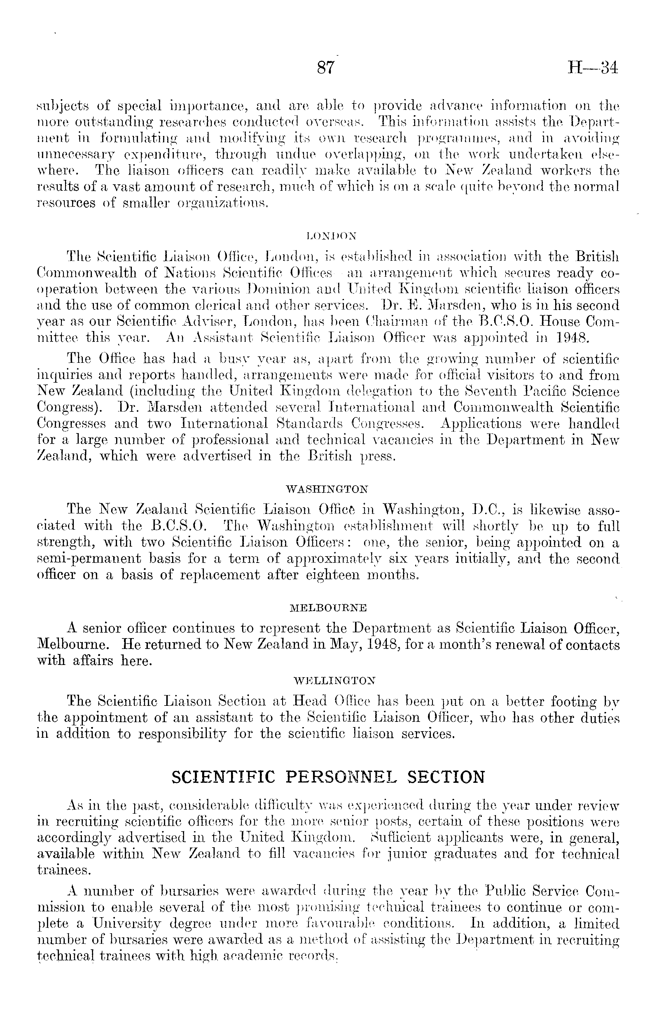 subjects of special importance, and are able to provide advance information on the more outstanding researches conducted overseas. This information assists the Department in formulating and modifying its own research programmes, and in avoiding unnecessary expenditure, through undue overlapping, on the work undertaken elsewhere. The liaison officers can readily make available to New Zealand workers the results of a vast amount of research, much of which is on a scale quite beyond the normal resources of smaller organizations. LONDON The Scientific Liaison Office, London, is established in association with the British Commonwealth of Nations Scientific Offices —an arrangement which secures ready cooperation between the various Dominion and United Kingdom scientific liaison officers and the use of common clerical and other services. Dr. E. Marsden, who is in his second year as our Scientific Adviser, London, has been Chairman of the 8.C.5.0. House Committee this year. An Assistant Scientific Liaison Officer was appointed in i 948. The Office has had a busy year as, apart from the growing number of scientific inquiries and reports handled, arrangements were made for official visitors to and from New Zealand (including the United Kingdom delegation to the Seventh Pacific Science Congress). Dr. Marsden attended several International and Commonwealth Scientific Congresses and two International Standards Congresses. Applications were handled for a large number of professional and technical vacancies in the Department in New Zealand, which were advertised in the British press. WASHINGTON The New Zealand Scientific Liaison Office in Washington, D.C., is likewise associated with the 8.C.5.0. The Washington establishment will shortly be up to full strength, with two Scientific Liaison Officers: one, the senior, being appointed on a semi-permanent basis for a term of approximately six years initially, and the second officer on a basis of replacement after eighteen months. MELBOURNE A senior officer continues to represent the Department as Scientific Liaison Officer, Melbourne. He returned to New Zealand in May, 1948, for a month's renewal of contacts with affairs here. WELLINGTON The Scientific Liaison Section at Head Office has been put on a better footing by the appointment of an assistant to the Scientific Liaison Officer, who has other duties in addition to responsibility for the scientific liaison services. SCIENTIFIC PERSONNEL SECTION As in the past, considerable difficulty was experienced during the year under review in recruiting scientific officers for the more senior posts, certain of these positions were accordingly advertised in the United Kingdom. Sufficient applicants were, in general, available within New Zealand to fill vacancies for junior graduates and for technical trainees. A number of bursaries were awarded during the year by the Public Service Commission to enable several of the most promising technical trainees to continue or complete a University degree under more favourable conditions. In addition, a limited number of bursaries were awarded as a method of assisting the Department in recruiting technical trainees with high academic records.