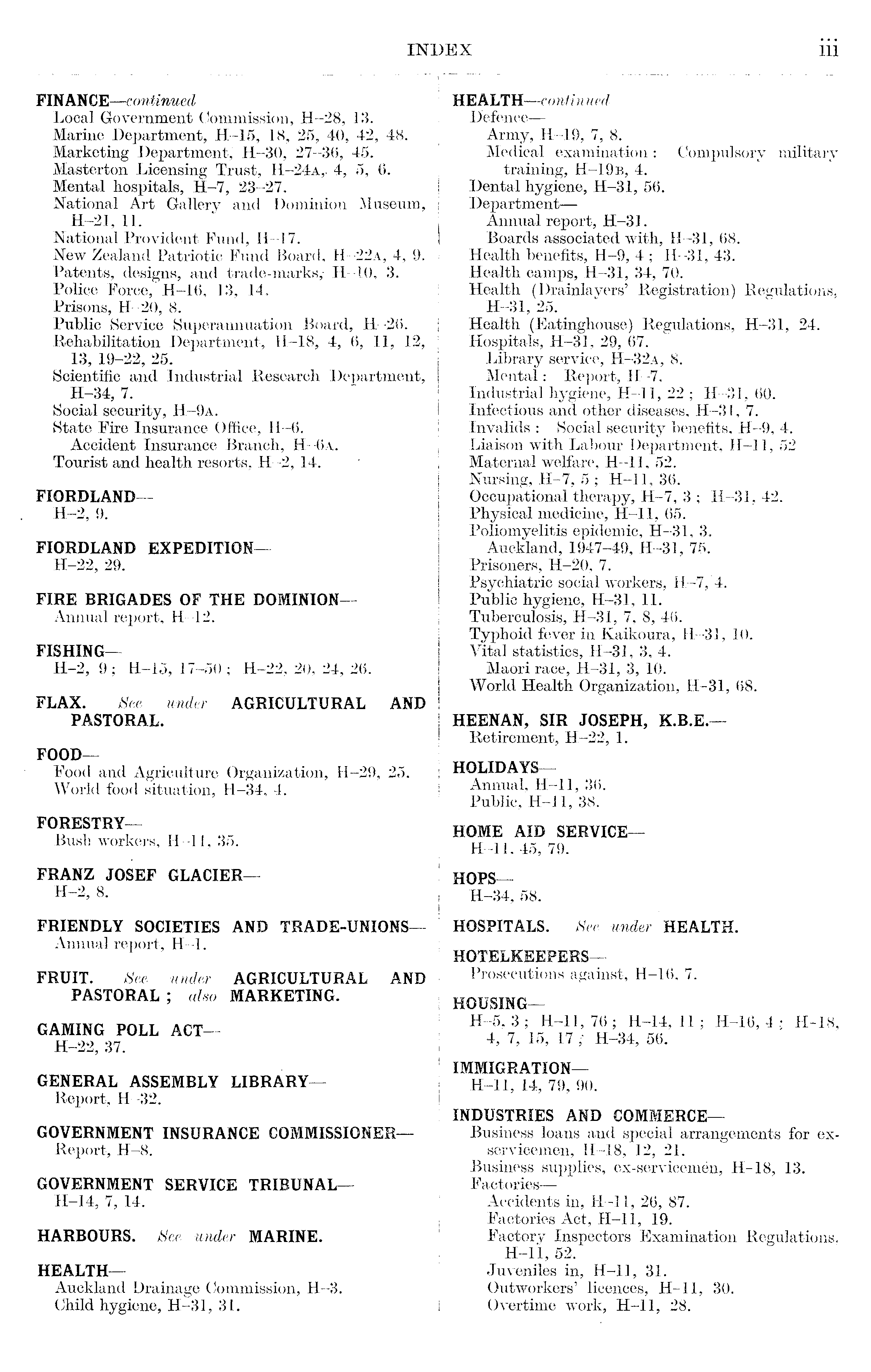 FlNANCE— continued Local Government Commission, H-28, 13. Marine Department, H-15, 18, 25, 40, 42, 48. Marketing Department, H-30, 27-36, 45. Masterton Licensing Trust, H-24a,. 4, 5, 6. Mental hospitals, H-7, 23-27. National Art Gallery and Dominion Museum, H-21, 11. National Provident Fund, H-17. New Zealand Patriotic Fund Board, H-22a, 4, 9. Patents, designs, and trade-marks,- H--H), 3. Police Force, H-16, 13, 14. Prisons, H-20, 8. Public Service Superannuation Board, H-2(5. Rehabilitation Department, H-18, 4, 6, 11, 12, 13, 19-22, 25. Scientific and Industrial Research Department, H-34, 7. Social security, H-9a. State Fire Insurance Office, H-6. Accident Insurance Branch, H-6a. Tourist and health resorts, H-2, 14. FIORDLAND— H-2, 9. FIORDLAND EXPEDITION— H-22, 29. FIRE BRIGADES OF THE DOMINION— Annual report, H-12. FISHING— H-2, 9 ; H-10, 17-50 ; H-22, 20, 24, 26. FLAX. See under AGRICULTURAL AND PASTORAL. FOOD— Food and Agriculture Organization, H-29, 25. World food situation, H-34, 4. FORESTRY— Bush workers, H-11, 35. FRANZ JOSEF GLACIER— H-2, 8. FRIENDLY SOCIETIES AND TRADE-UNIONS— Annual report, H-l. FRUIT. See under AGRICULTURAL AND PASTORAL ; also MARKETING. GAMING POLL ACT— H-22, 37. GENERAL ASSEMBLY LIBRARY— Report, H-32. GOVERNMENT INSURANCE COMMISSIONER— Report, H-8. GOVERNMENT SERVICE TRIBUNAL— H-14, 7, 14. HARBOURS. .See under MARINE. HEALTH— Auckland Drainage Commission, H-3. Child hygiene, H-31, 31.