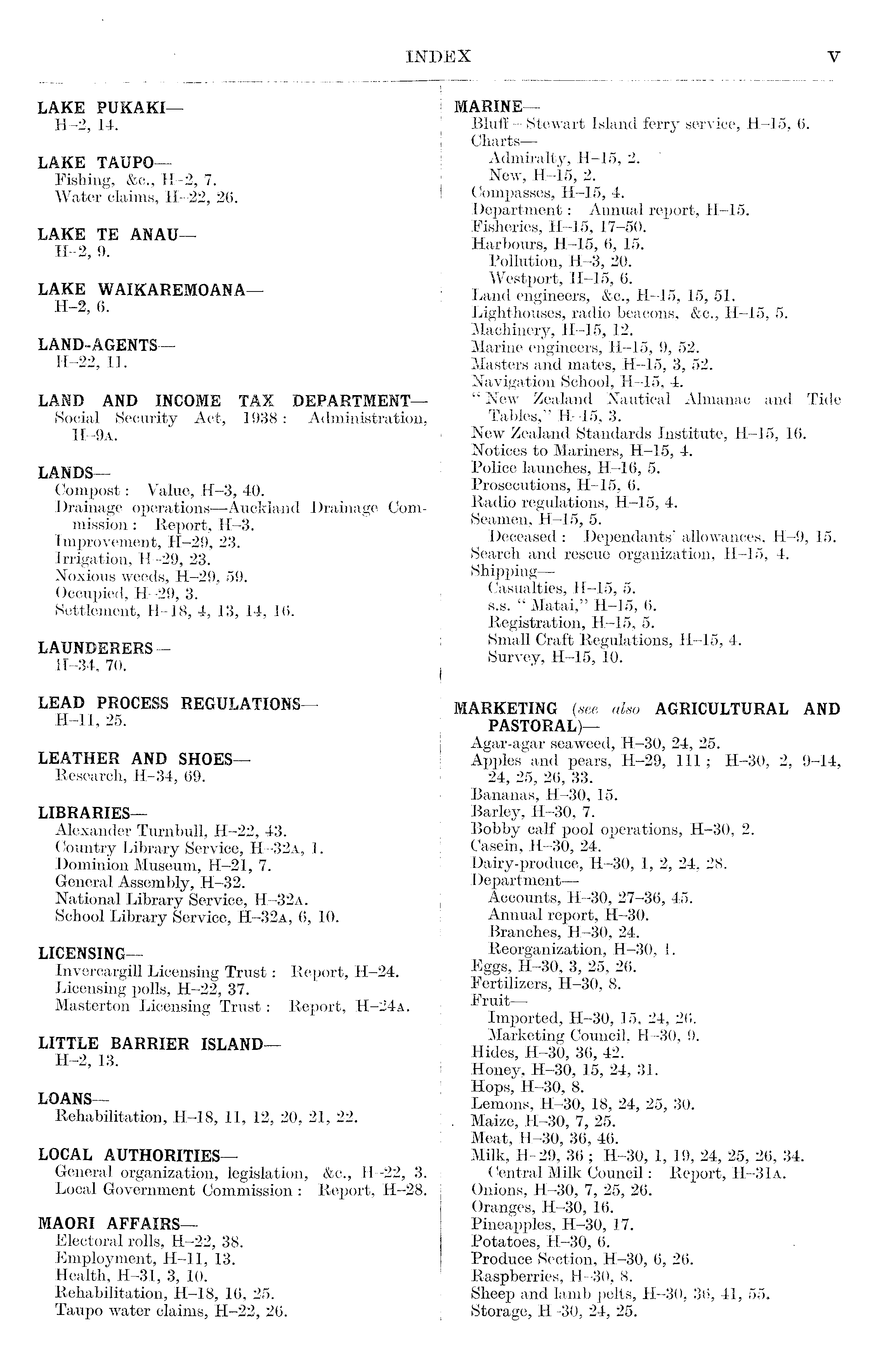 LAKE PUKAKI— H-2, 14. LAKE TAUPO— Fishing, &c, H-2, 7. Water claims, H-22, 26. LAKE TE ANAU— H-2, 9. LAKE WAIKAREMOANA— H-2, 6. LAND-AGENTS— H-22, 11. LAND AND INCOME TAX DEPARTMENT— Social Security Act, 1938: Administration, H-9a. LANDS— Compost: Value, H-3, 40. Drainage operations—Auckland Drainage Commission : Report, H-3. Improvement, H-29, 23. Irrigation, H-29, 23. Noxious weeds, H-29, 59. Occupied, H-29, 3. Settlement, H-18, 4, 13, 14, 16. LAUNDERERS— H-34, 70. LEAD PROCESS REGULATIONS— H-11, 25. LEATHER AND SHOES— Research, H-34, 69. LIBRARIES— Alexander Turnbull, H-22, 43. Country Library Service, H-32a, 1. Dominion Museum, H-21, 7. General Assembly, H-32. National Library Service, H-32a. School Library Service, H-32a, 6, 10. LICENSING— Invercargill Licensing Trust: Report, H-24. Licensing polls, H-22, 37. Masterton Licensing Trust: Report, H-24a. LITTLE BARRIER ISLAND— H-2, 13. LOANS— Rehabilitation, H-18, 11, 12, 20, 21, 22. LOCAL AUTHORITIES— General organization, legislation, &c, H-22, 3. Local Government Commission : Report, H-28. MAORI AFFAIRS— Electoral rolls, H-22, 38. Employment, H-11, 13. Health, H-31, 3, 10. Rehabilitation, H-18, 16, 25. Taupo water claims, H-22, 26.
