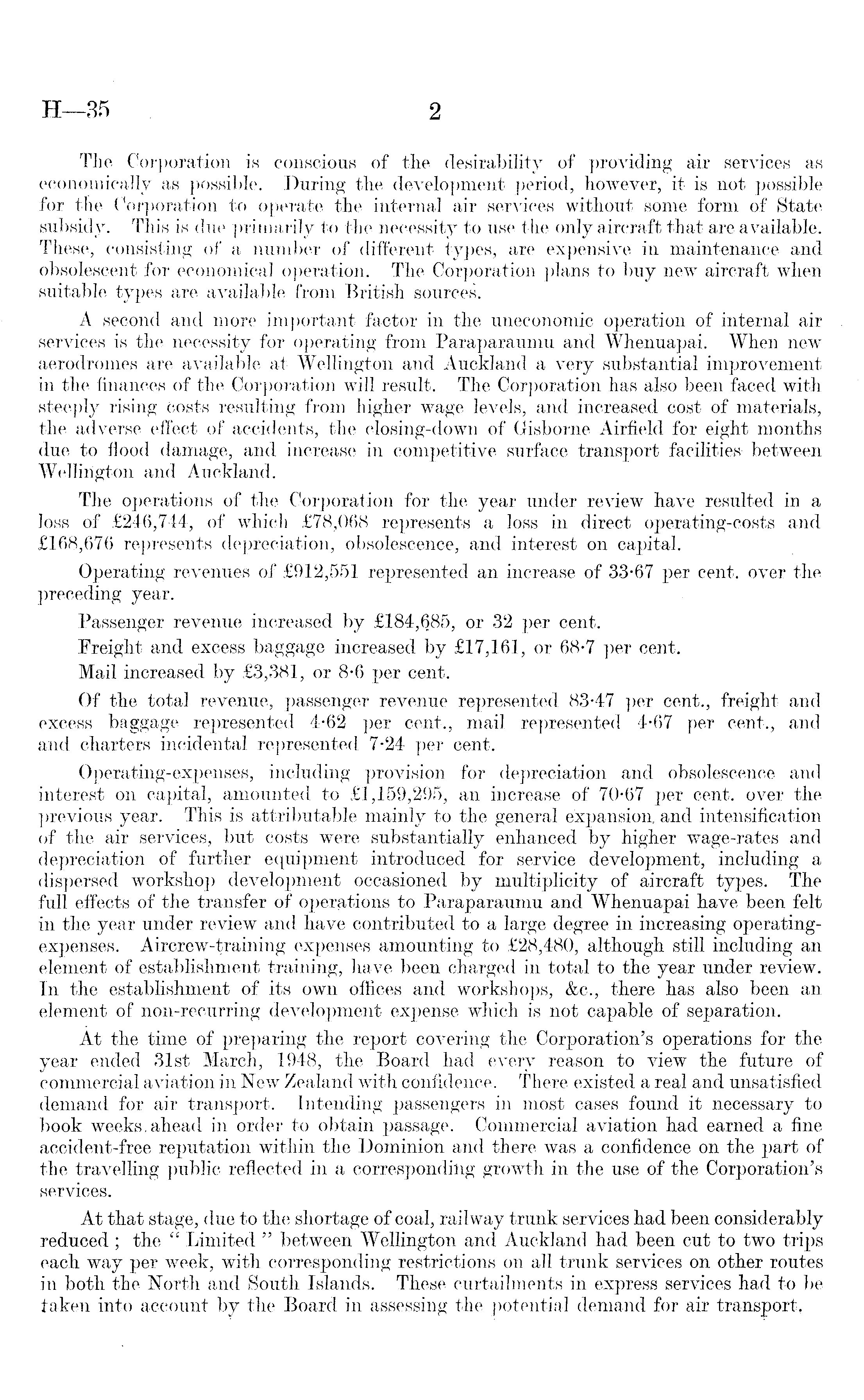 The Corporation is conscious of the desirability of providing air services as economically as possible. During the development period, however, it is not possible for the Corporation to operate the internal air services without some form of State subsidy. This is due primarily to the necessity to use the only aircraft that are available. These, consisting of a number of different types, are expensive in maintenance and obsolescent for economical operation. The Corporation plans to buy new aircraft when suitable types are available from British sources. A second and more important factor in the uneconomic operation of internal air services is the necessity for operating from Paraparaumu and Whenuapai. When new aerodromes are available at Wellington and Auckland a very substantial improvement in the finances of the Corporation will result. The Corporation has also been faced with steeply rising costs resulting from higher wage levels, and increased cost of materials, the adverse effect of accidents, the closing-down of Gisborne Airfield for eight months due to flood damage, and increase in competitive surface transport facilities between Wellington and Auckland. The operations of the Corporation for the year under review have resulted in a loss of £246,744, of which £78,068 represents a loss in direct operating-costs and £168,676 represents depreciation, obsolescence, and interest on capital. Operating revenues of £912,551 represented an increase of 33-67 per cent, over the preceding year. Passenger revenue increased by £184,685, or 32 per cent. Freight and excess baggage increased by £17,161, or 68-7 per cent. Mail increased by £3,381, or 8-6 per cent. Of the total revenue, passenger revenue represented 83-47 per cent., freight and excess baggage represented 4-62 per cent., mail represented 4-67 per cent., and and charters incidental represented 7-24 per cent. Operating-expenses, including provision for depreciation and obsolescence and interest on capital, amounted to £1,159,295., an increase of 70-67 per cent, over the previous year. This is attributable mainly to the general expansion, and intensification of the air services, but costs were substantially enhanced by higher wage-rates and depreciation of further equipment introduced for service development, including a dispersed workshop development occasioned by multiplicity of aircraft types. The full effects of the transfer of operations to Paraparaumu and Whenuapai have been felt in the year under review and have contributed to a large degree in increasing operatingexpenses. Aircrew-training expenses amounting to £28,480, although still including an element of establishment training, have been charged in total to the year under review. In the establishment of its own offices and workshops, &c, there has also been an element of non-recurring development expense which is not capable of separation. At the time of preparing the report covering the Corporation's operations for the year ended 31st March, 1948, the Board had every reason to view the future of commercial aviation in New Zealand with confidence. There existed a real and unsatisfied demand for air transport. Intending passengers in most cases found it necessary to book weeks.ahead in order to obtain passage. Commercial aviation had earned a fine accident-free reputation within the Dominion and there was a confidence on the part of the travelling public reflected in a corresponding growth in the use of the Corporation's services. At that stage, due to the shortage of coal, railway trunk services had been considerably reduced ; the " Limited " between Wellington and Auckland had been cut to two trips each way per week, with corresponding restrictions on all trunk services on other routes in both the North and South Islands. These curtailments in express services had to be taken into account by the Board in assessing the potential demand for air transport,