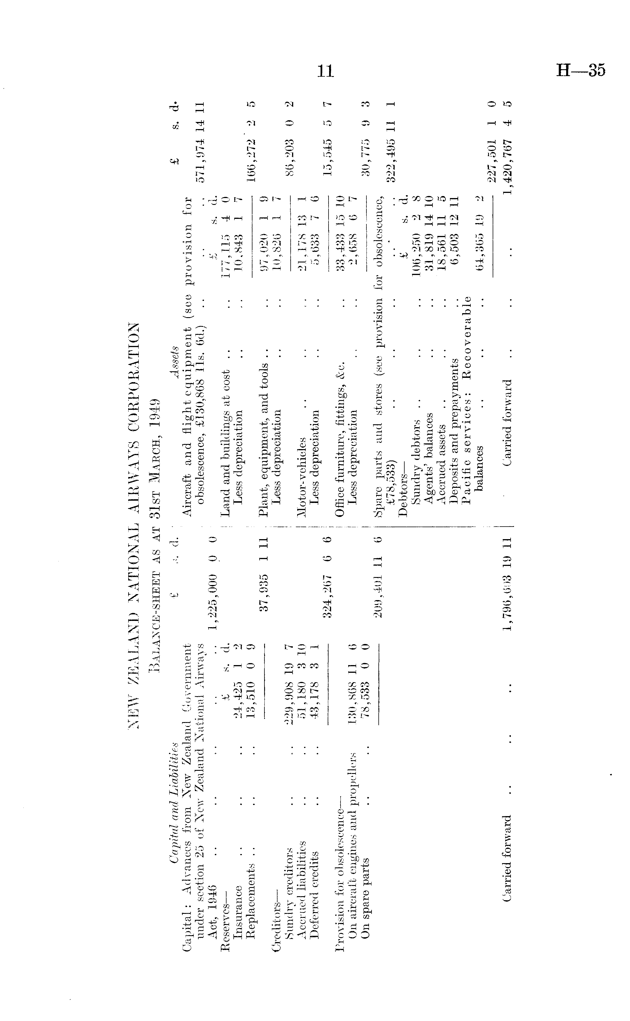 NEW ZEALAND NATIONAL AIRWAYS CORPORATION Balance-sheet as at 31st Maech, 1949 Capital and Liabilities £ s. d. | Assets £ s. d« Capital: Advances from New Zealand Government ! Aircraft and flight equipment (see provision for under section 25 of New Zealand National Airways obsolescence, £130,868 lis. 6d.) .. .. .. 571,974 14 11 Act, 1946 .. .. .. .. .. 1,225,000 0 0 £ s. d. Reserves— £ s. d. Land and buildings at cost .. .. 177,115 4 0 Insurance .. .. .. 24,425 1 2 Less depreciation .. .. 10,843 1 7 Replacements.. .. .. 13,510 0 9 166,272 ' 2 5 37,935 111 Plant, equipment, and tools .. .. 97,020 1 9 Creditors— Less depreciation .. .. 10,826 1 7 Sundry creditors .. .. 229,908 19 7 ■ 86,203 0 2 Accrued liabilities .. .. 51,180 3 10 Motor-vehicles .. .. .. 21,178 13 1 Deferred credits .. .. 43,178 3 1 Less depreciation .. .. 5,633 7 6 324,267 6 6 15,545 5 7 Provision for obsolescence— Office furniture, fittings, &c. .. 33,433 15 10 On aircraft engines and propellers 130,868 11 6 Less depreciation .. .. 2,658 6 7 On spare parts .. .. 78,533 0 0 30,775 9 3 209,401 11 6 Spare parts and stores (see provision for obsolescence, £78,533) .. .. .. ..- .. 322,495 11 1 Debtors— £ s. d. Sundry debtors .. .. .. 106,250 2 8 Agents'balances .. .. 31,819 14 10 Accrued assets .. .. .. 18,561 11 5 Deposits and prepayments .. 6,503 12 11 Pacific services : Recoverable balances .. .. .. 64 >365 19 2 227,501 1 0 Carried forward .. .. .. 1,796,603 19 11 Carried forward .. .. .. 1,420,767 4 5